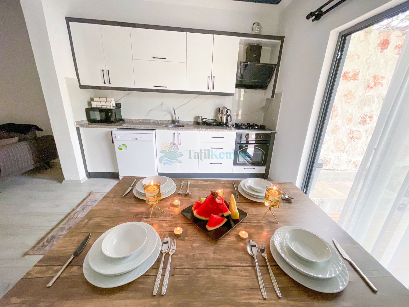 Amerikan mutfak içerisinde, buzdolabı, bulaşık makinası, çamaşır makinası, yemek masası, yemek takımı, ankastre fırın, mikrodalga fırın, tost makinası, ankastre ocak, çaydanlık, su ısıtıcısı, tava, tencere takımı ve gerekli olan tüm mutfak gereçleri yer almaktadır.