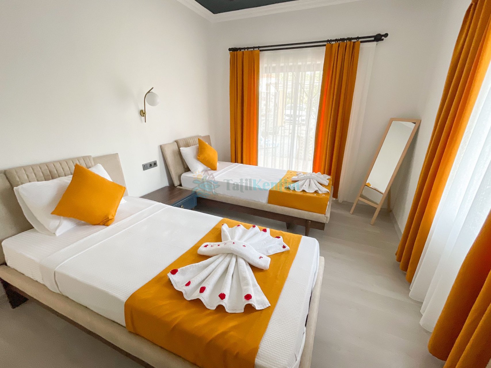 Yatak odası içerisinde, 2 adet tek kişilik yatak, klima, elbise dolabı, komodin, makyaj masası, banyo ve tuvalet yer almaktadır.