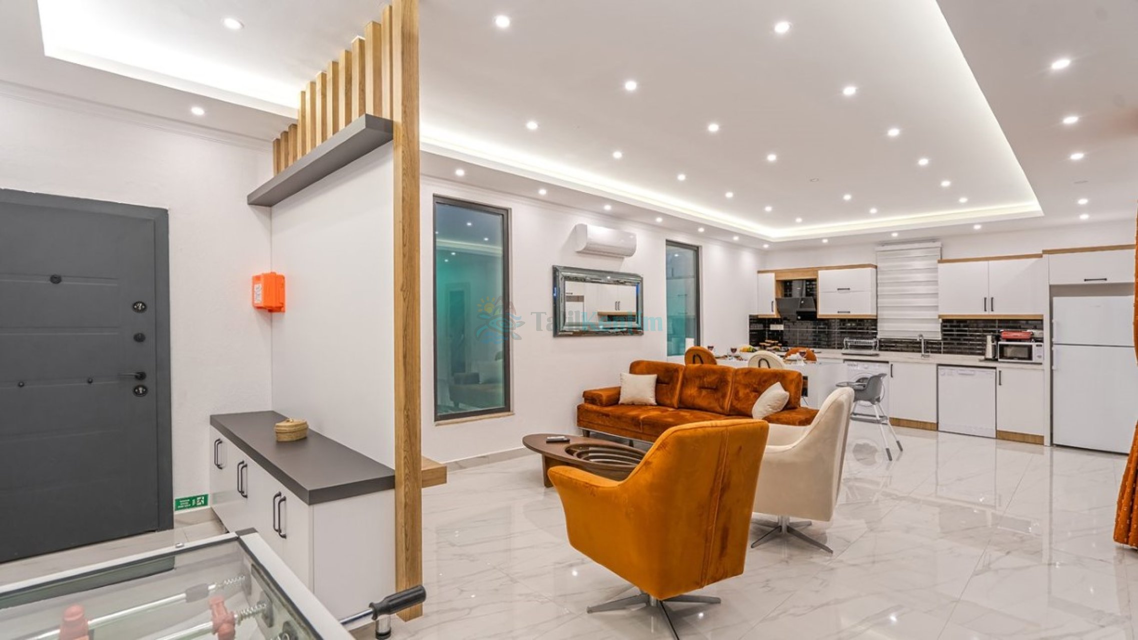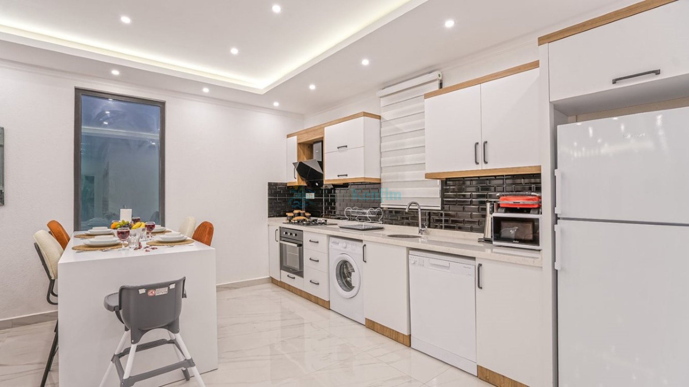 Amerikan mutfak içerisinde, buzdolabı, bulaşık makinası, çamaşır makinası, yemek masası, yemek takımı, ankastre fırın, mikrodalga fırın, tost makinası, ankastre ocak, çaydanlık, su ısıtıcısı, mama sandalyesi, tava, tencere takımı ve gerekli olan tüm mutfak gereçleri yer almaktadır.