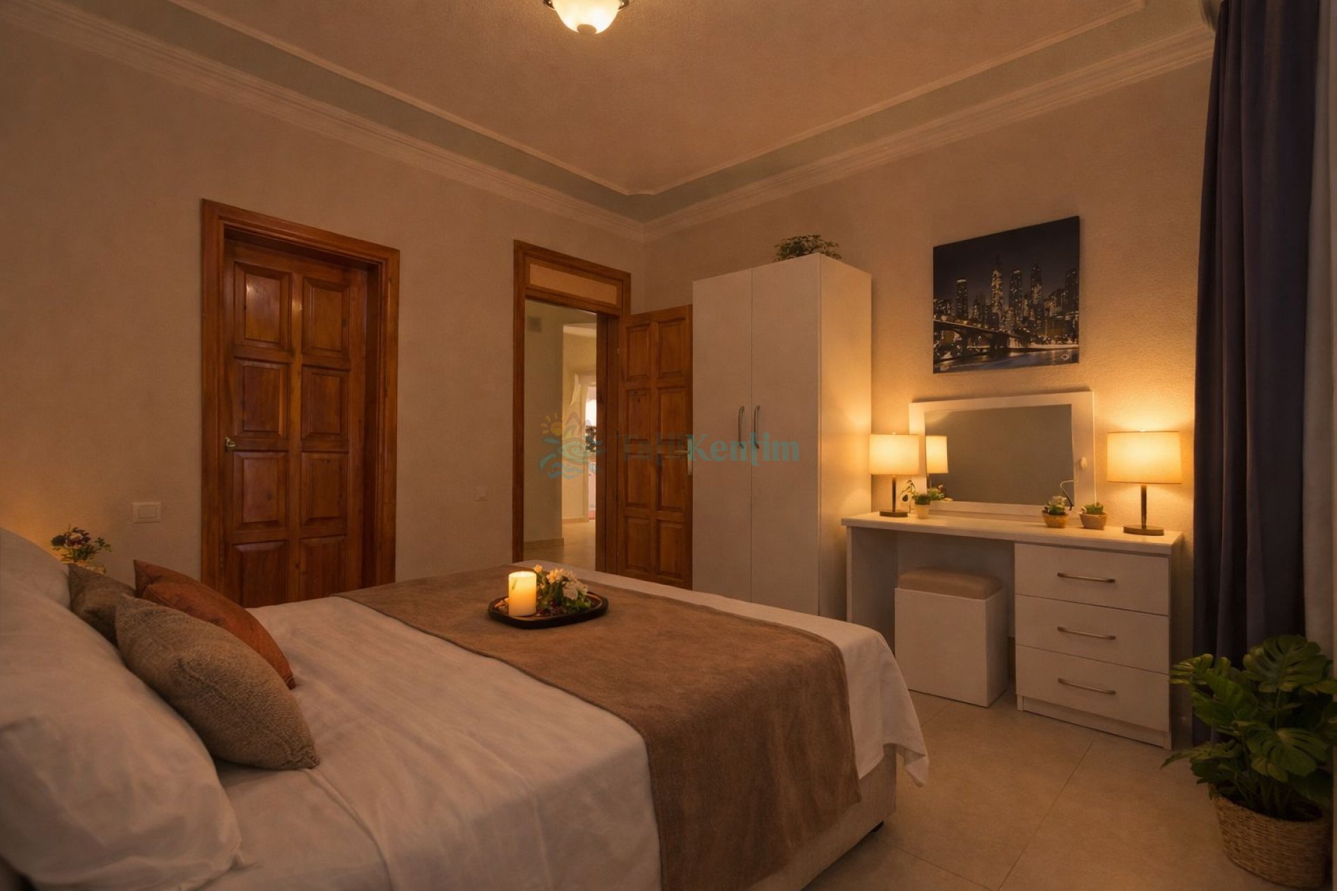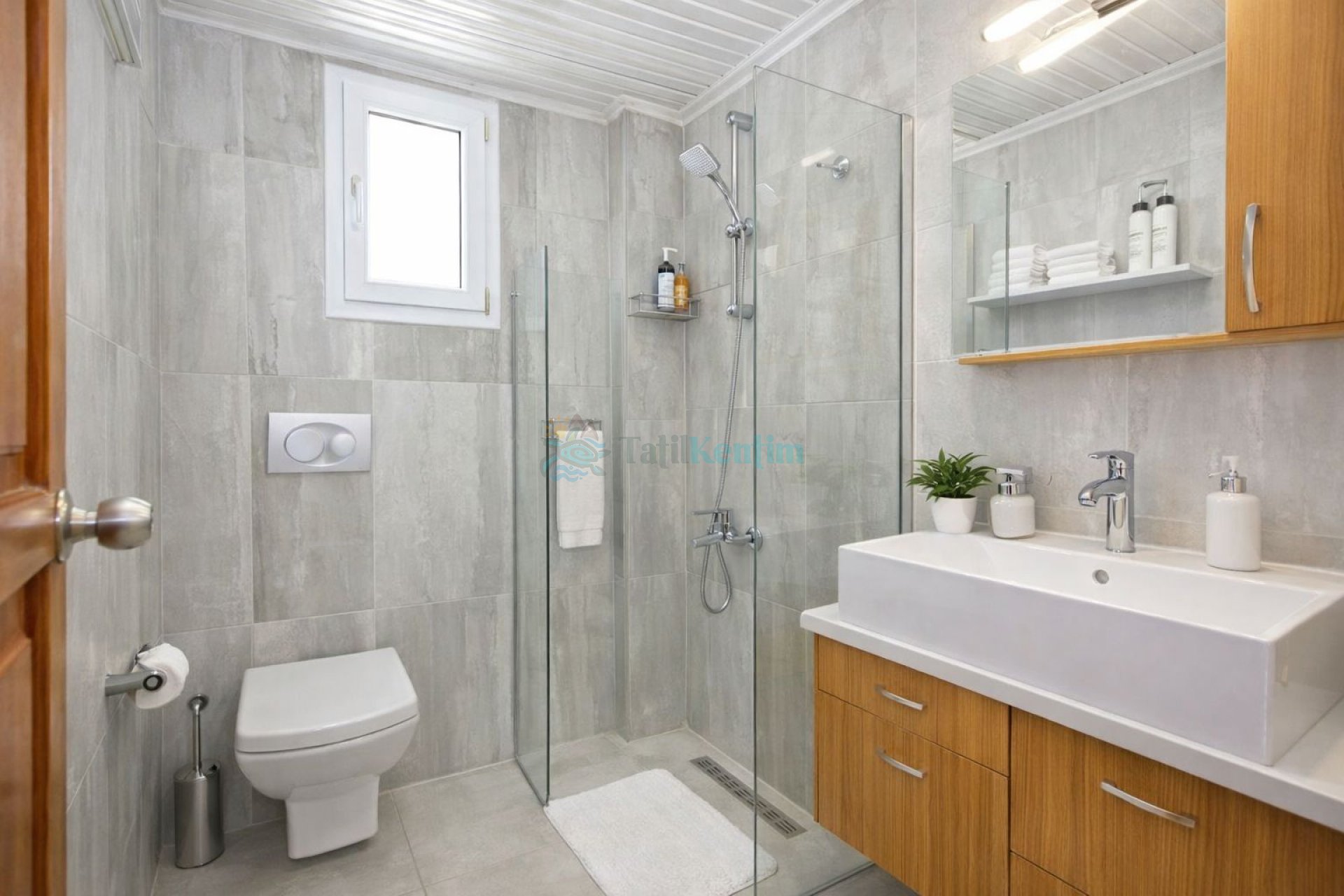 Kiralık villanın bu yatak odası içerisinde, 1 adet çift kişilik yatak, klima, komodin, banyo ve tuvalet bulunmaktadır.