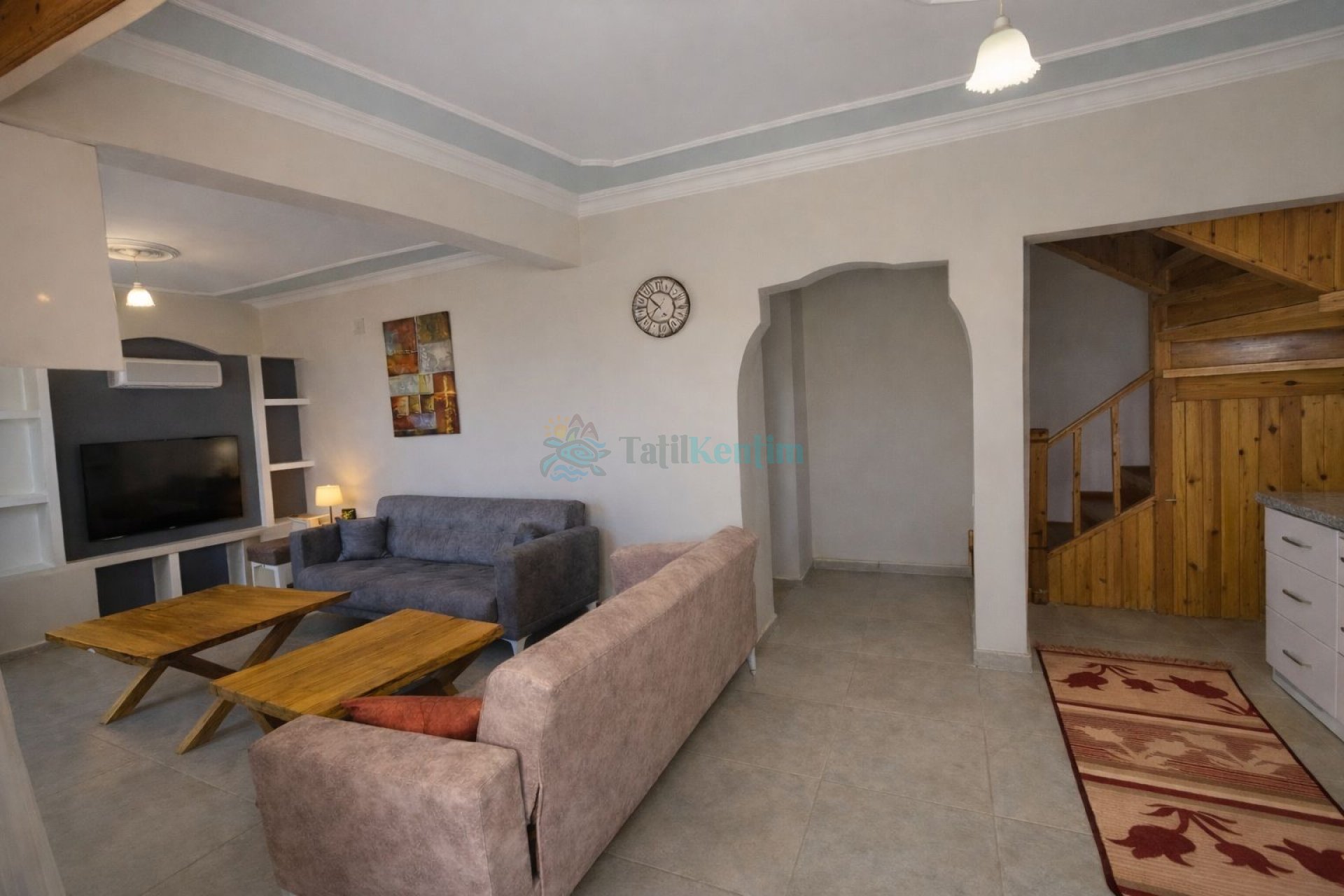 Villamızın salonu içerisinde, koltuk takımı, orta sehpa, TV, TV ünitesi, klima, uydu alıcısı yer almaktadır.