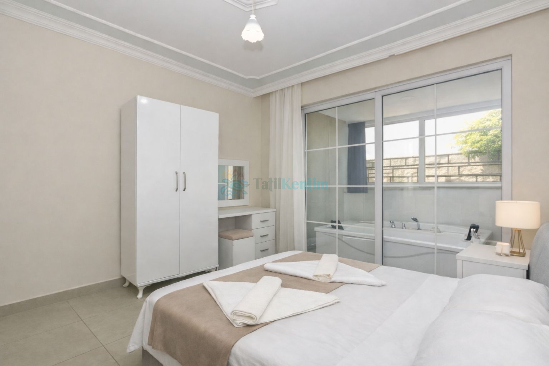 Tatil villamıza ait bu yatak odası içerisinde, 1 adet çift kişilik yatak, klima, komodin, jakuzi, banyo ve tuvalet alanları bulunmaktadır.