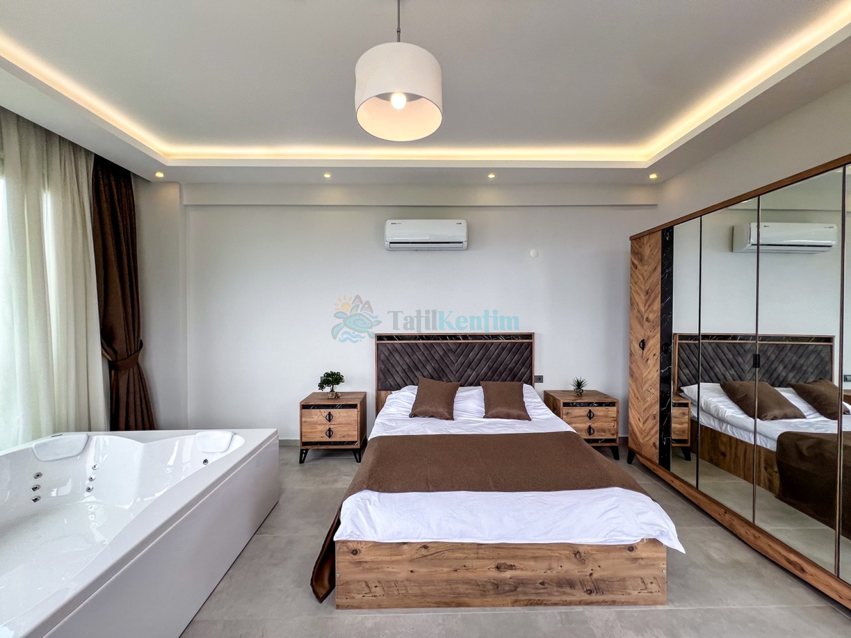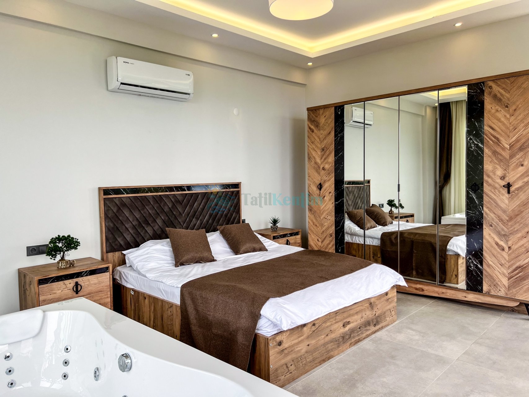 Yatak odası: Yatak odası içerisinde, 1 adet çift kişilik yatak, klima, elbise dolabı, komodin, makyaj masası, jakuzi, banyo ve tuvalet yer almaktadır.