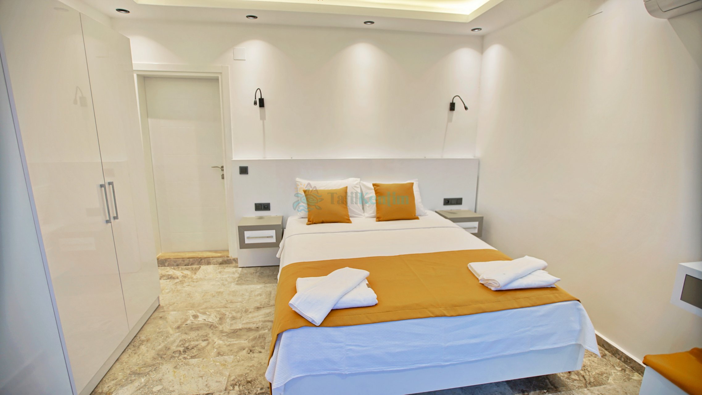 Yatak odası içerisinde, 1 adet çift kişilik yatak, klima, elbise dolabı, komodin, makyaj masası, banyo ve tuvalet yer almaktadır.