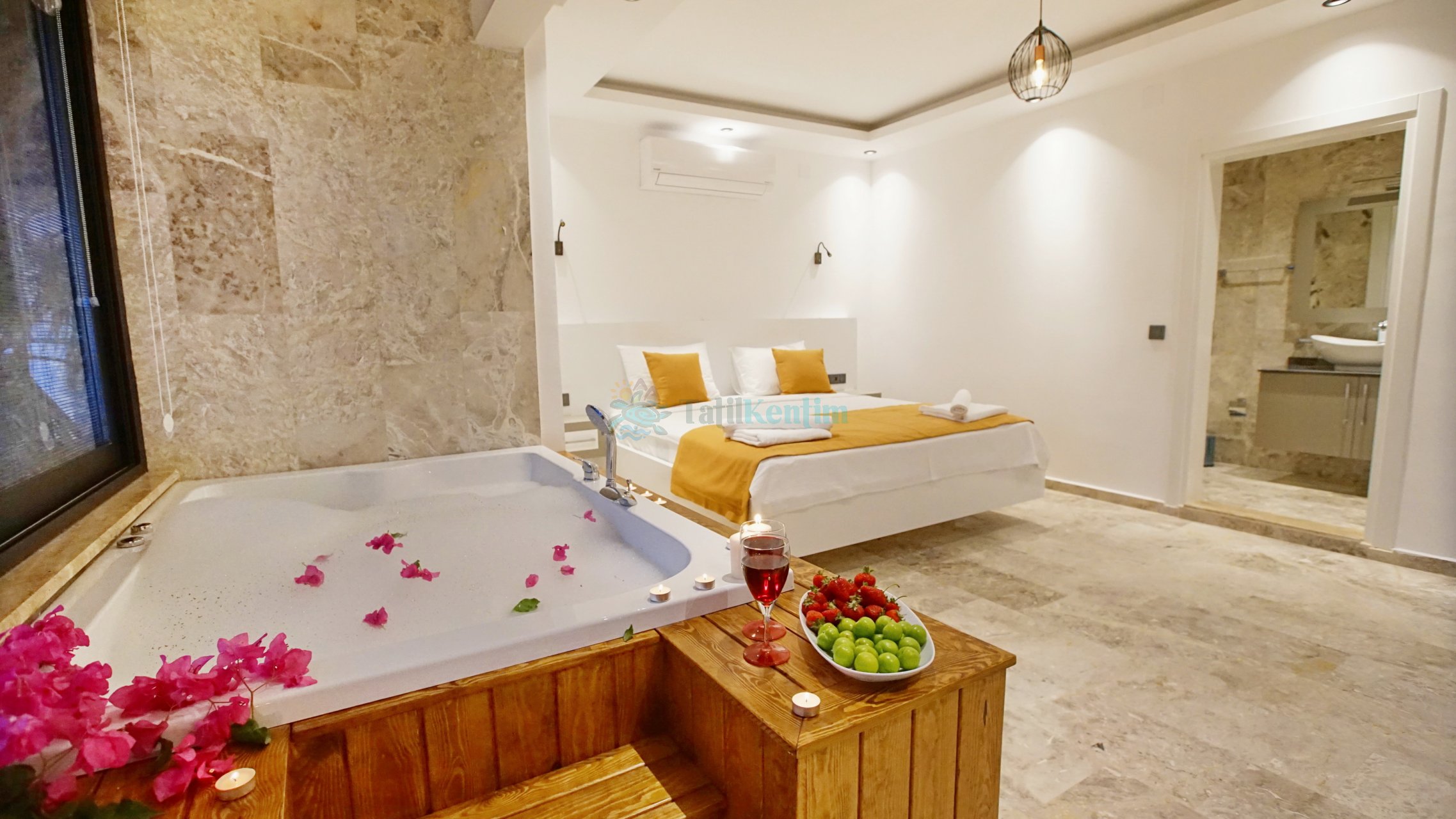 Yatak odası içerisinde, 1 adet çift kişilik yatak, klima, elbise dolabı, komodin, makyaj masası, jakuzi, banyo ve tuvalet yer almaktadır.