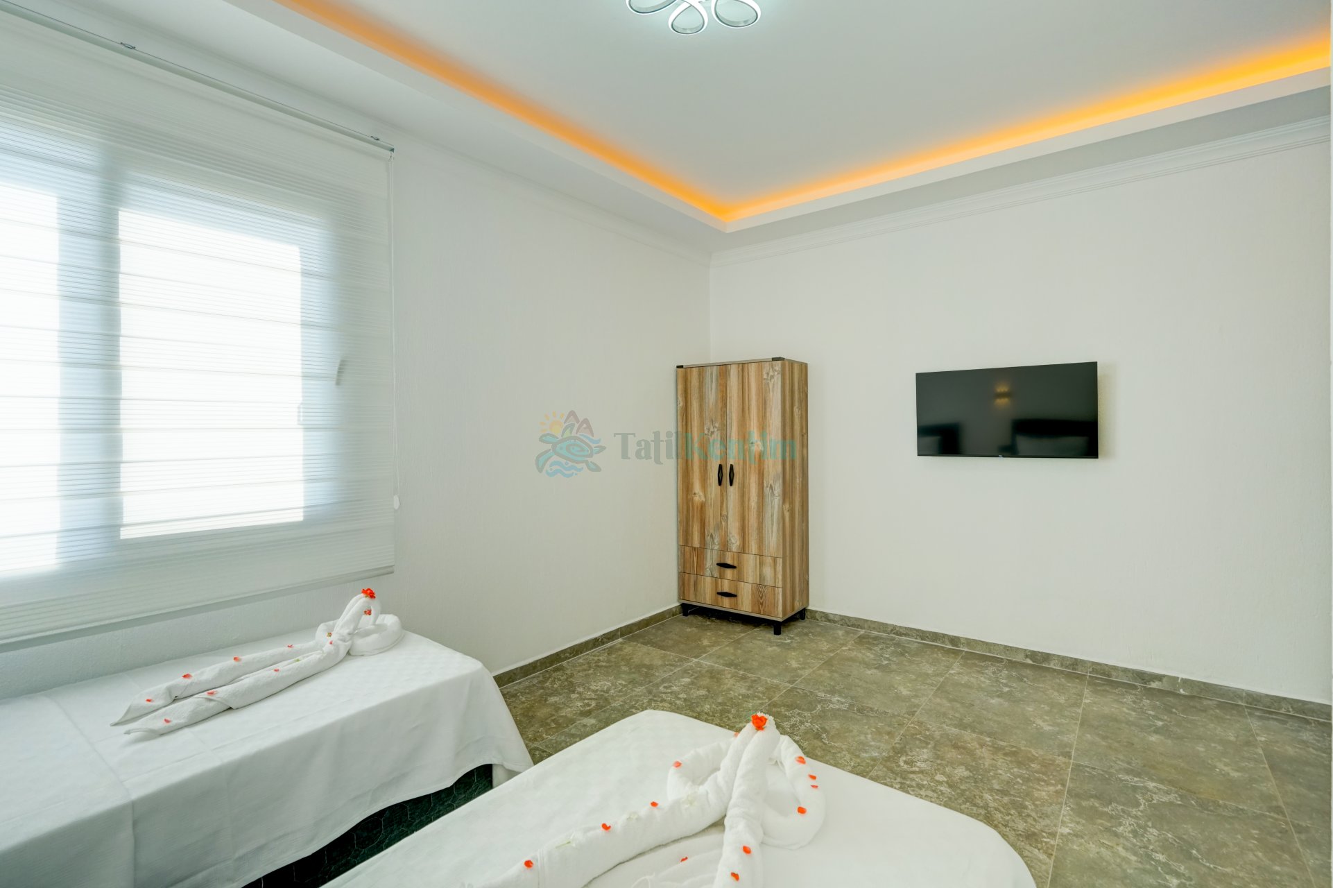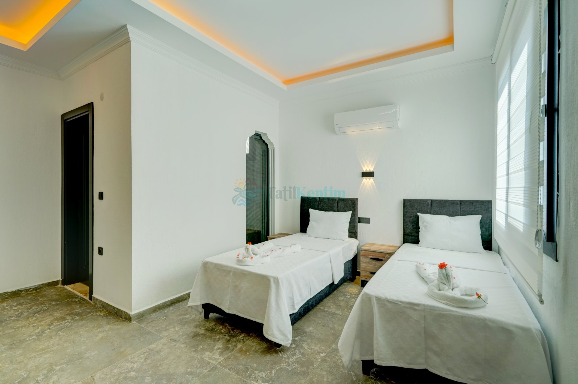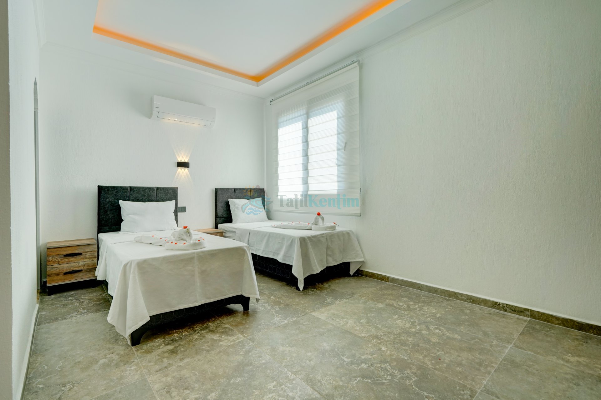Kiralik villanın bu yatak odası içerisinde, 2 adet tek kişilik yatak, klima, elbise dolabı, komodin, banyo ve tuvalet bulunmaktadır.