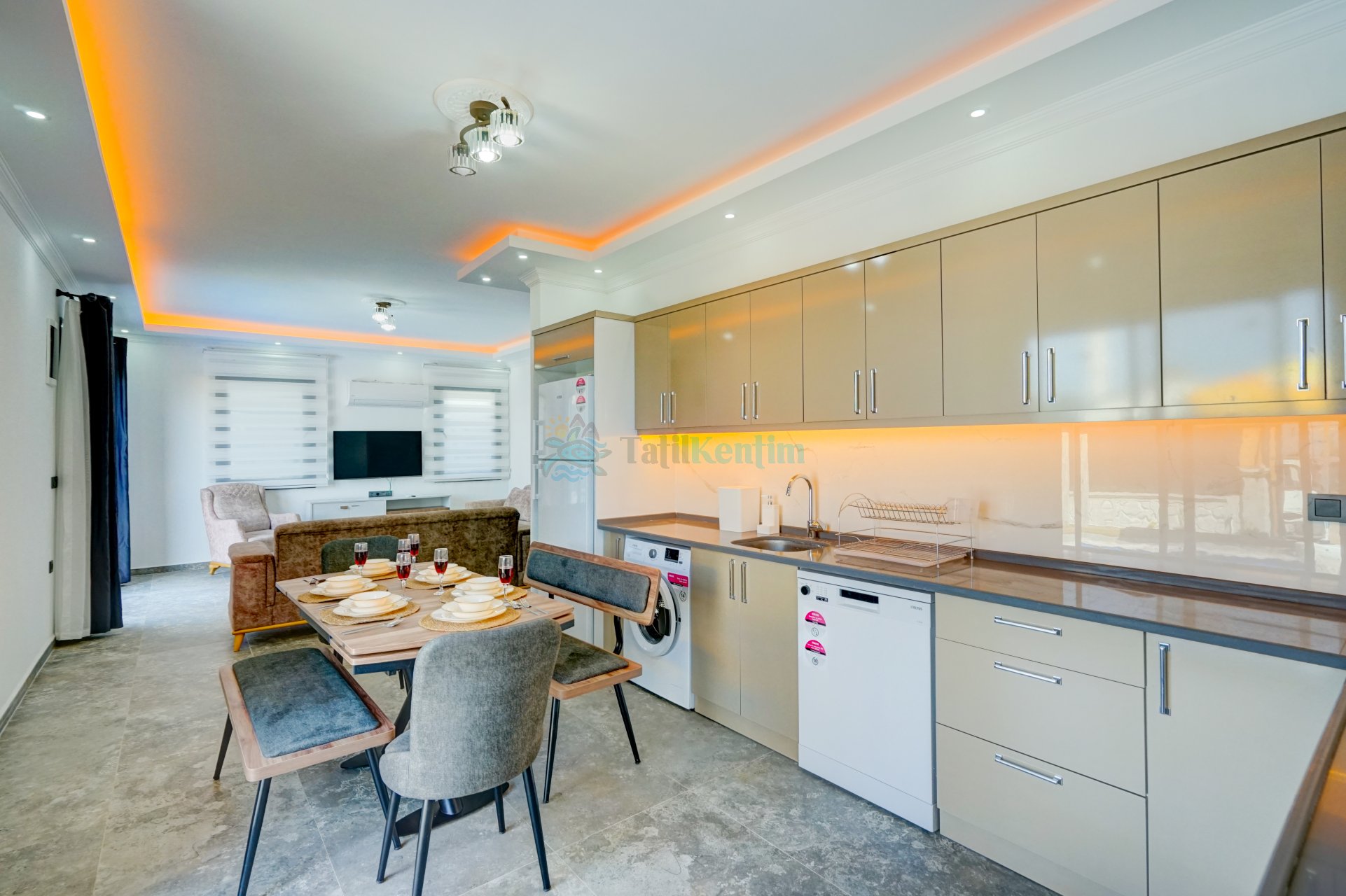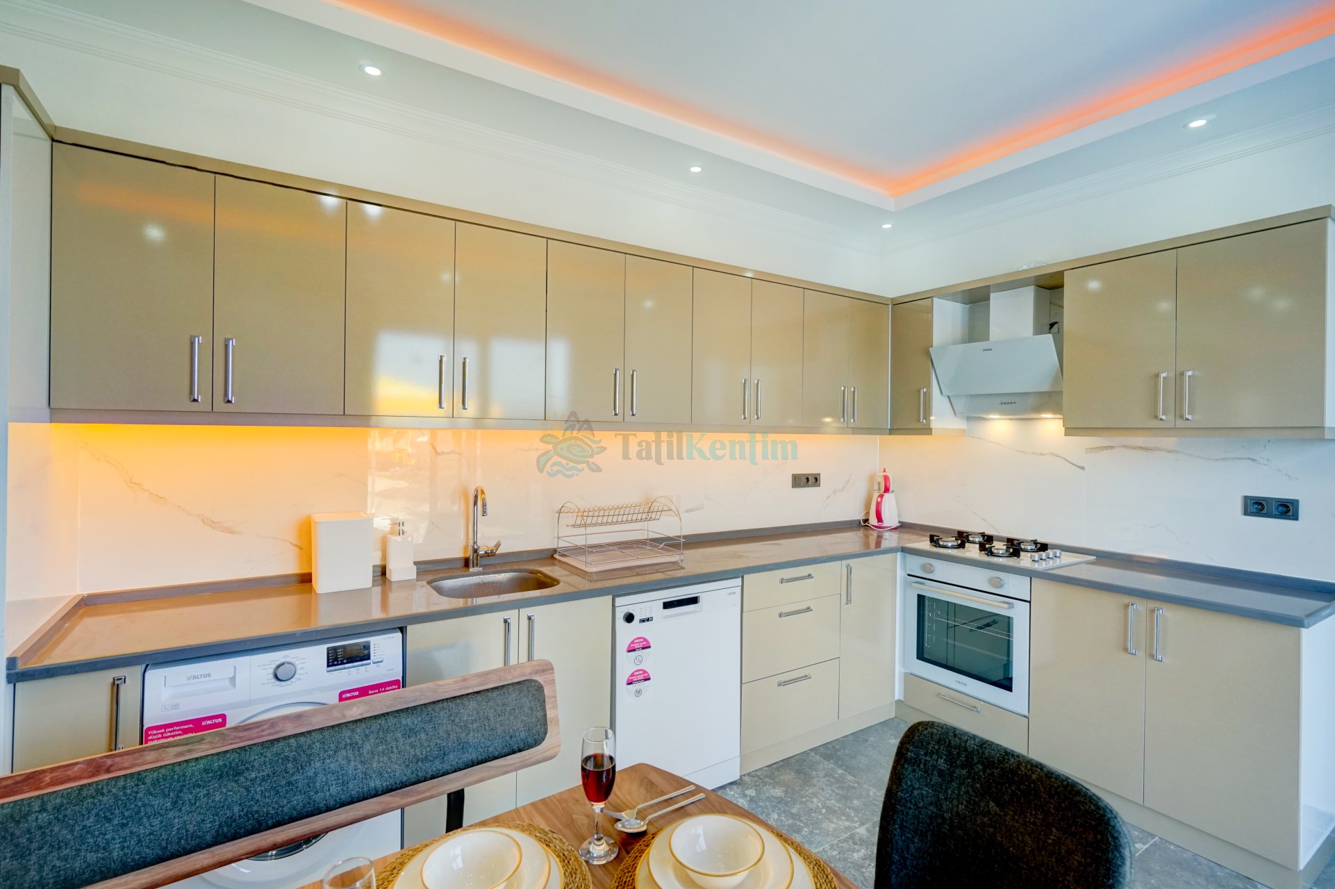 Yazlığımızın Amerikan mutfağı içerisinde, buzdolabı, bulaşık makinası, çamaşır makinası, yemek masası, yemek takımı, ankastre fırın, mikrodalga fırın, tost makinası, ankastre ocak, çaydanlık, su ısıtıcısı, tava, tencere takımı ve gerekli olan tüm mutfak gereçleri yer almaktadır.
