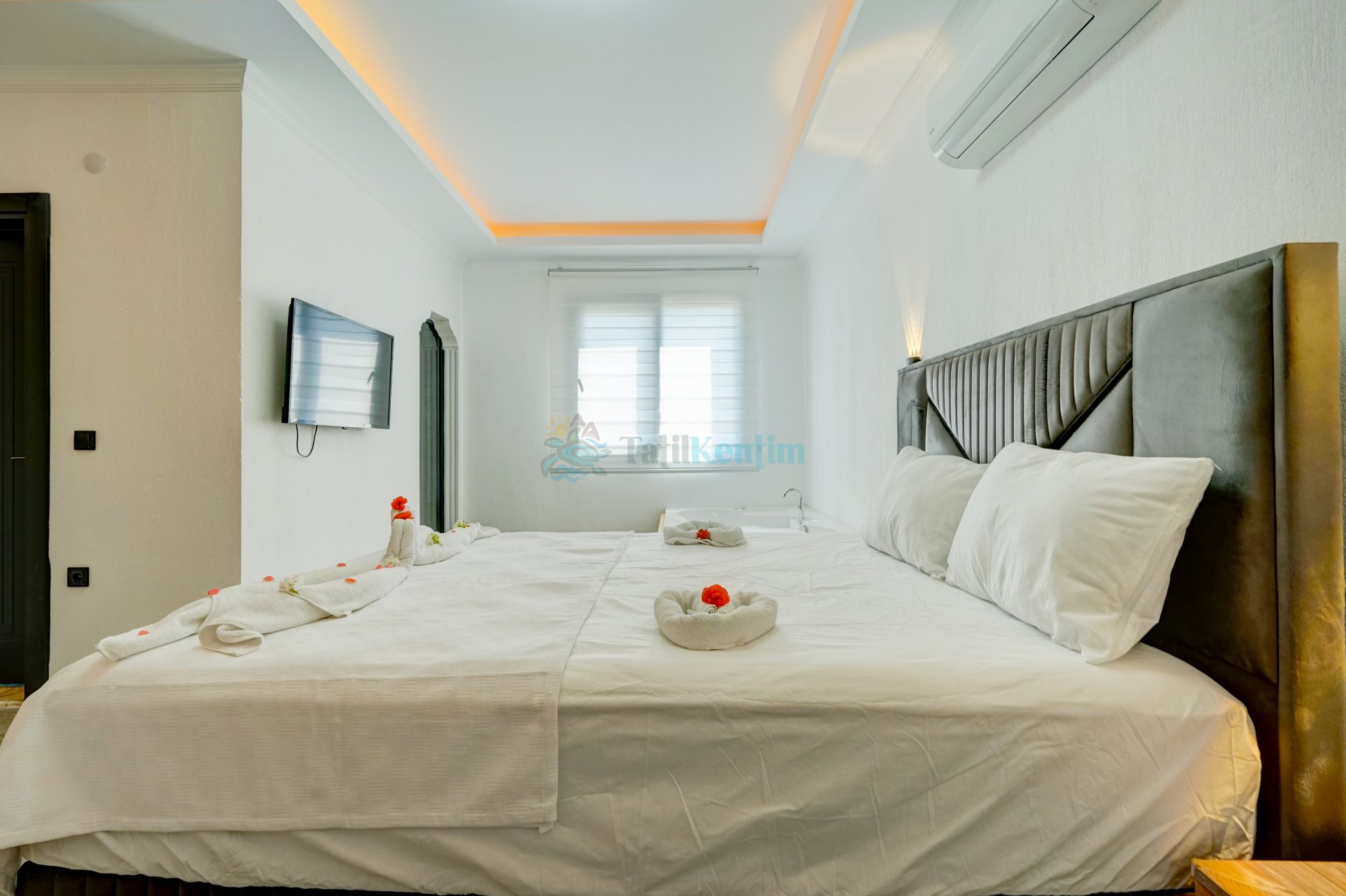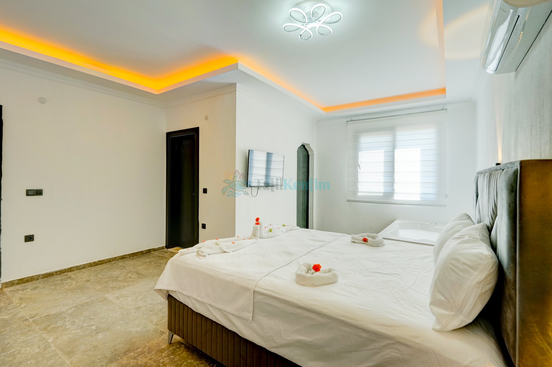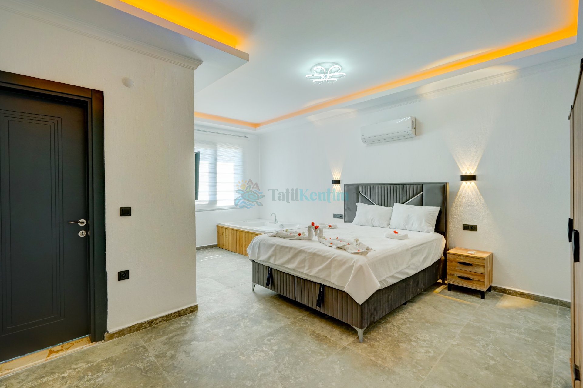 Tatil villamıza ait bu yatak odası içerisinde, 1 adet çift kişilik yatak, klima, elbise dolabı, komodin, jakuzi, banyo ve tuvalet alanları bulunmaktadır.
