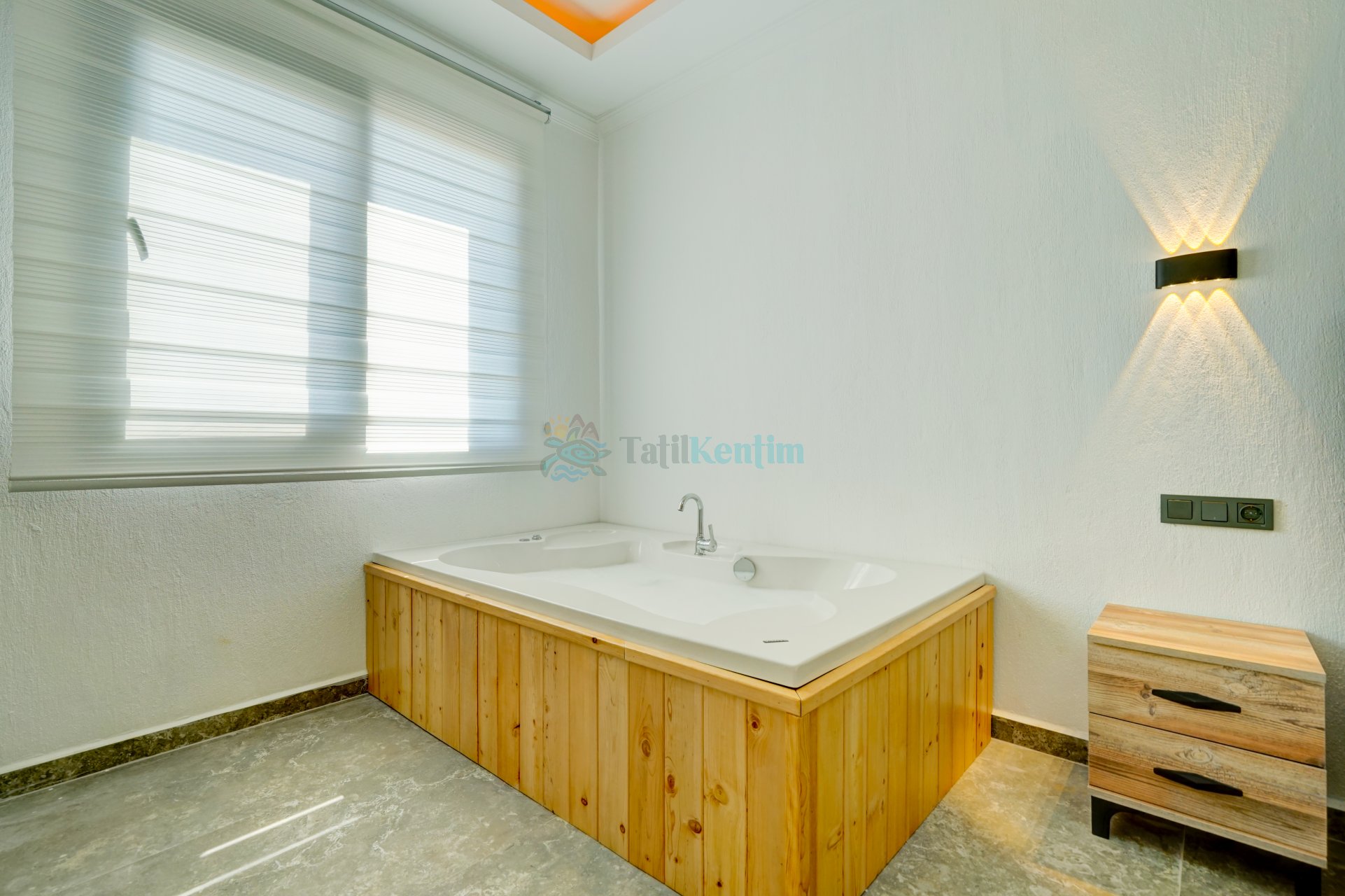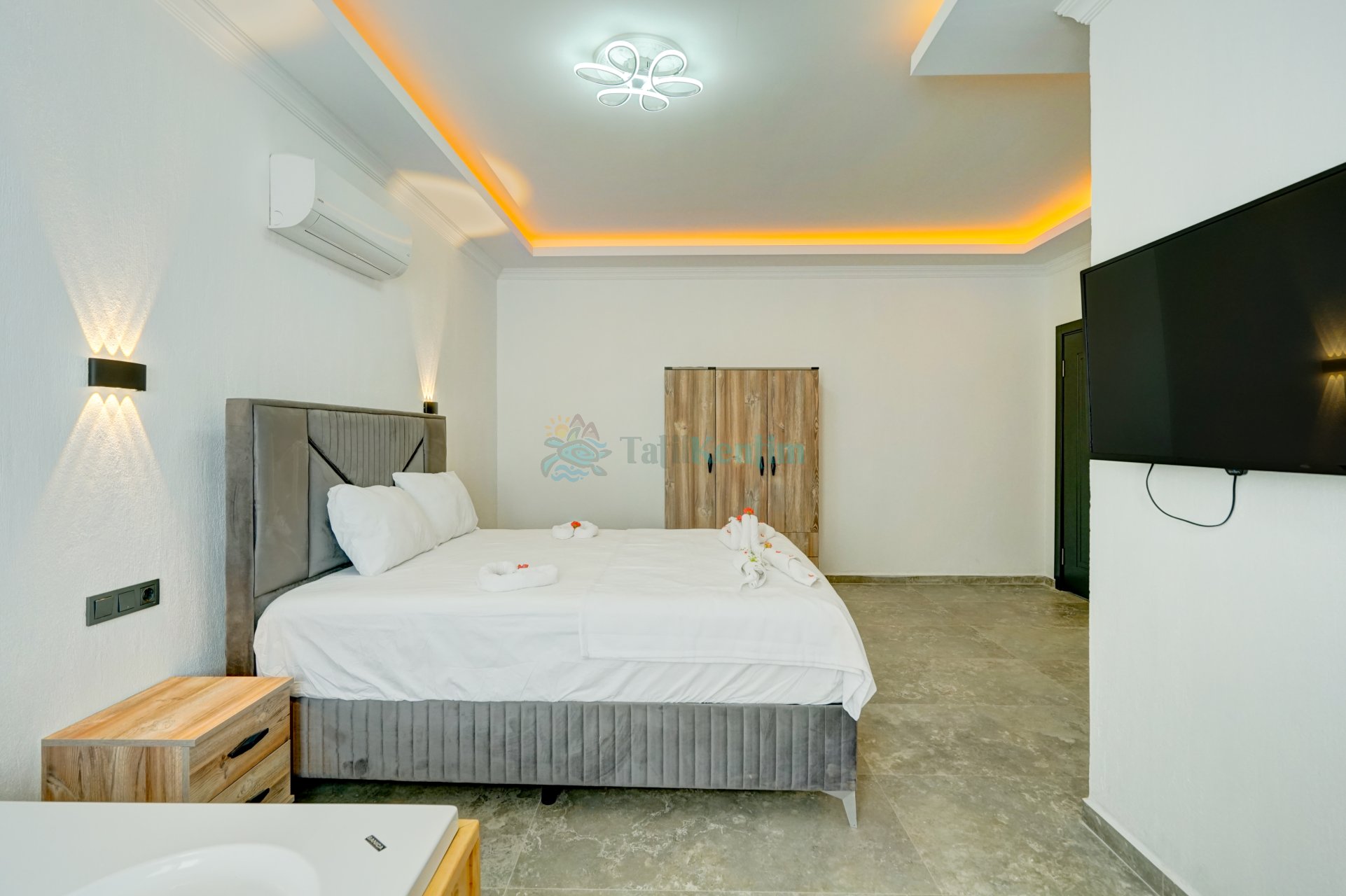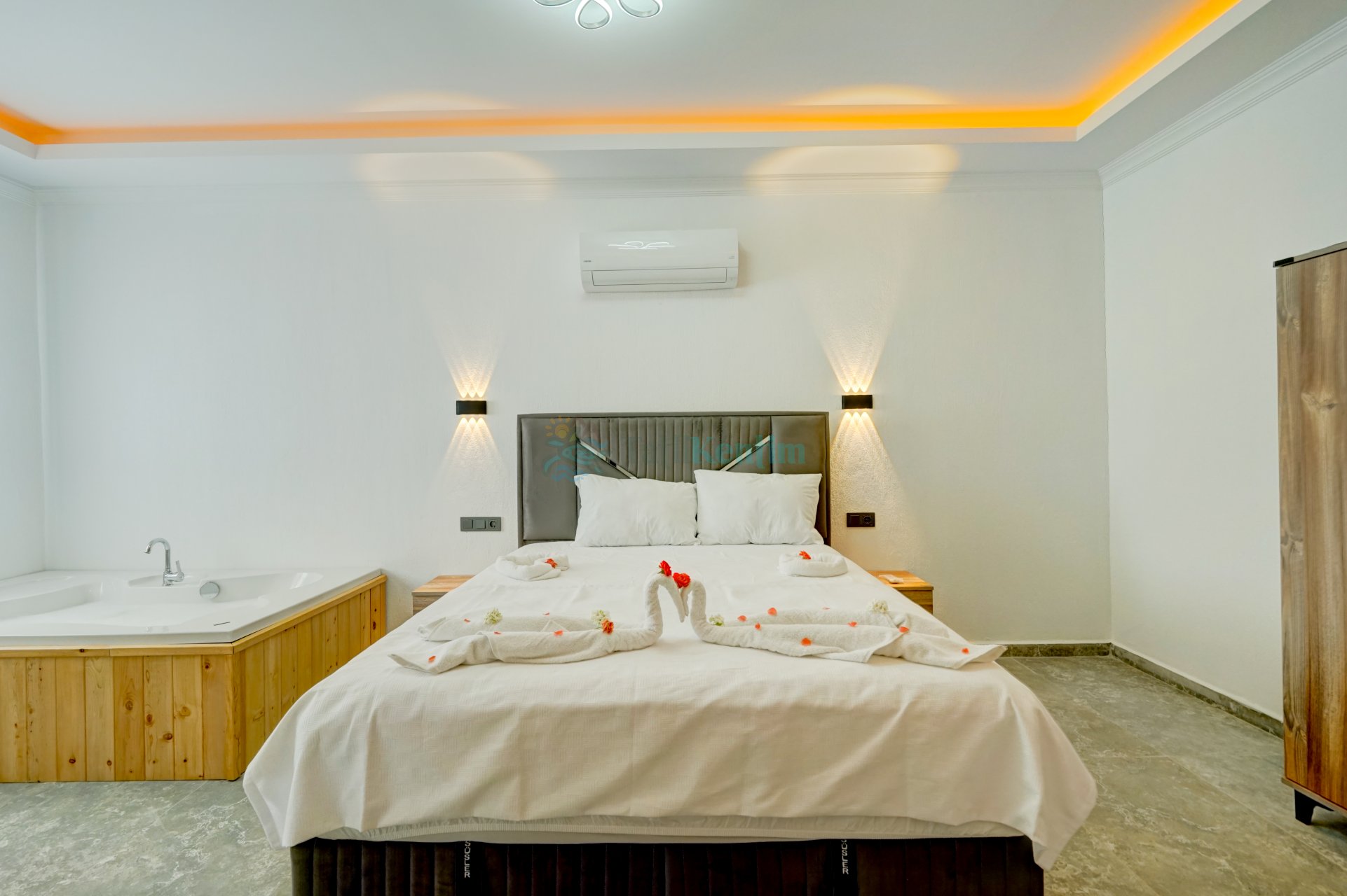 Tatil villamıza ait bu yatak odası içerisinde, 1 adet çift kişilik yatak, klima, elbise dolabı, komodin, jakuzi, banyo ve tuvalet alanları bulunmaktadır.