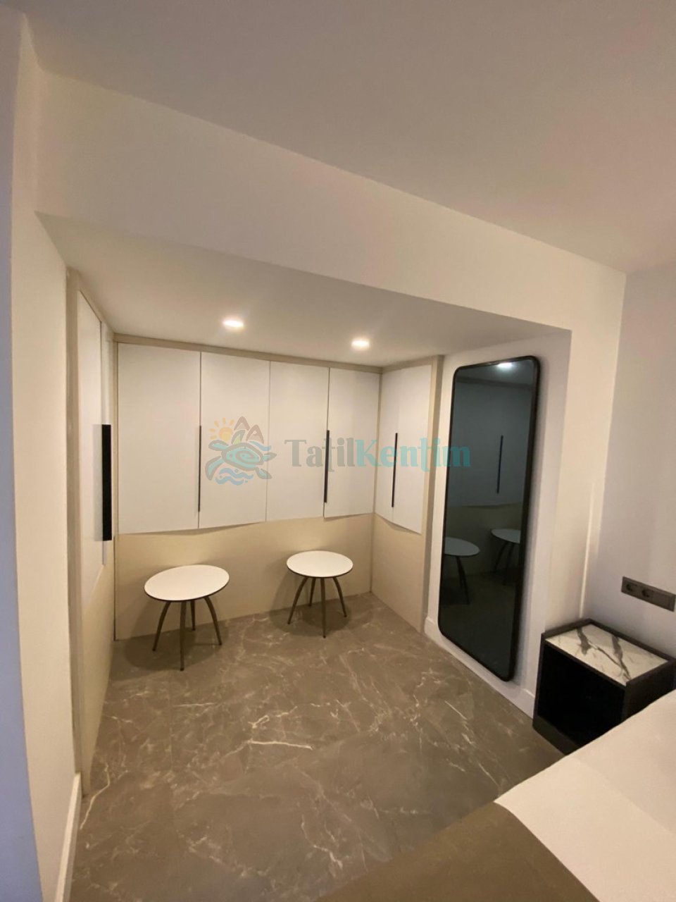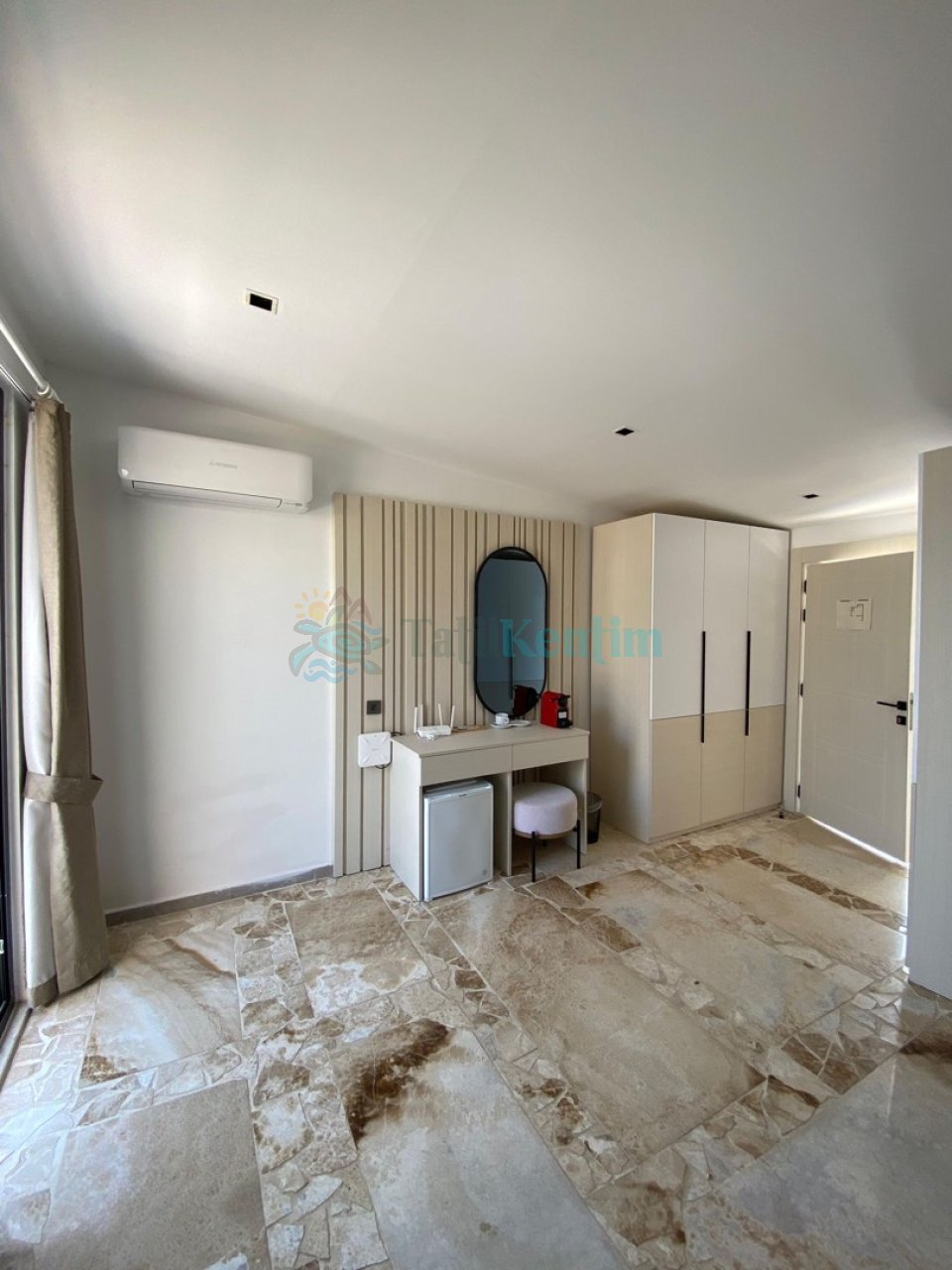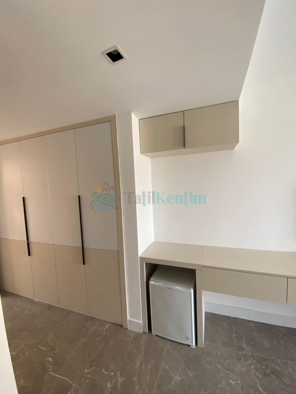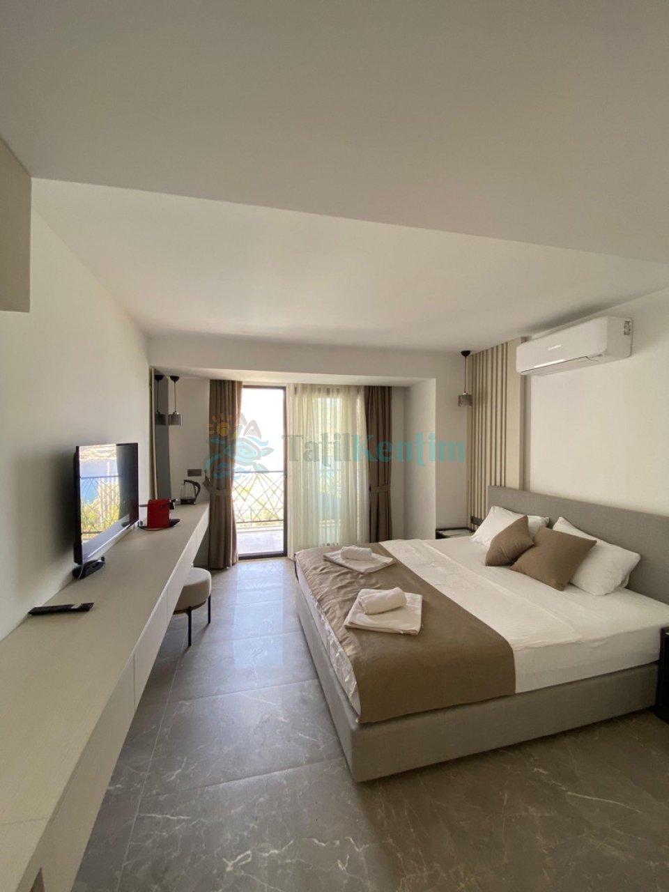 4.Yatak odası: Tatil villamıza ait bu yatak odası içerisinde; 1 adet çift kişilik yatak, klima, elbise dolabı, TV , banyo ve tuvalet yer almaktadır.