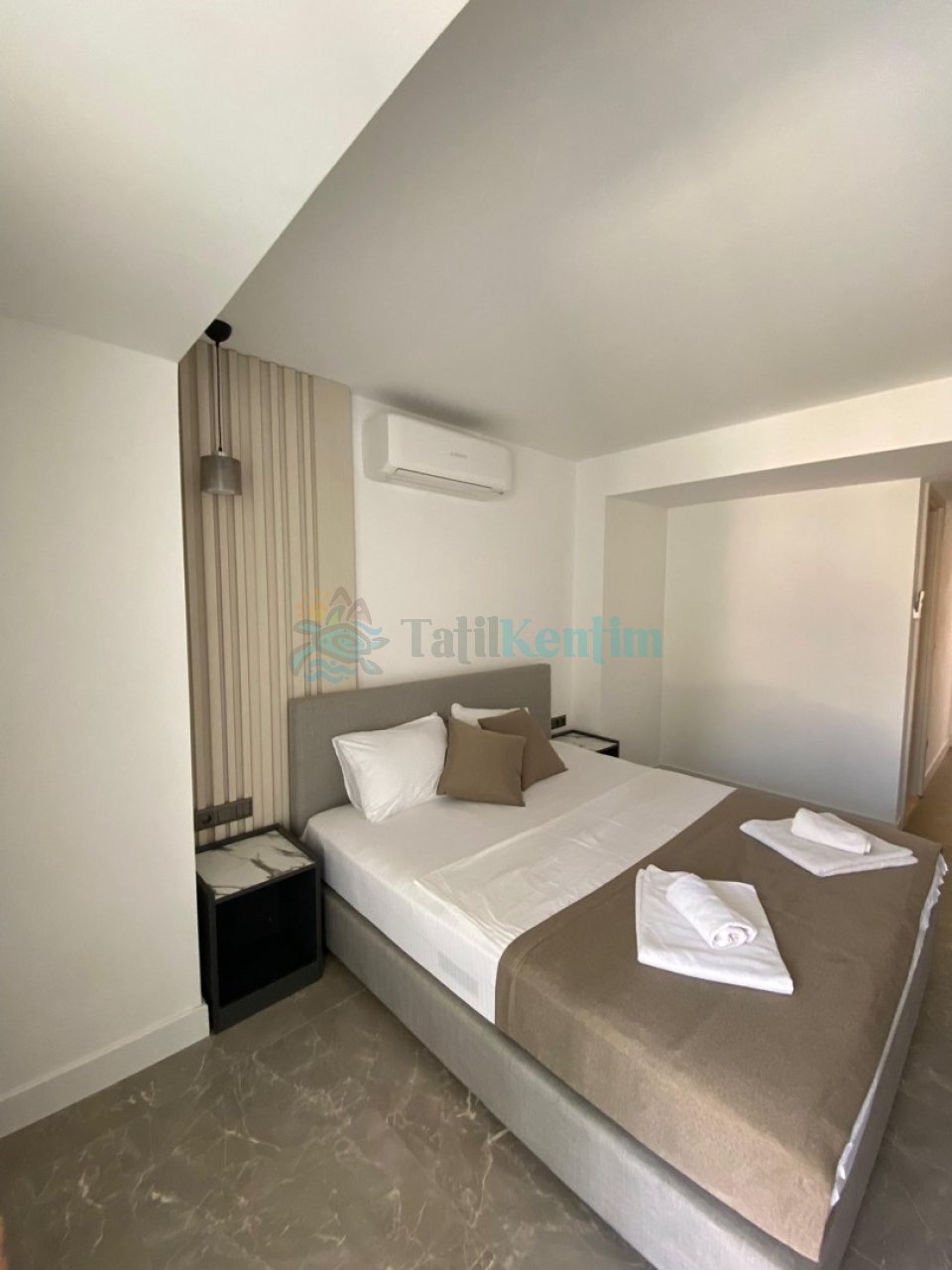 3.Yatak odası: Tatil villamıza ait bu yatak odası içerisinde; 1 adet çift kişilik yatak, klima, elbise dolabı, TV, banyo ve tuvalet yer almaktadır.