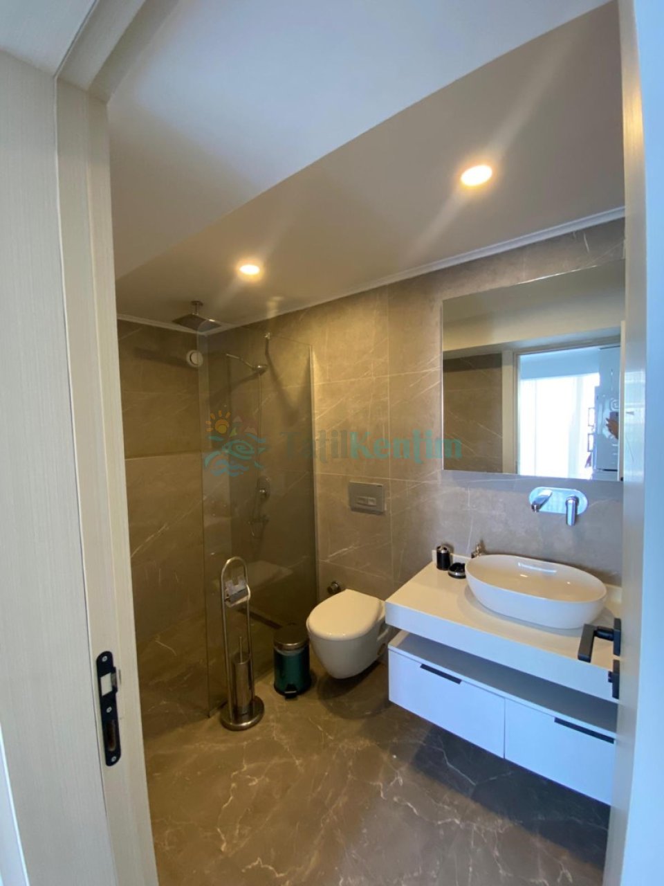 1.Yatak odası: Tatil villamıza ait bu yatak odası içerisinde; 1 adet çift kişilik yatak, klima, elbise dolabı, TV, banyo ve tuvalet yer almaktadır.