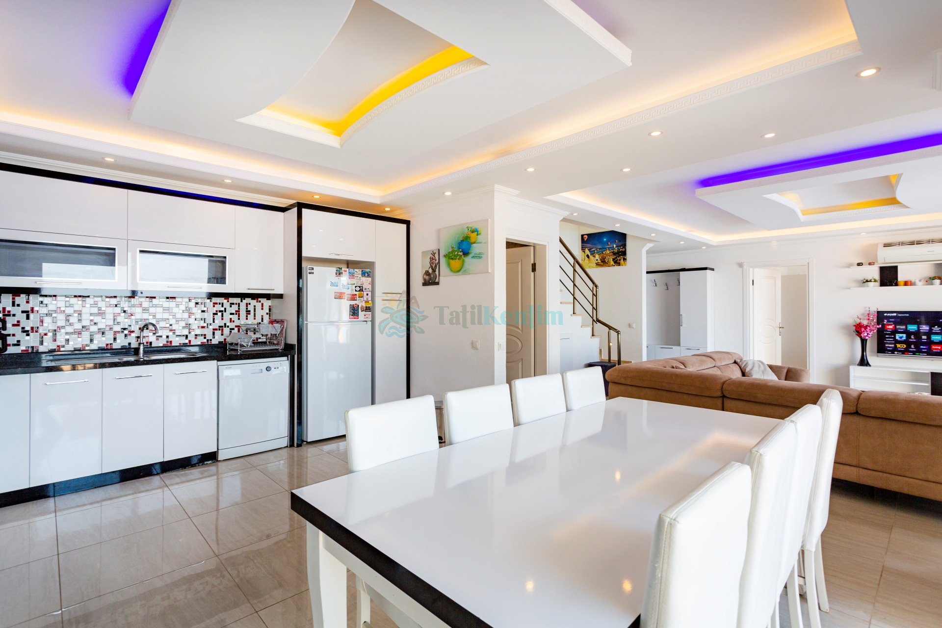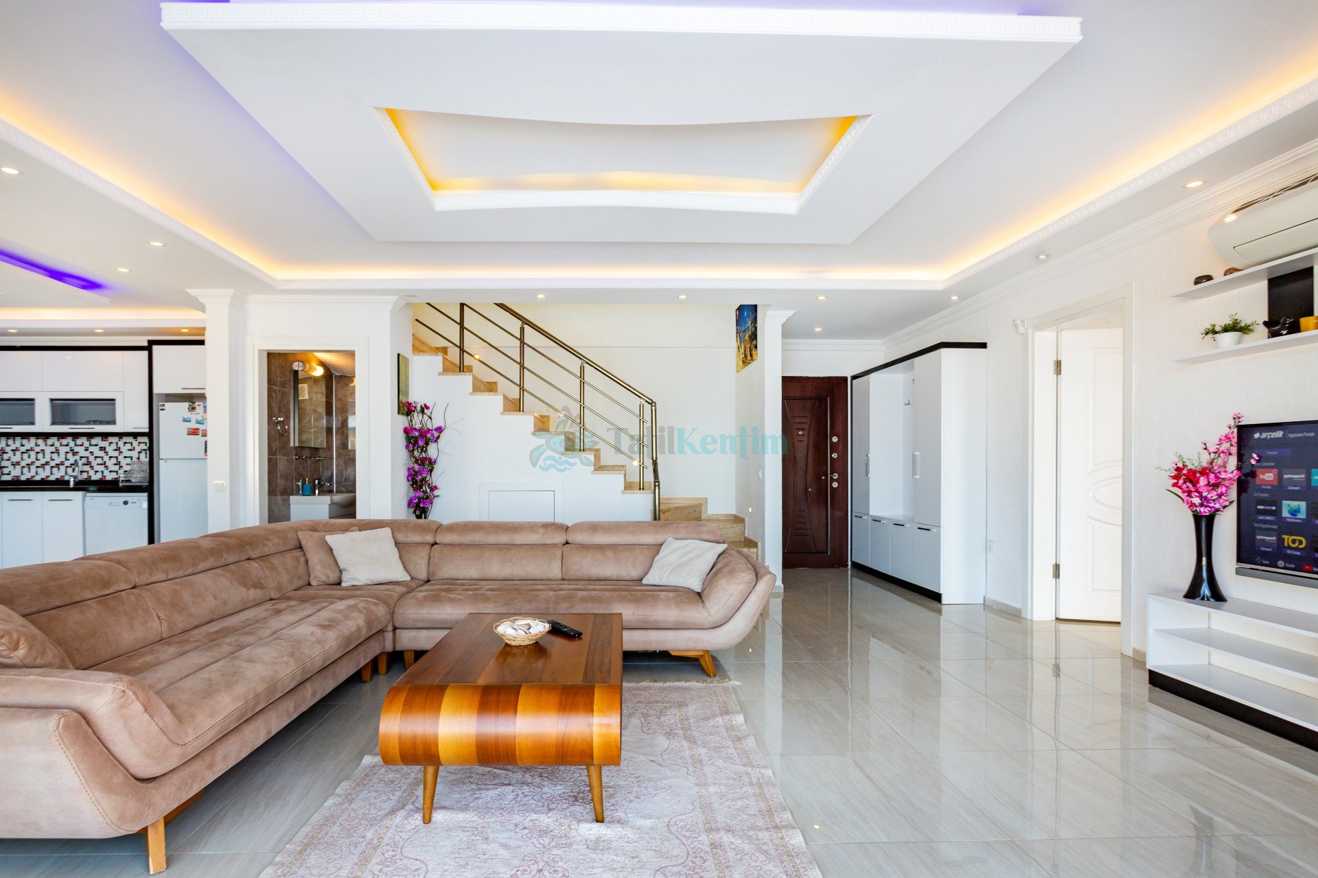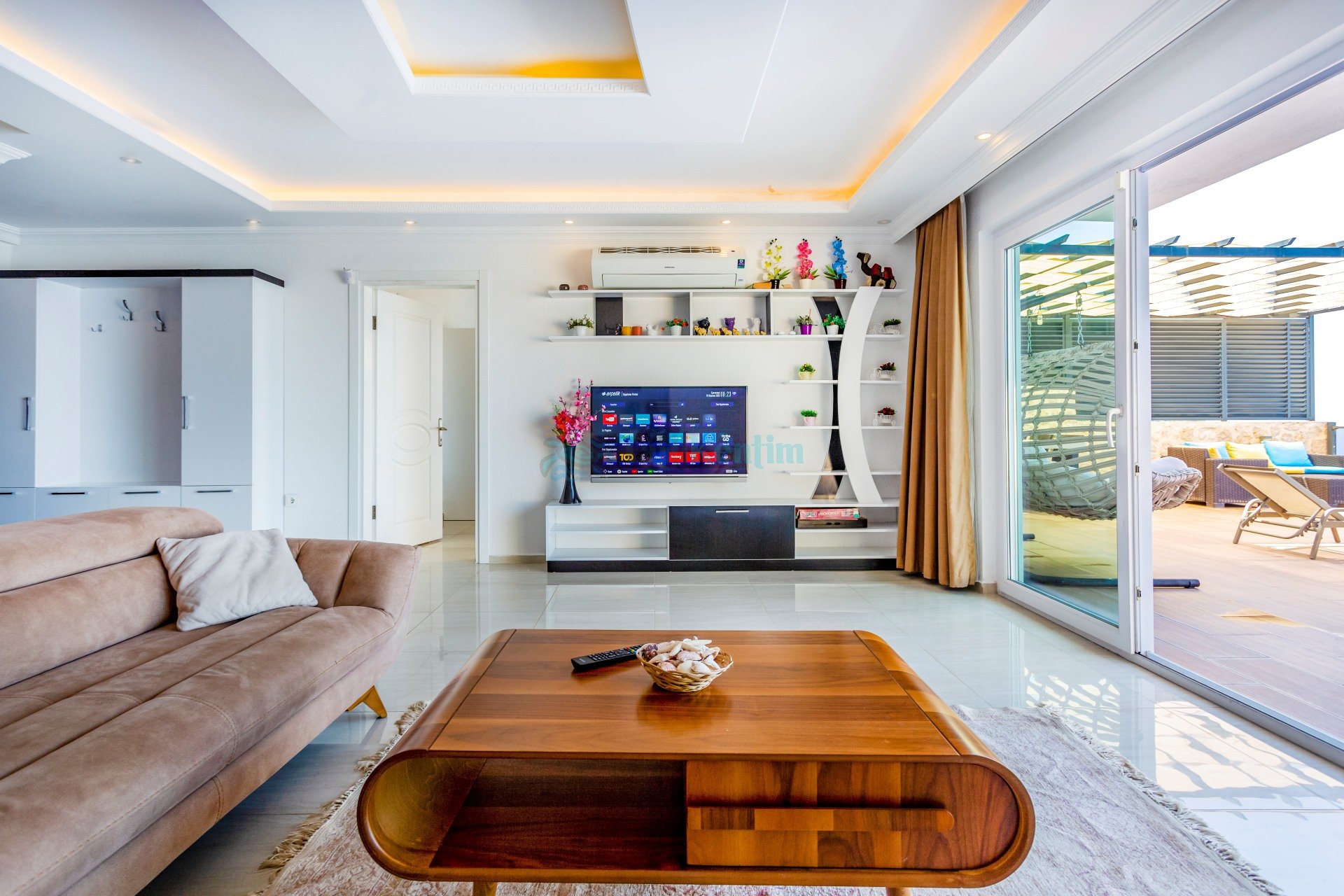 Modern şık oturma grubu, klima, televizyon, orta sehpa, yemek masası, yer almaktadır.