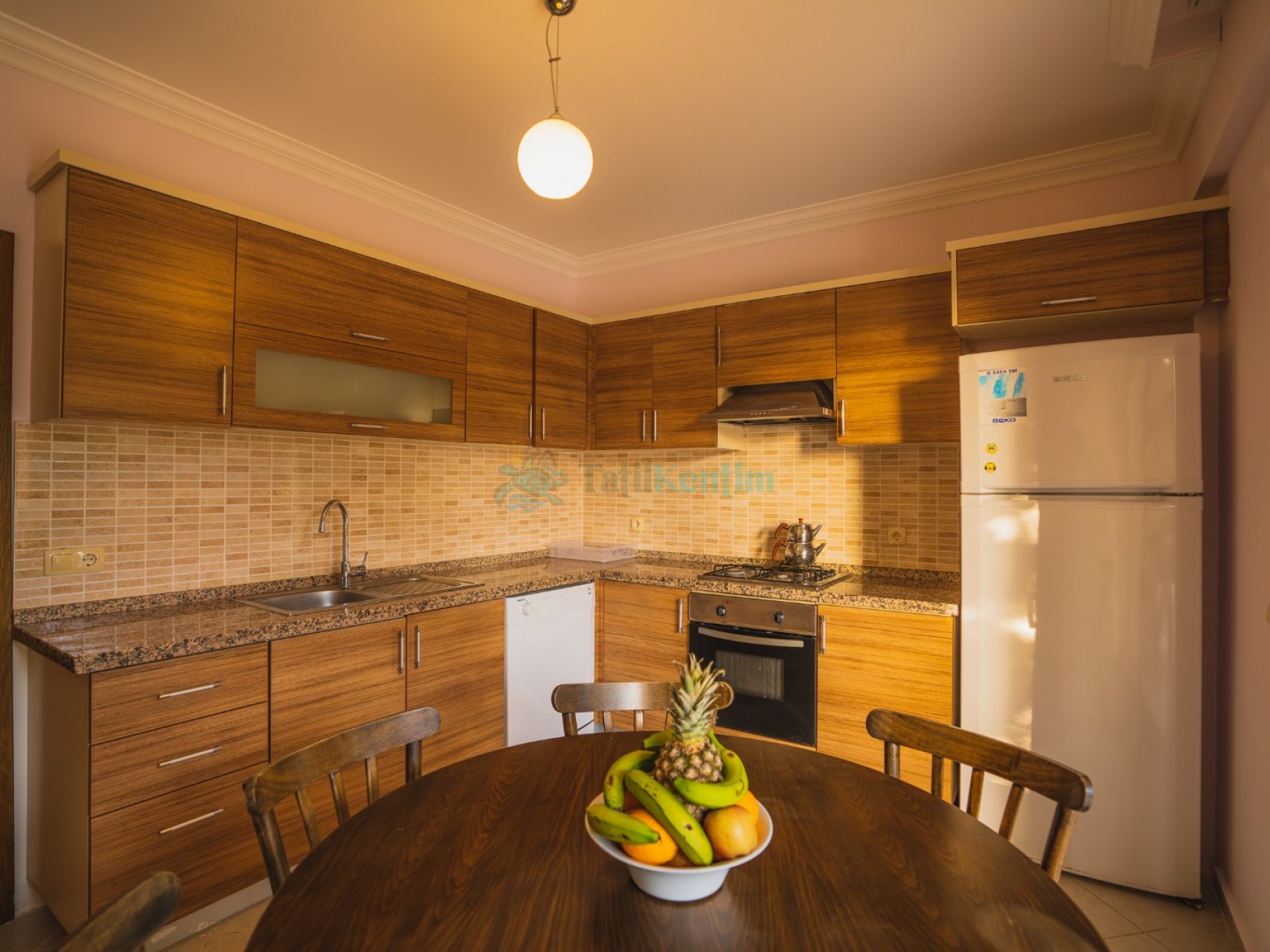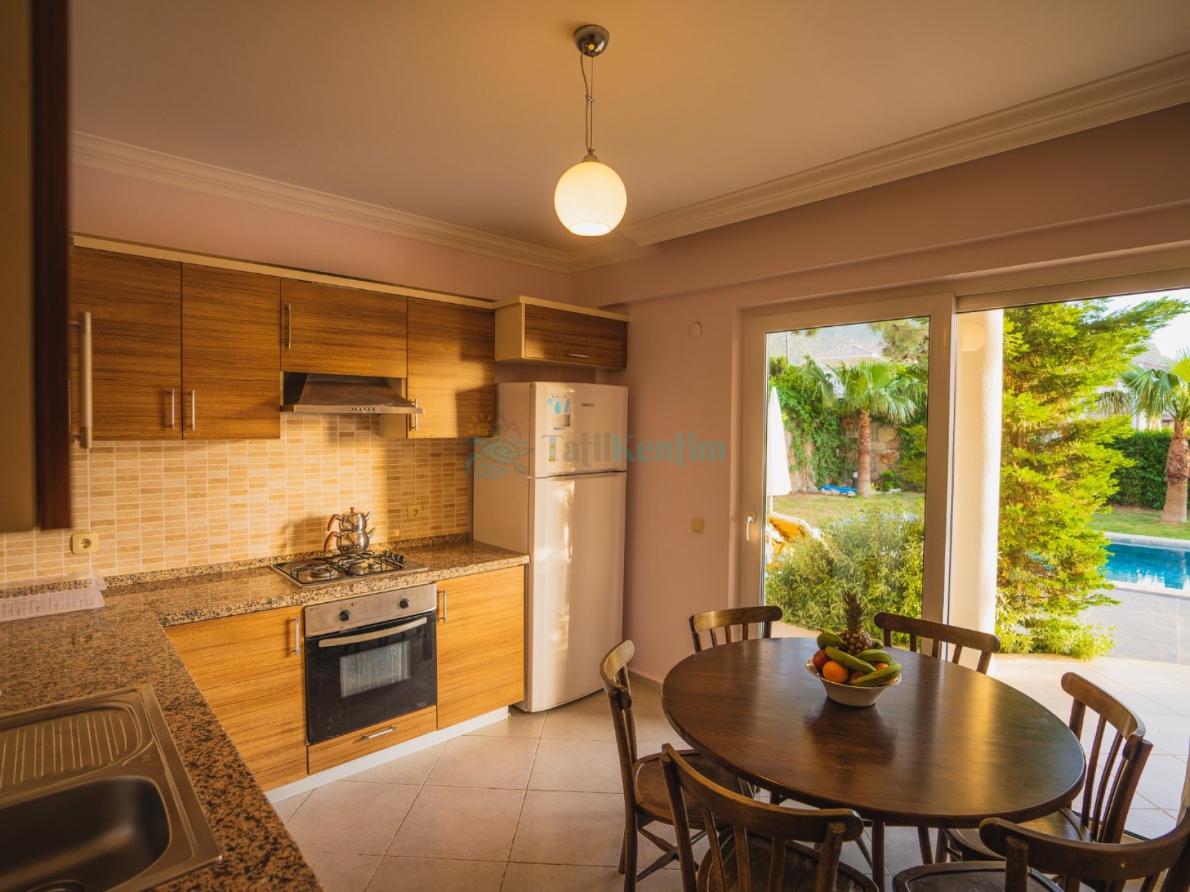 Mutfak: Buzdolabı, fırın, mikrodalga, çamaşır makinesi, bulaşık makinesi, 4’lü ocak, elektrikli su ısıtıcısı (kettle), elektrikli süpürge, ekmek kızartma makinesi, 8 kişilik yemek takımı, tava, tencereler, çatal ve bıçak takımı ve diğer mutfak malzemesi mevcuttur. Havuz terasına çıkış bulunmaktadır..