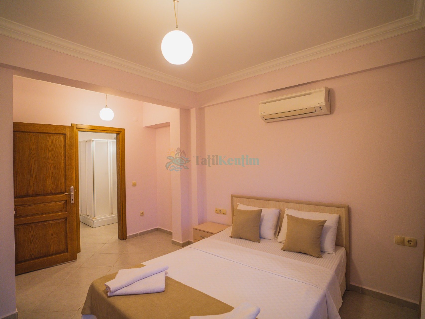 1.Yatak odası: 1 adet çift kişilik yatak, elbise dolabı, makyaj masası, küvet, klima, banyo ve tuvalet bulunmaktadır.
