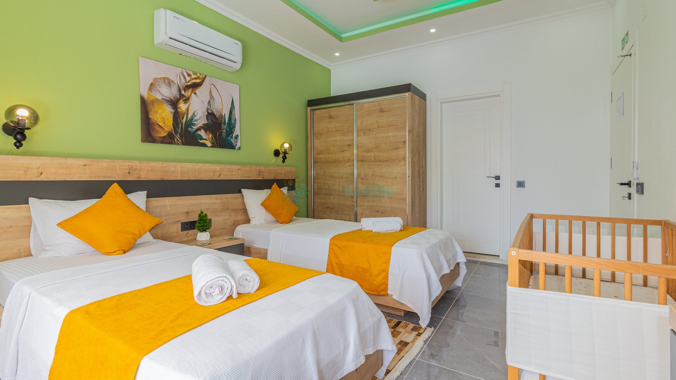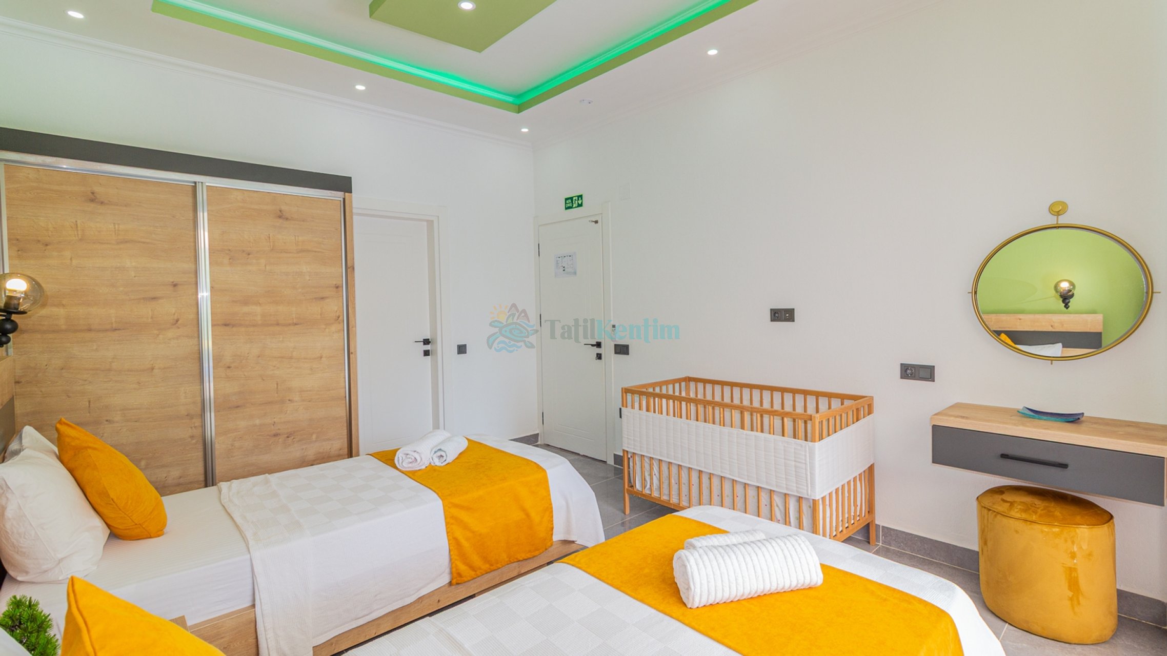 Kiralık villanın bu yatak odası içerisinde, 2 adet tek kişilik yatak, klima, elbise dolabı, komodin, makyaj masası, banyo ve tuvalet bulunmaktadır.