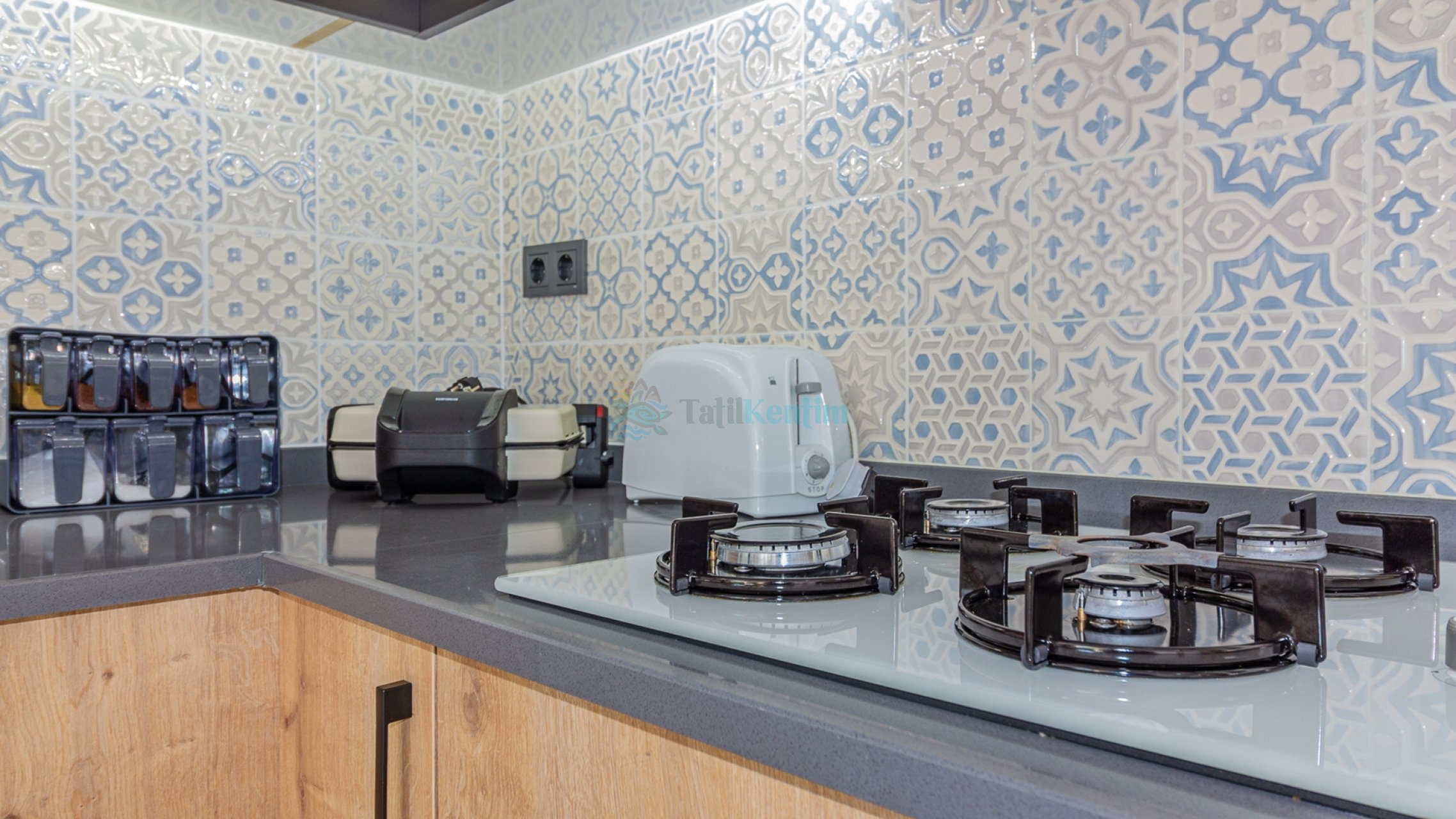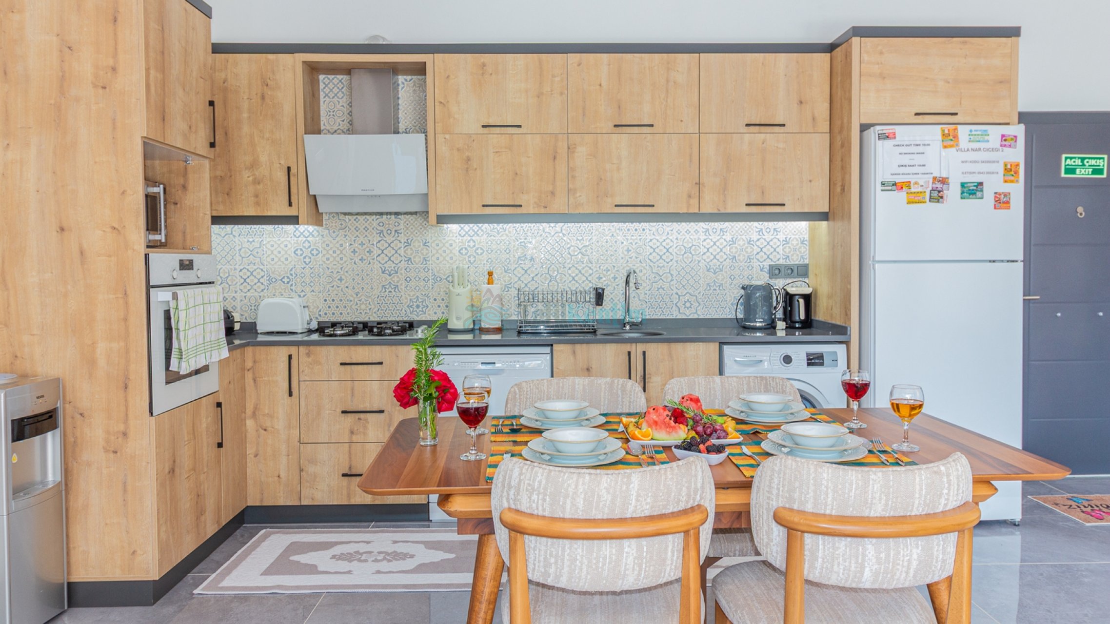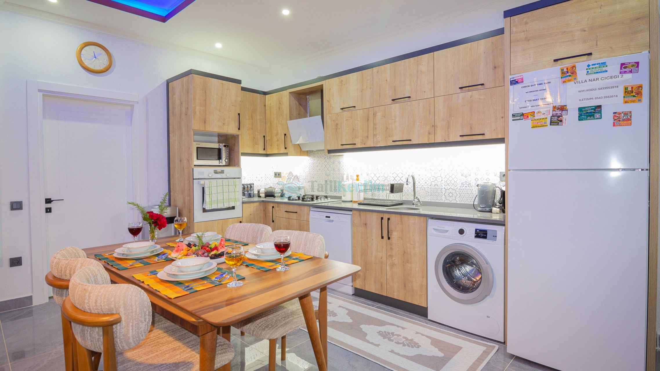 Yazlığımızın Amerikan mutfağı içerisinde, buzdolabı, bulaşık makinası, çamaşır makinası, yemek masası, yemek takımı, ankastre fırın, mikrodalga fırın, tost makinası, ankastre ocak, çaydanlık, su ısıtıcısı, çocuk masası, tava, tencere takımı ve gerekli olan tüm mutfak gereçleri yer almaktadır.