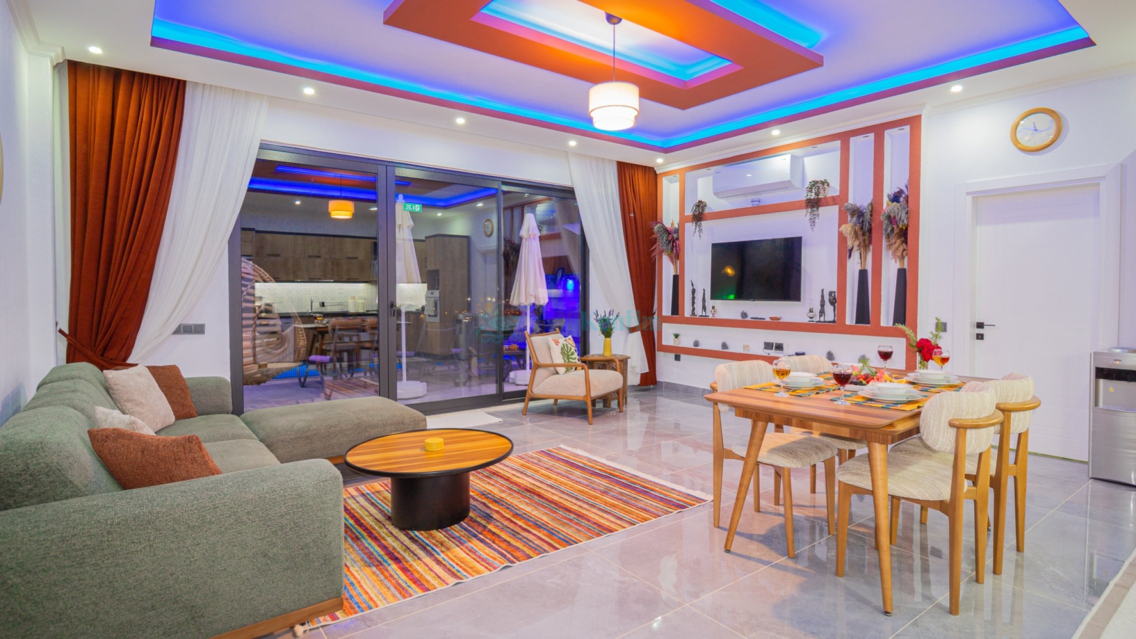Villamızın salonu içerisinde, koltuk takımı, orta sehpa, TV, TV ünitesi, klima, uydu alıcısı yer almaktadır.