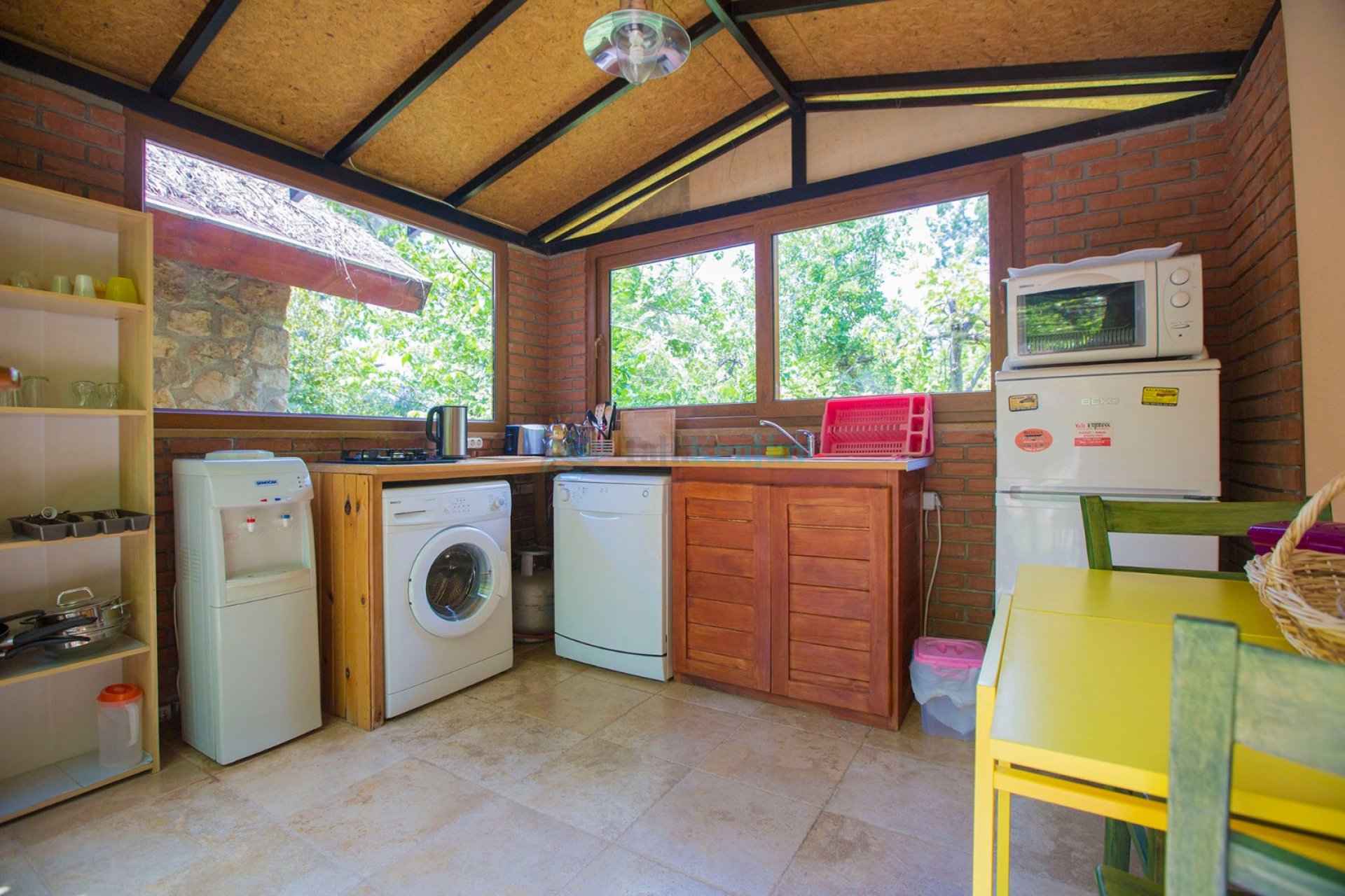 Amerikan mutfak içerisinde, buzdolabı, bulaşık makinası, çamaşır makinası, yemek masası, yemek takımı, ankastre fırın, tost makinası, ankastre ocak, çaydanlık, su ısıtıcısı, tava, tencere takımı ve gerekli olan tüm mutfak gereçleri yer almaktadır.