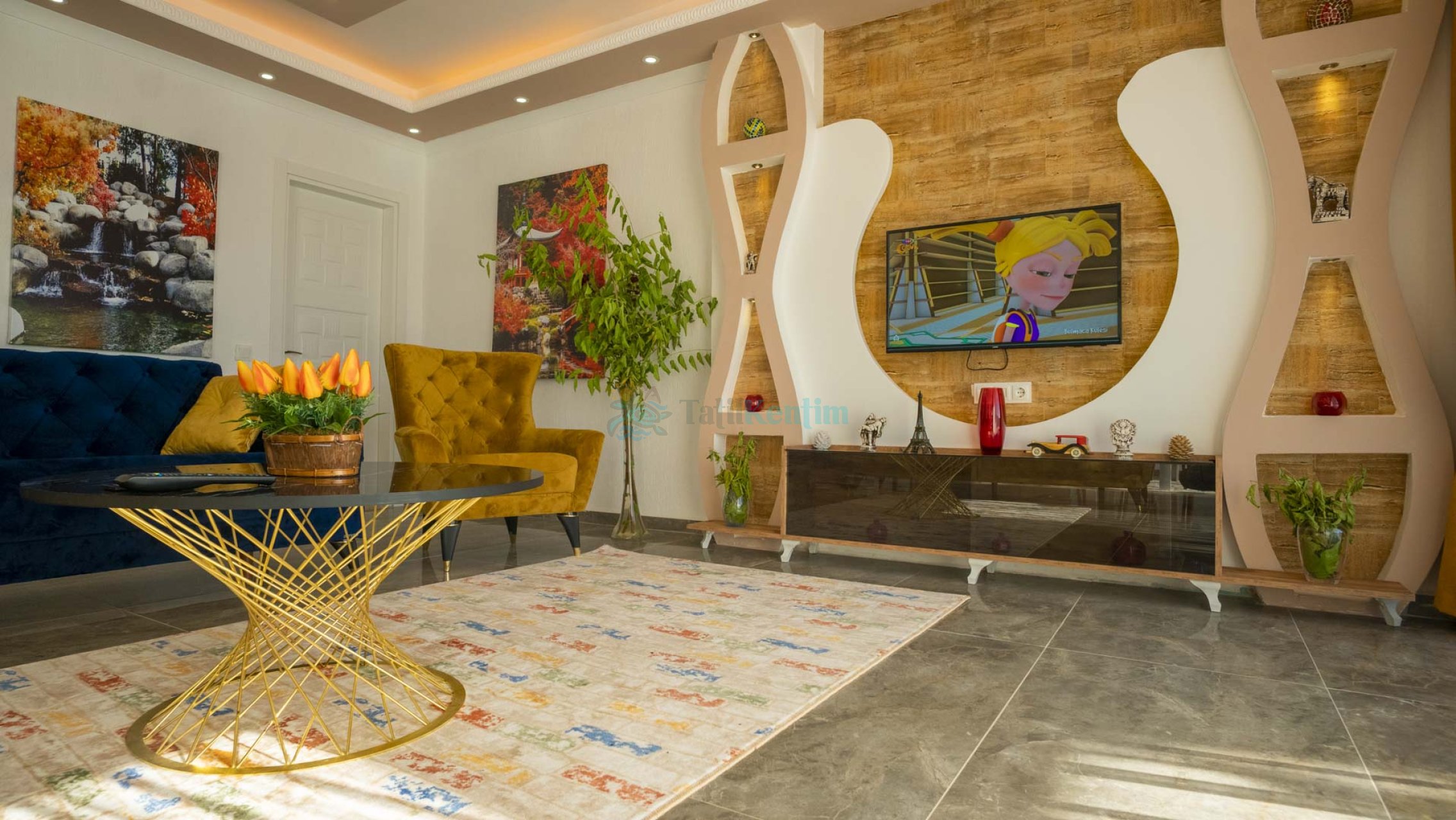 Doğa manzaralı salon içerisinde, koltuk takımı, orta sehpa, TV, TV ünitesi, klima, uydu alıcısı yer almaktadır.
