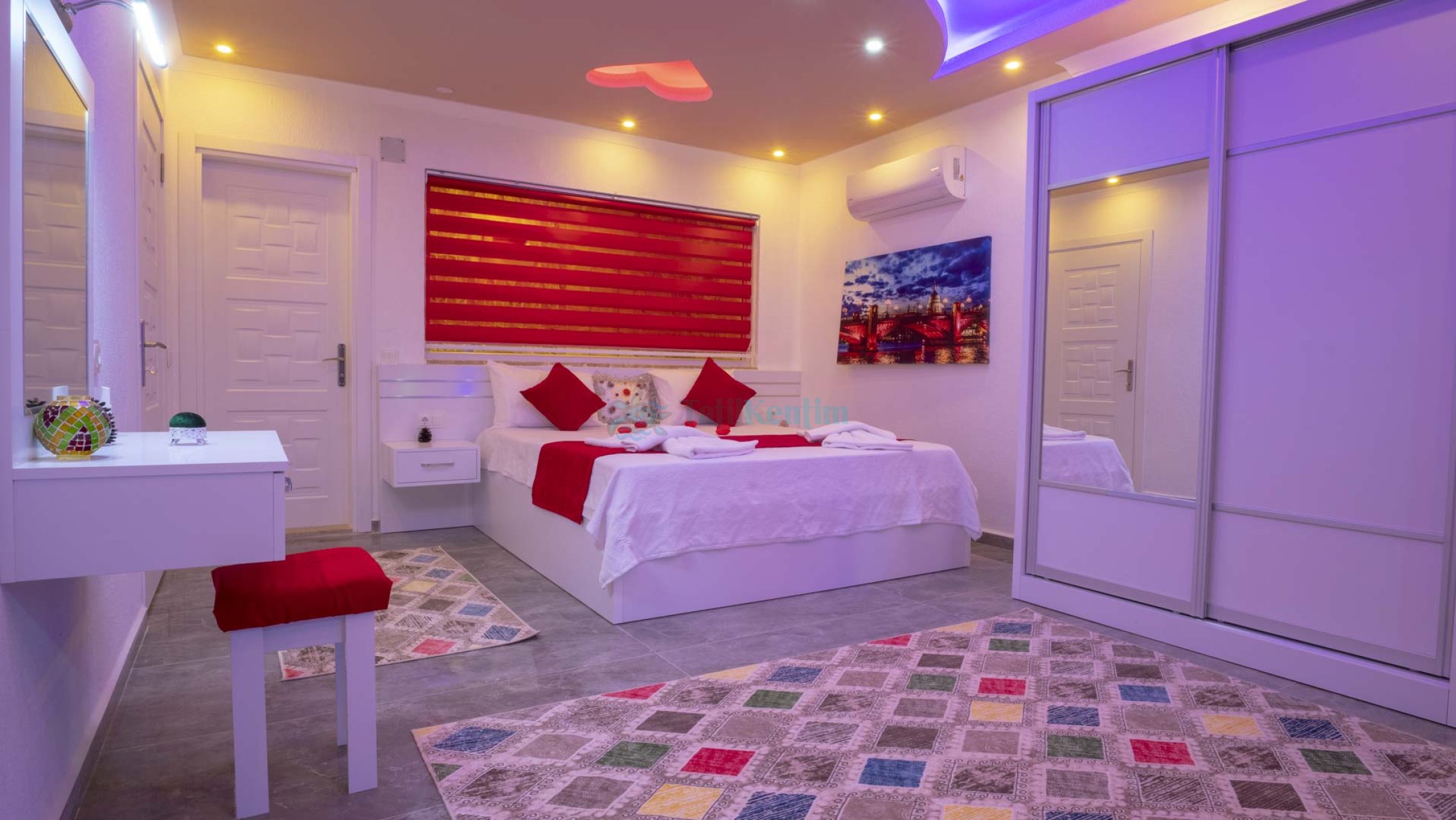 Yatak odası içerisinde, 1 adet çift kişilik yatak, klima, elbise dolabı, komodin, makyaj masası, banyo ve tuvalet yer almaktadır.