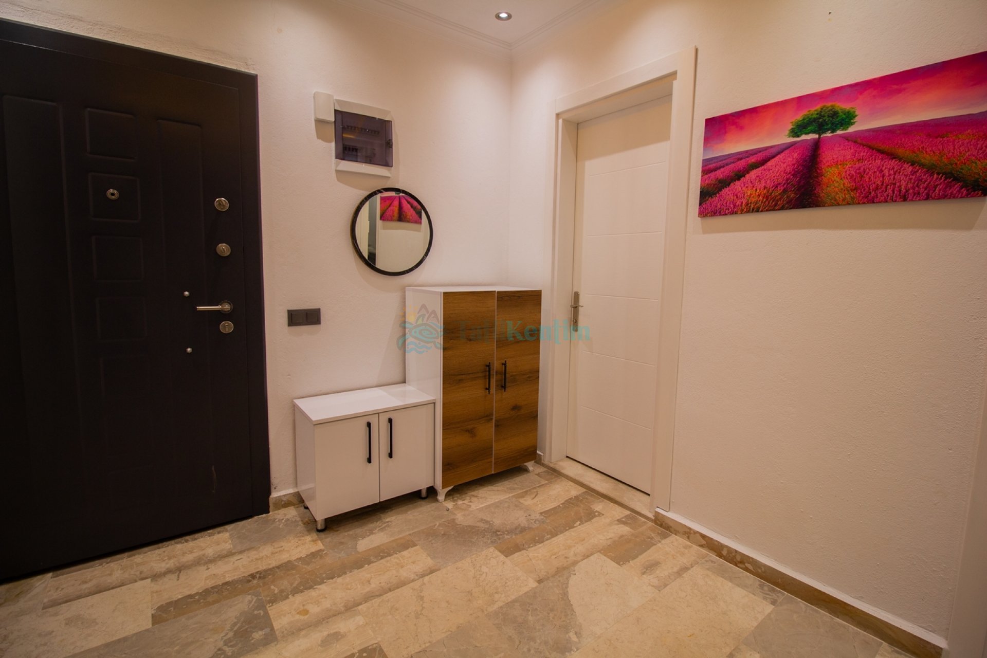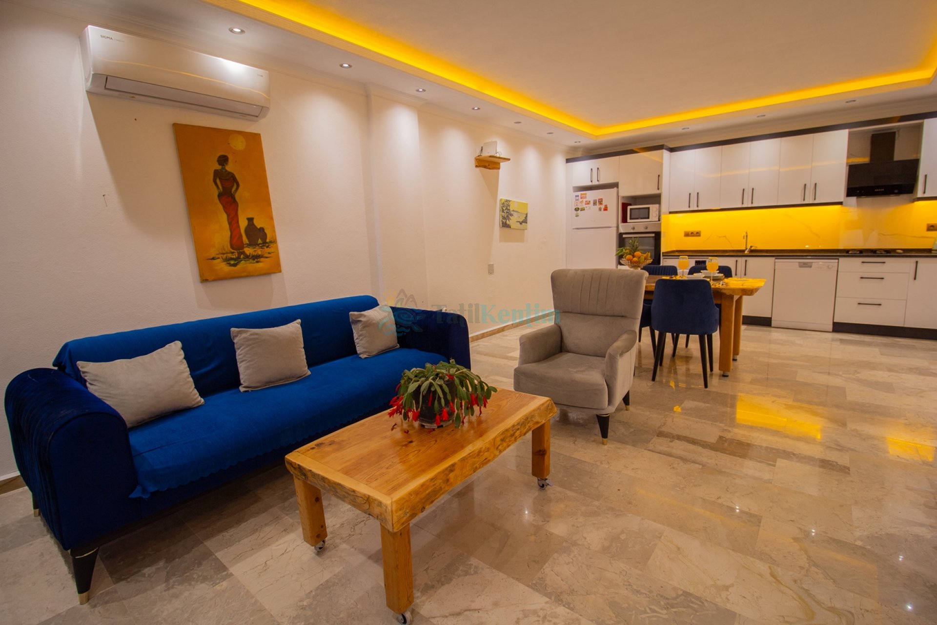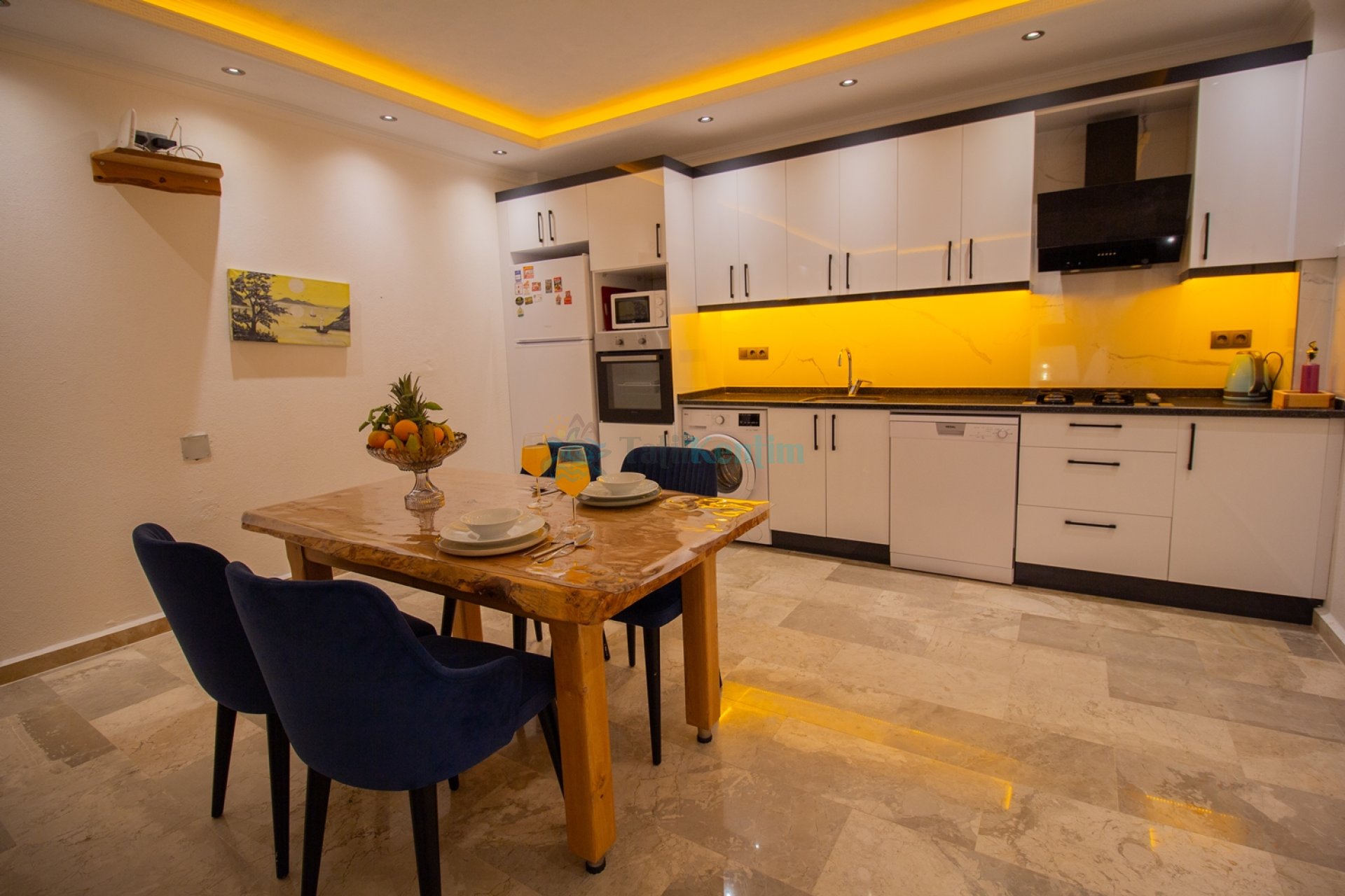 Amerikan mutfak içerisinde, buzdolabı, bulaşık makinası, çamaşır makinası, yemek masası, yemek takımı, ankastre fırın, tost makinası, ankastre ocak, çaydanlık, su ısıtıcısı, tava, tencere takımı ve gerekli olan tüm mutfak gereçleri yer almaktadır.