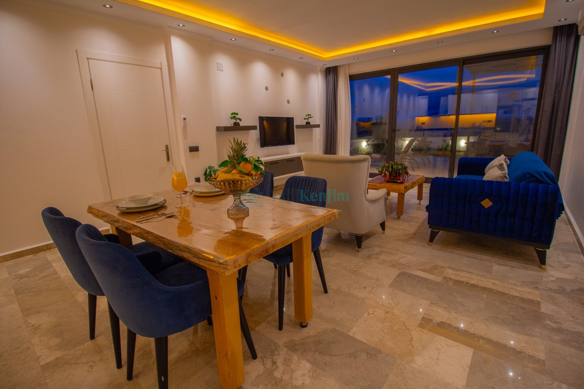 Villamızın salonu içerisinde, koltuk takımı, orta sehpa, TV, TV ünitesi, klima, uydu alıcısı yer almaktadır.