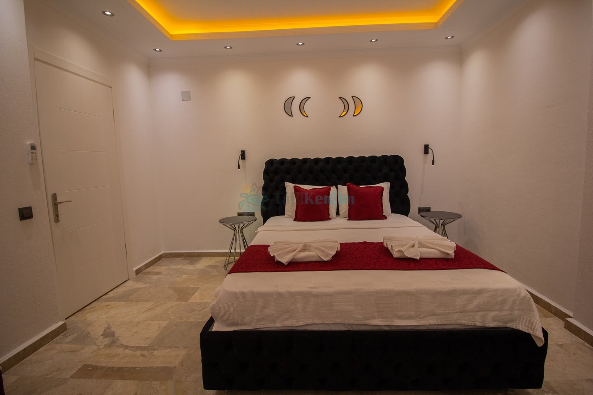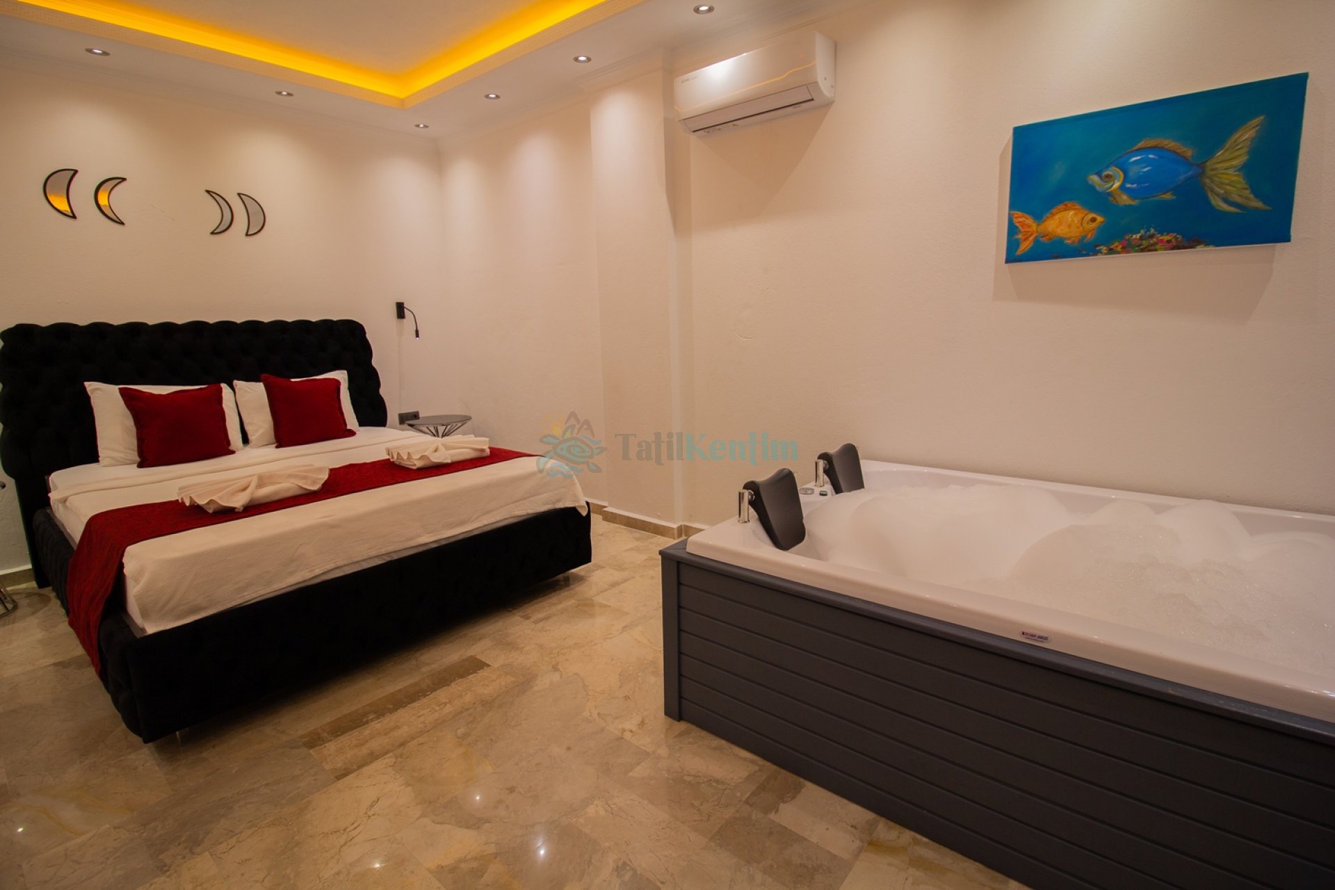 Yatak odası içerisinde, 1 adet çift kişilik yatak, klima, elbise dolabı, komodin, makyaj masası, jakuzi, banyo ve tuvalet yer almaktadır.