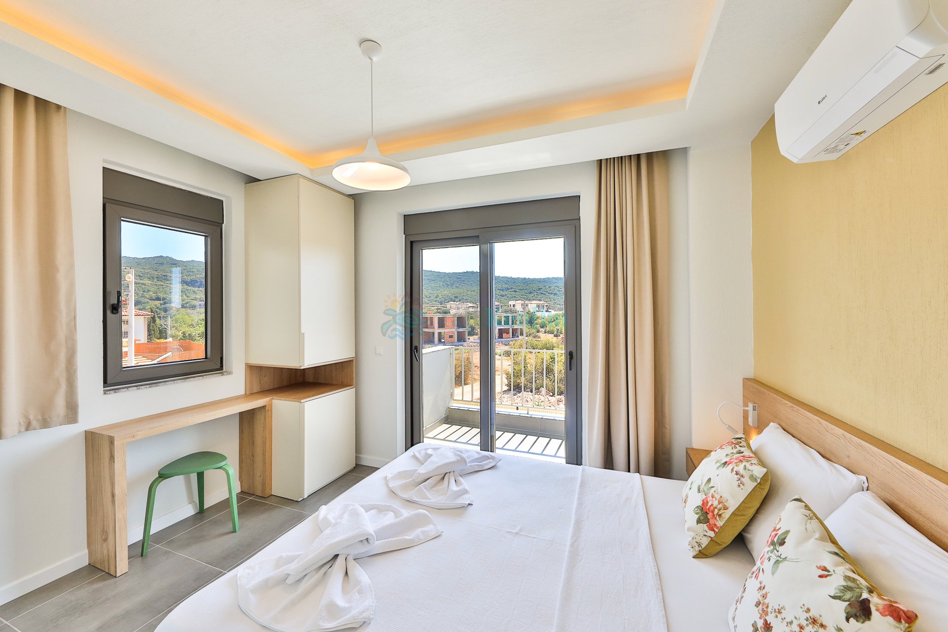 Tatil villamıza ait bu yatak odası içerisinde, 1 adet çift kişilik yatak, klima, elbise dolabı, komodin, makyaj masası, banyo ve tuvalet alanları bulunmaktadır.