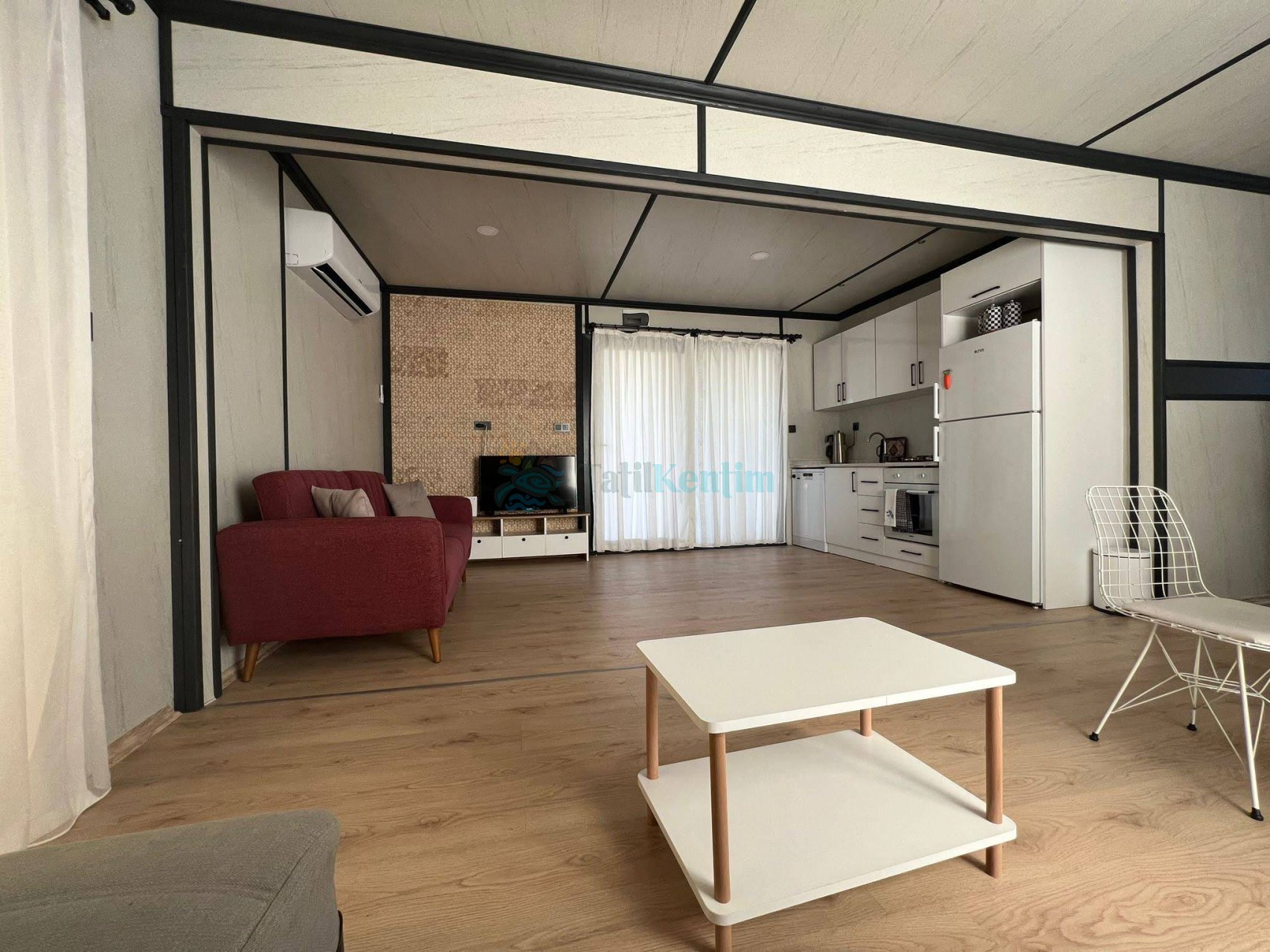 Yazlığımızın Amerikan mutfağı içerisinde, buzdolabı, bulaşık makinası, çamaşır makinası, yemek masası, yemek takımı, ankastre fırın, tost makinası, ankastre ocak, çaydanlık, su ısıtıcısı, tava, tencere takımı ve gerekli olan tüm mutfak gereçleri yer almaktadır.
