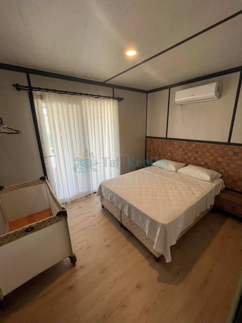 Tatil villamıza ait bu yatak odası içerisinde, 1 adet çift kişilik yatak, klima, elbise dolabı, komodin, makyaj masası, banyo ve tuvalet alanları bulunmaktadır.