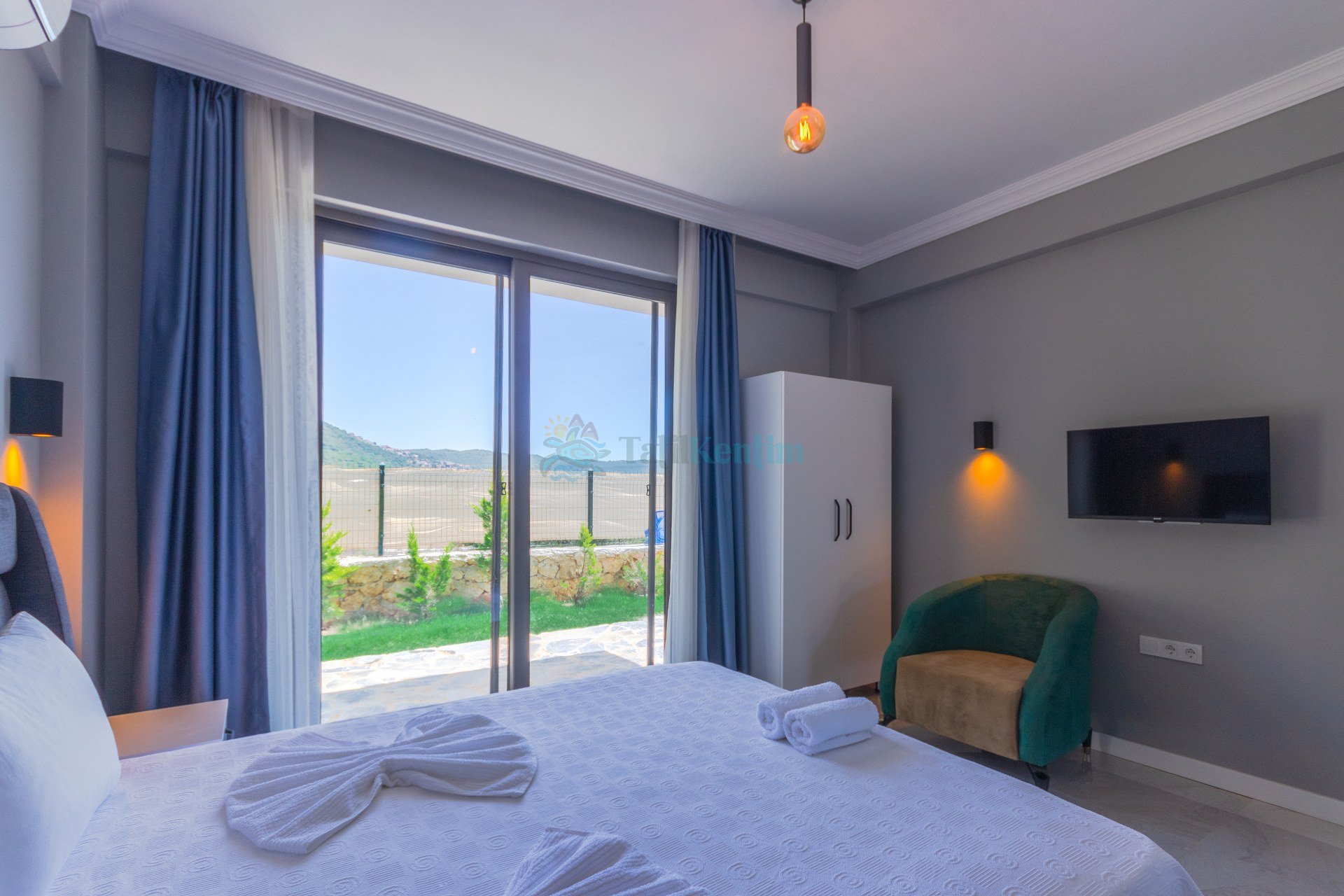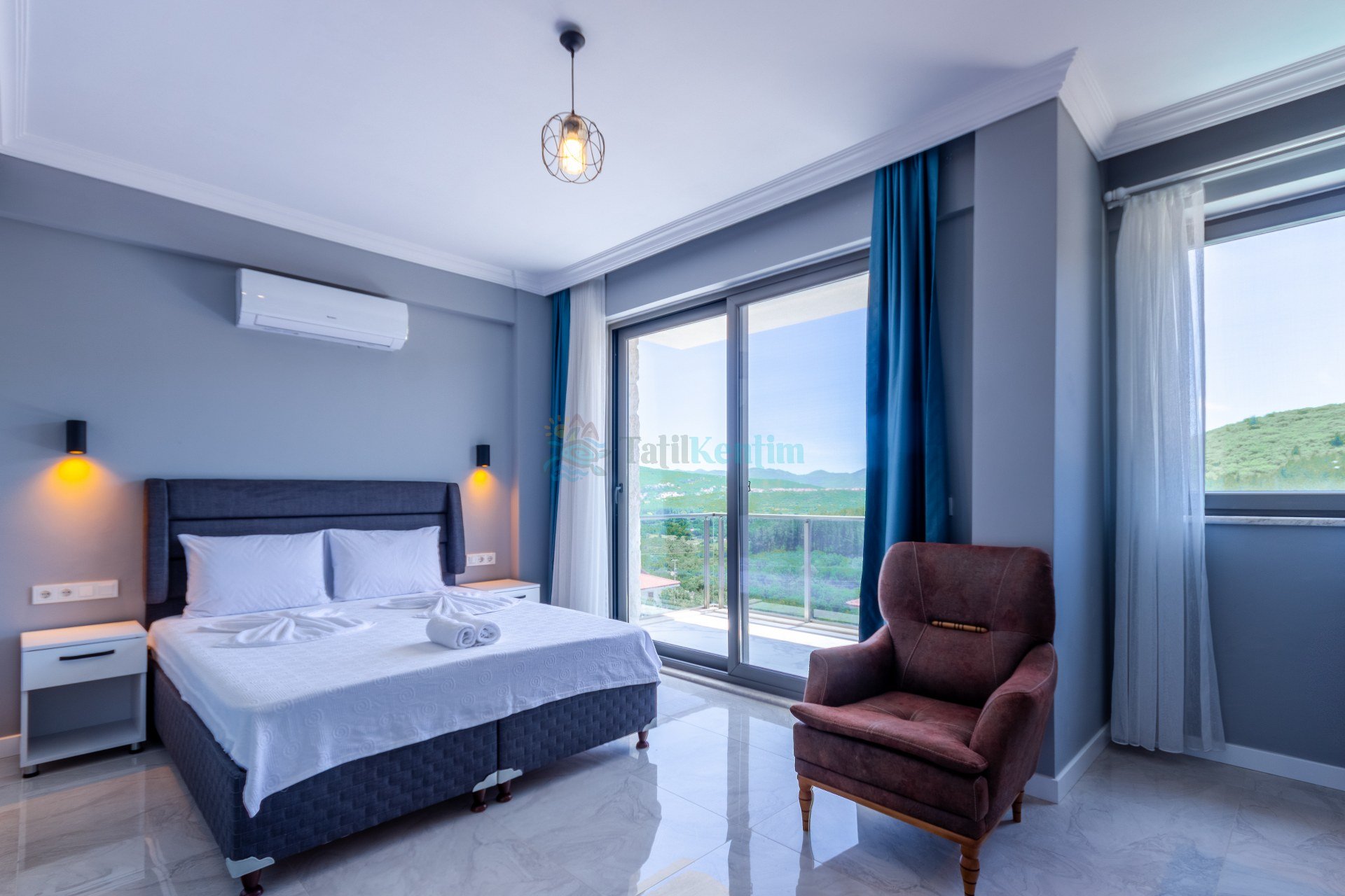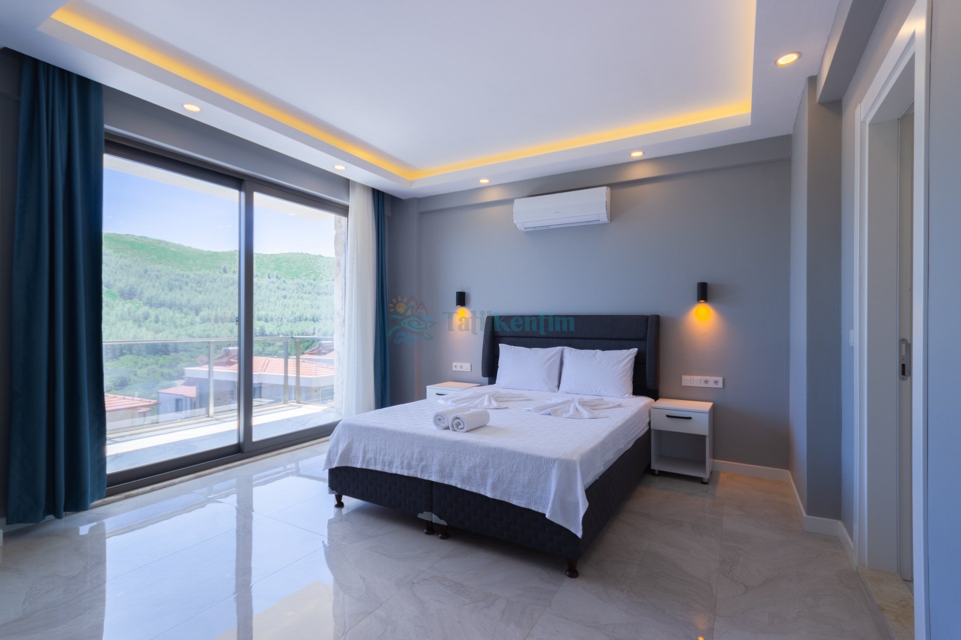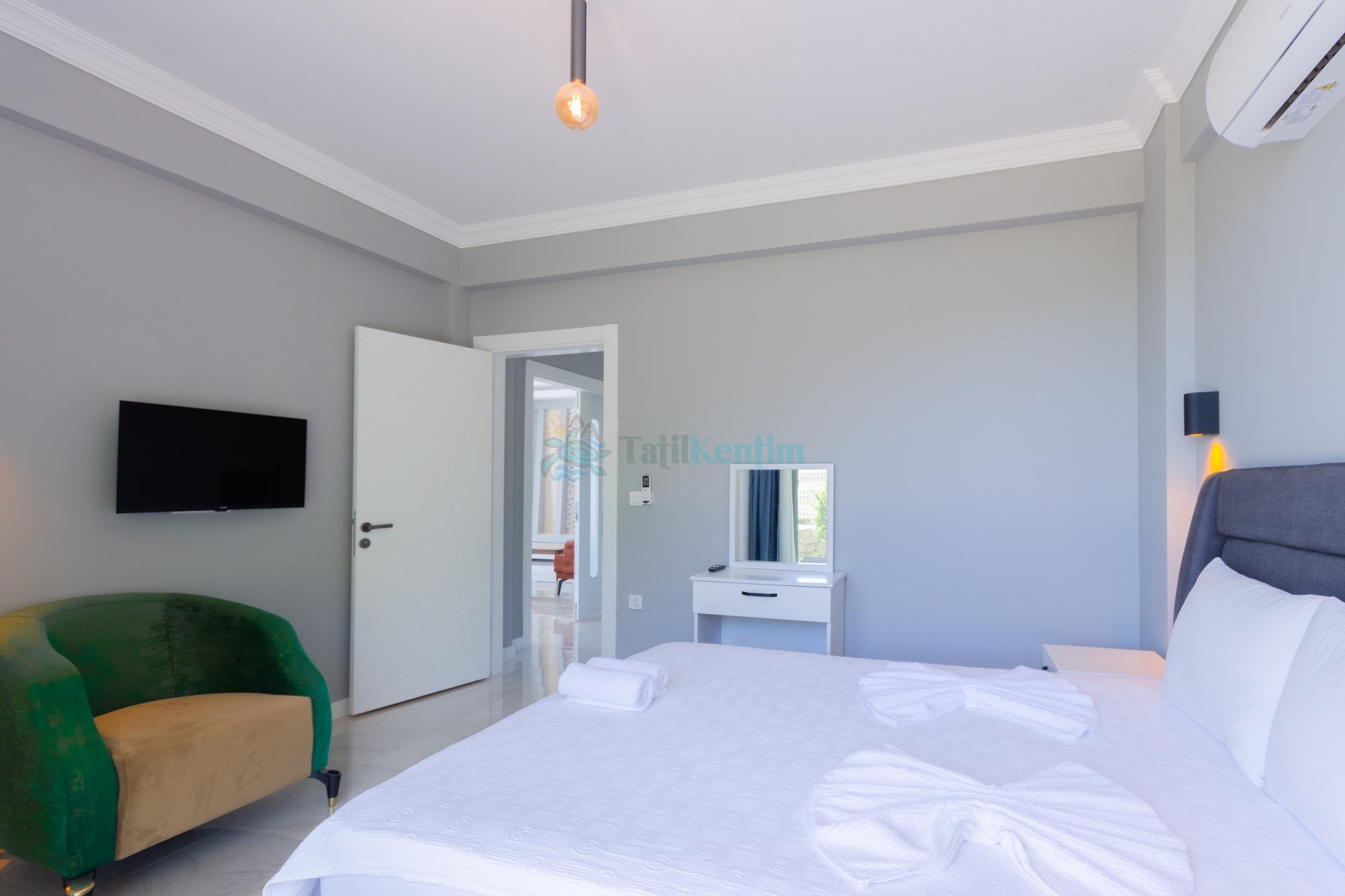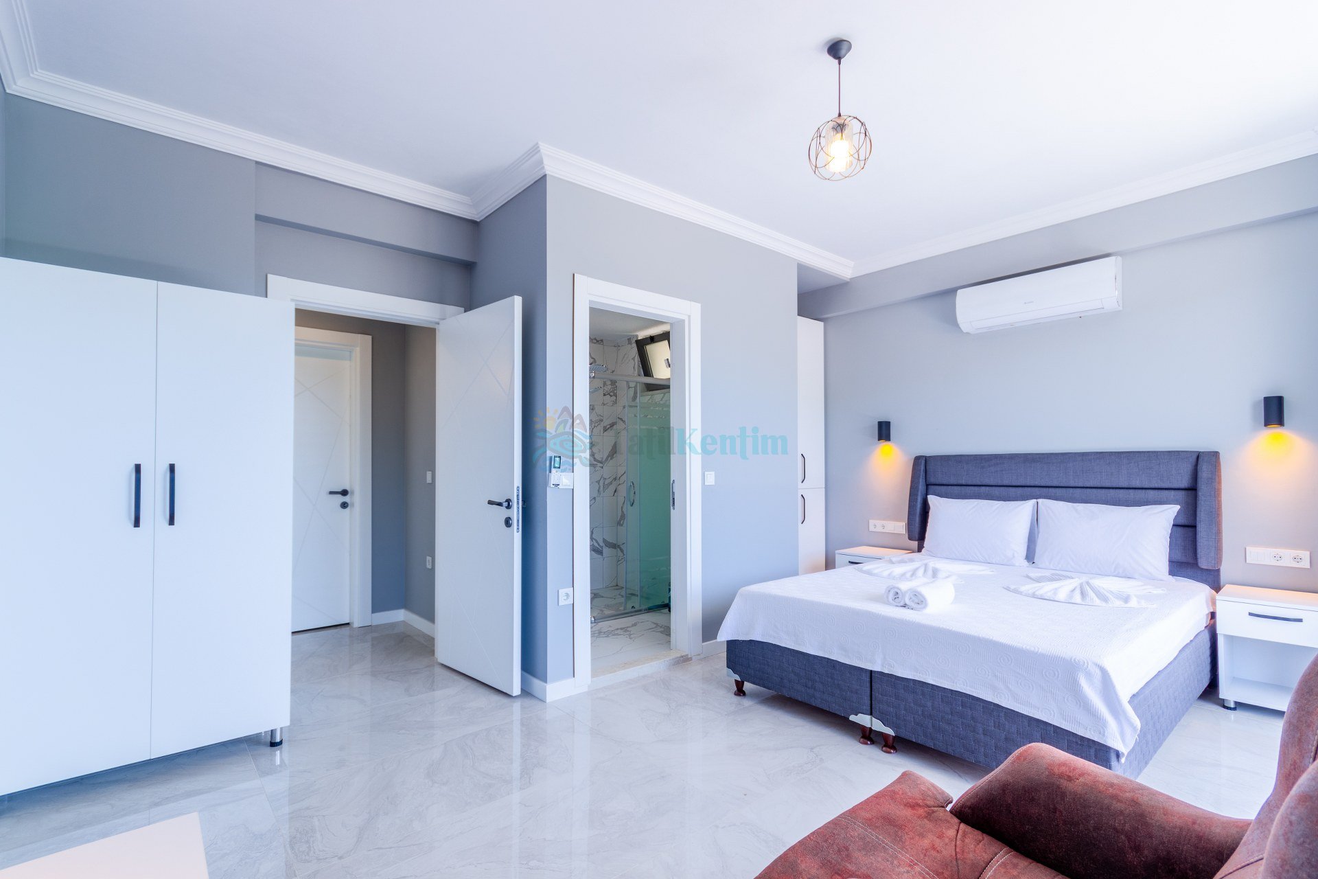 Kiralık villanın bu yatak odası içerisinde, 1 adet çift kişilik yatak, klima, elbise dolabı, komodin, banyo ve tuvalet bulunmaktadır.