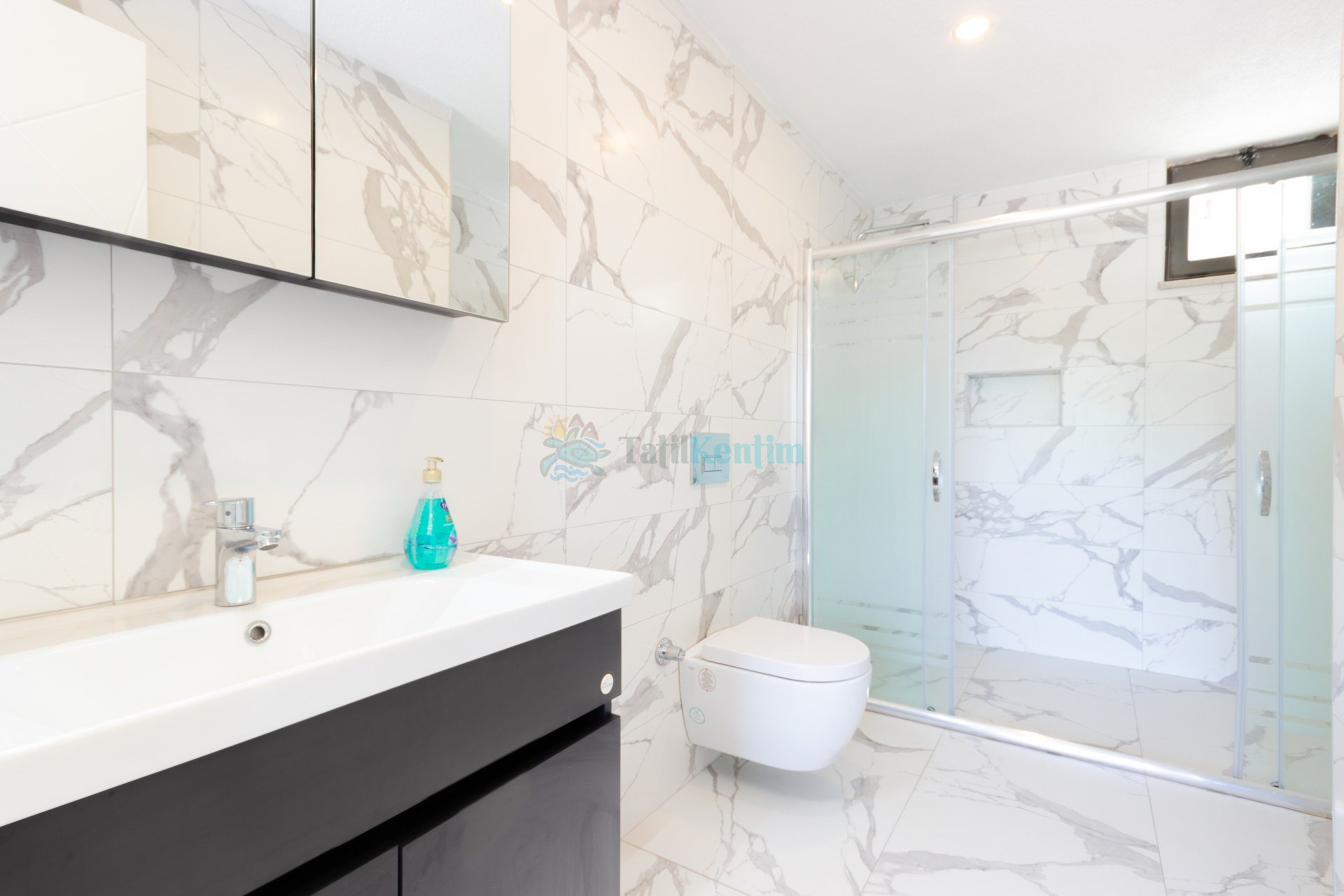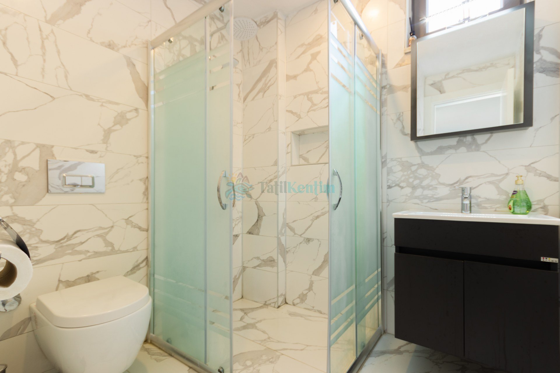 Tatil villamıza ait bu yatak odası içerisinde, 1 adet çift kişilik yatak, klima, elbise dolabı, komodin, banyo ve tuvalet alanları bulunmaktadır.