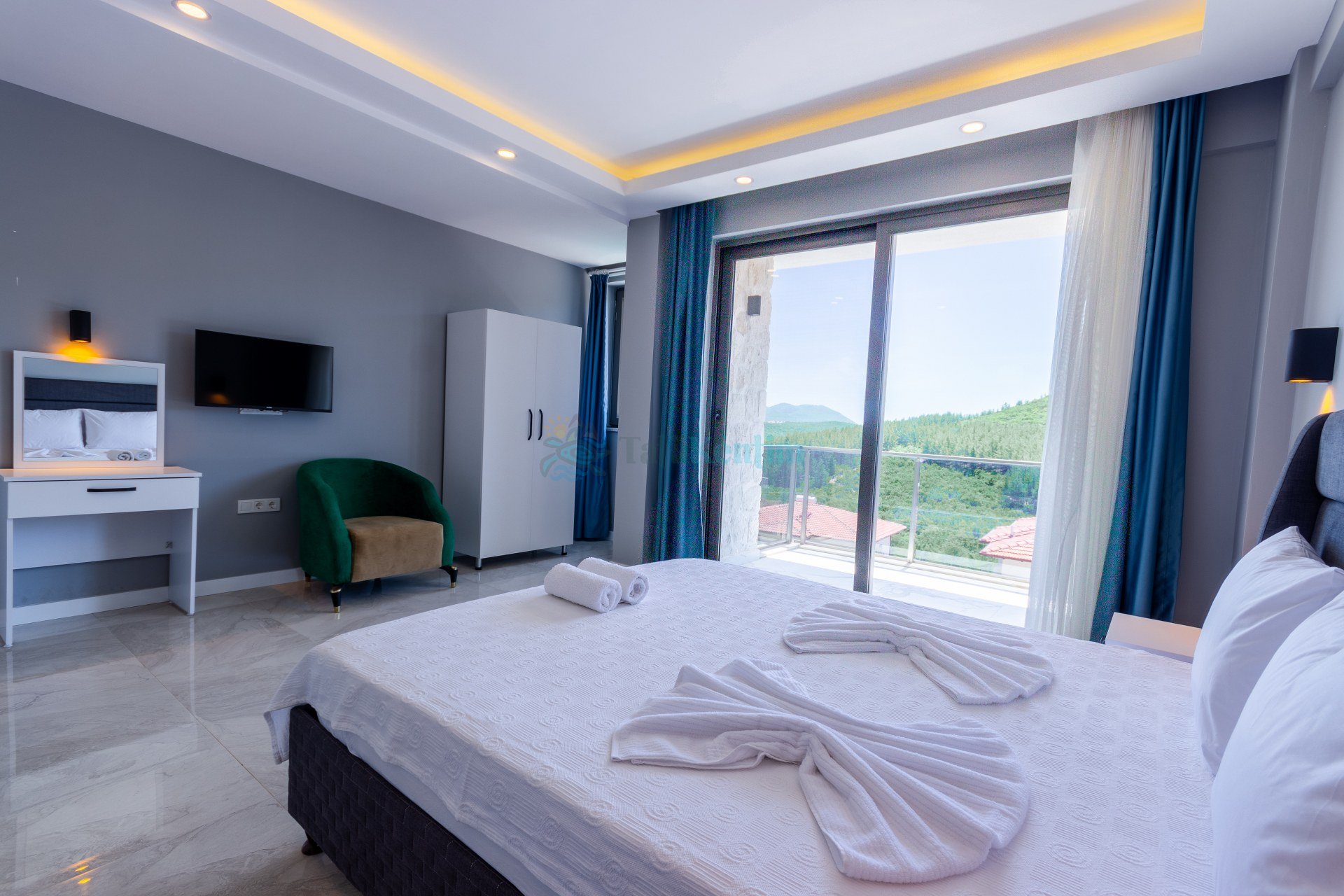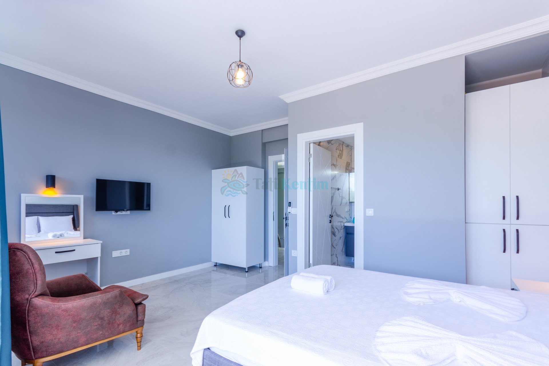 Bu yatak odası içerinde ise 1 adet çift kişilik yatak, klima, elbise dolabı, komodin, banyo, ve tuvalet bulunmaktadır.