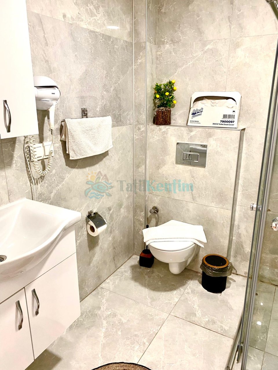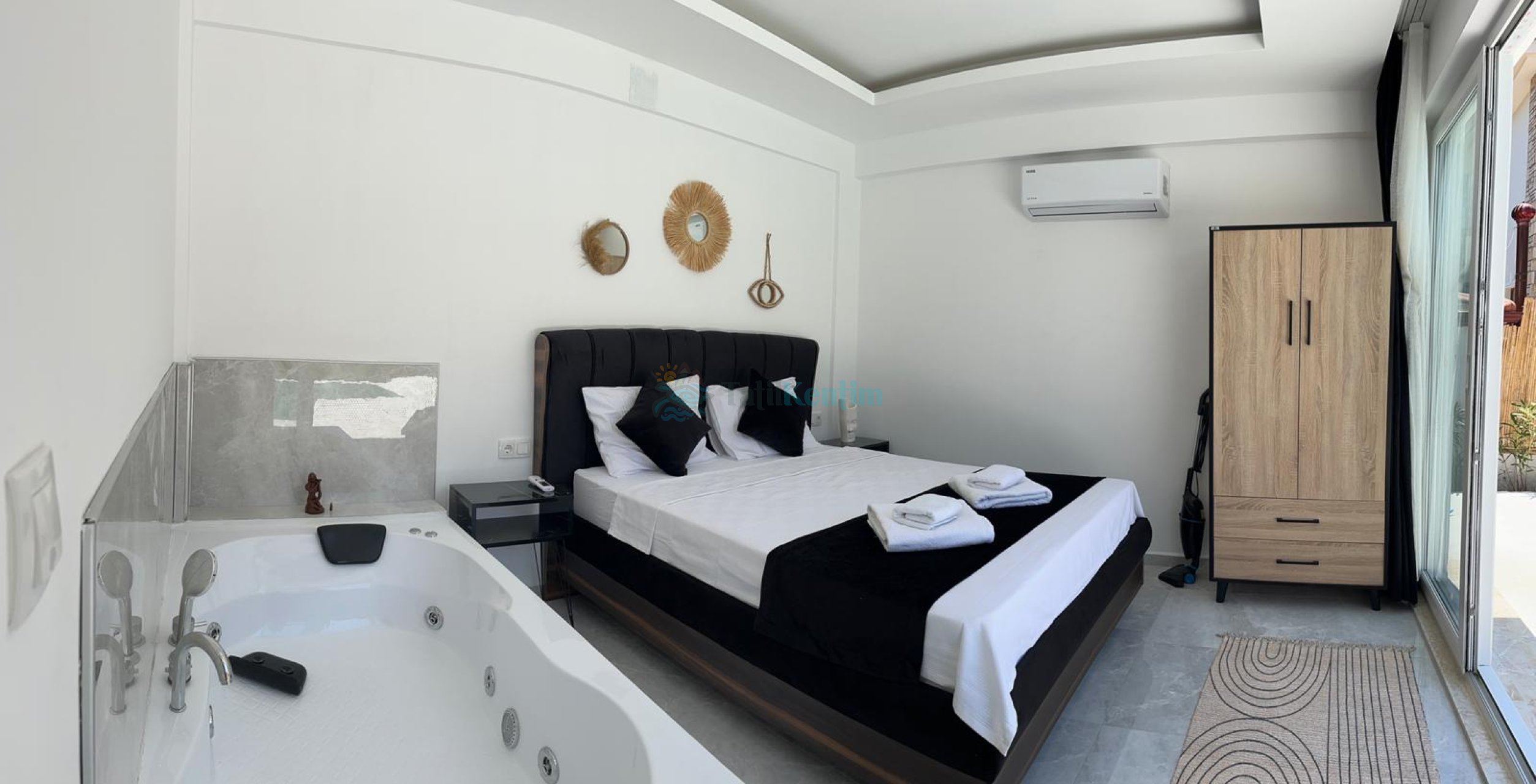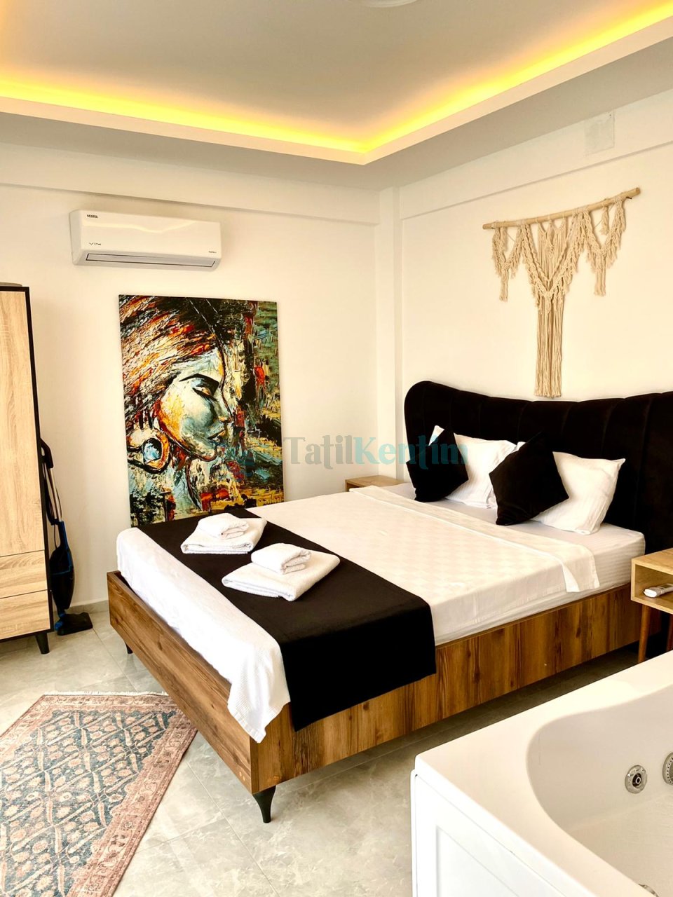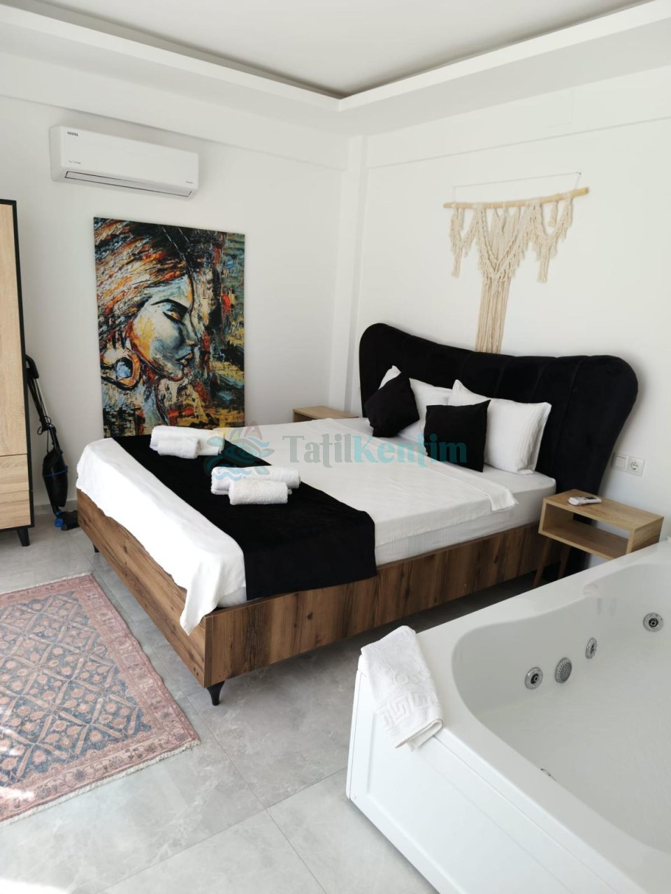 Yatak Odası : 1 adet çift kişilik yatak, jakuzi, klima, elbise dolabı, komodin, banyo ve tuvalet bulunmaktadır. Terasa çıkış mevcuttur