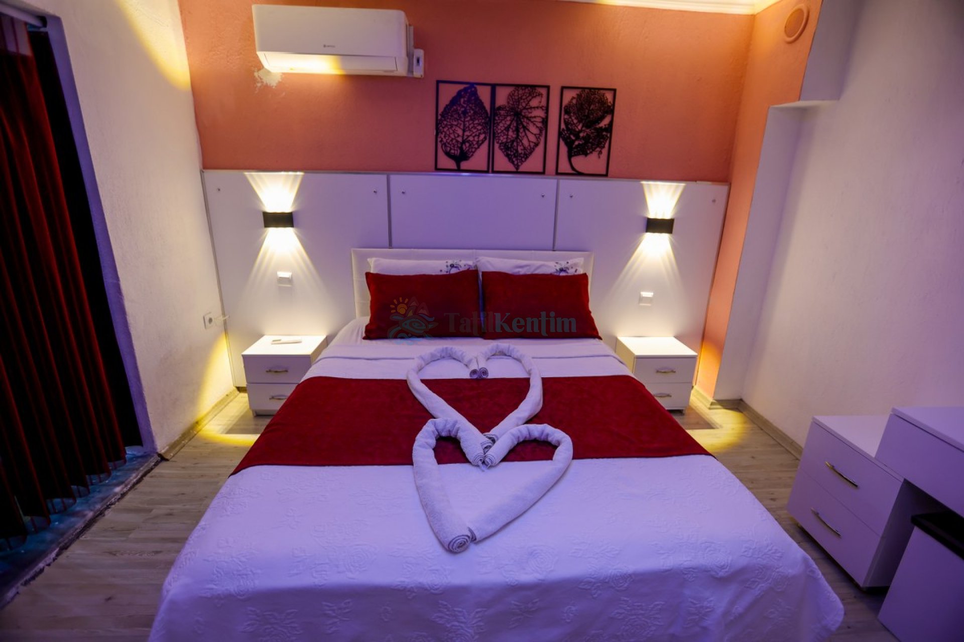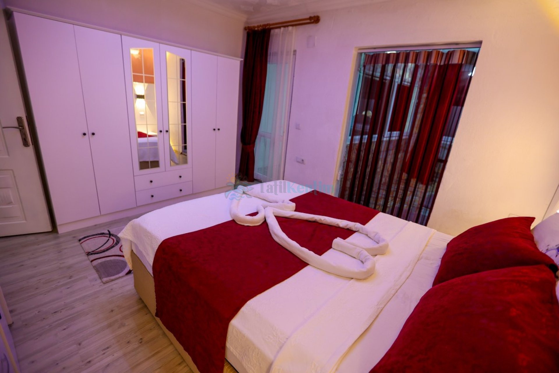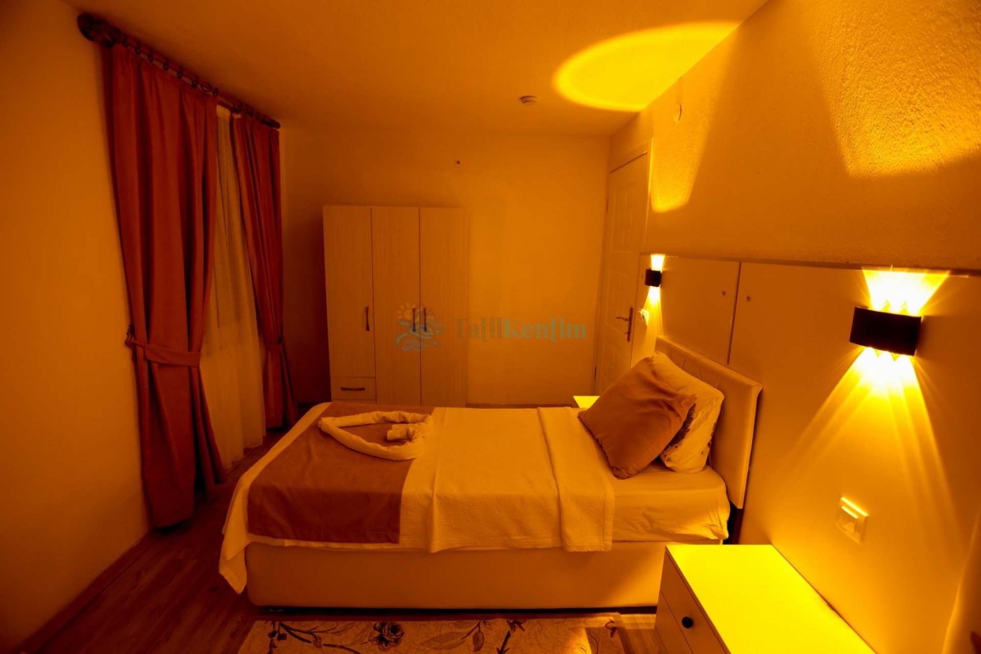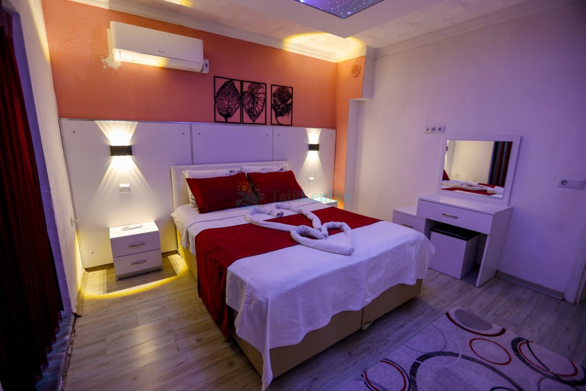 1.Yatak odası: Yatak odası içerisinde, 1 adet çift kişilik yatak, klima, elbise dolabı, komodin, makyaj masası, banyo ve tuvalet yer almaktadır.