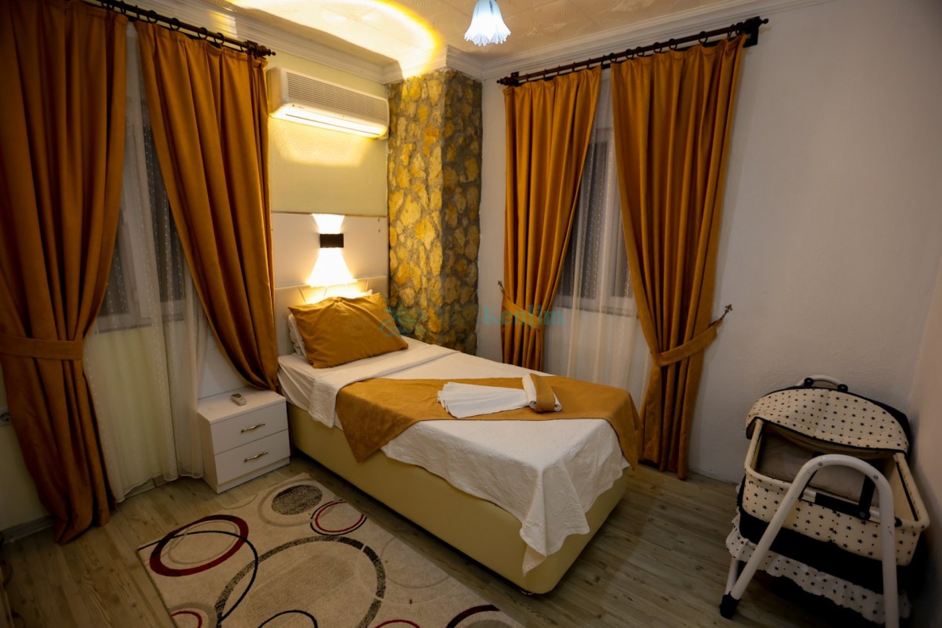 2.Yatak odası: Yatak odası içerisinde, 2 adet tek kişilik yatak, klima, elbise dolabı, komodin, makyaj masası, banyo ve tuvalet yer almaktadır.