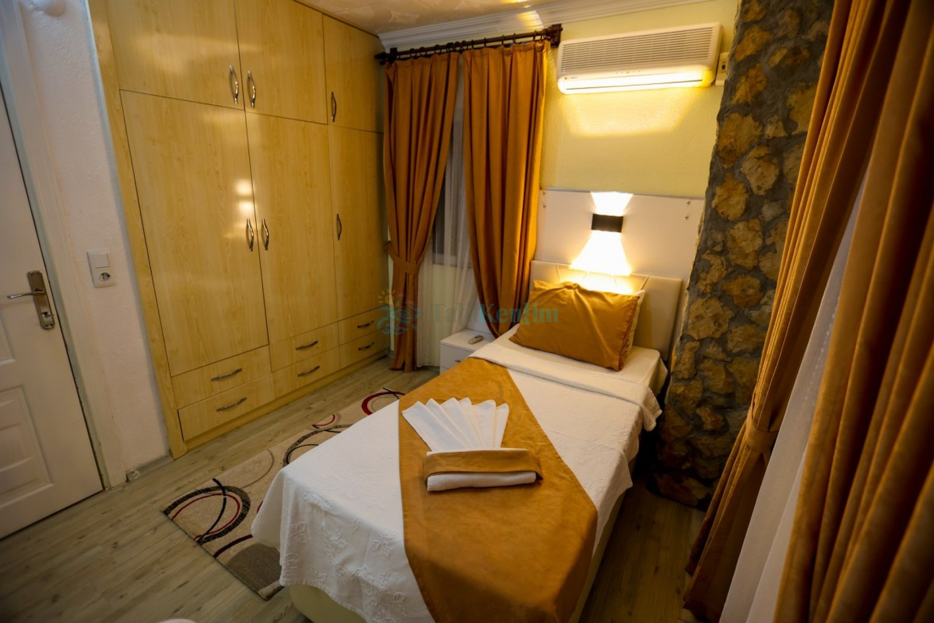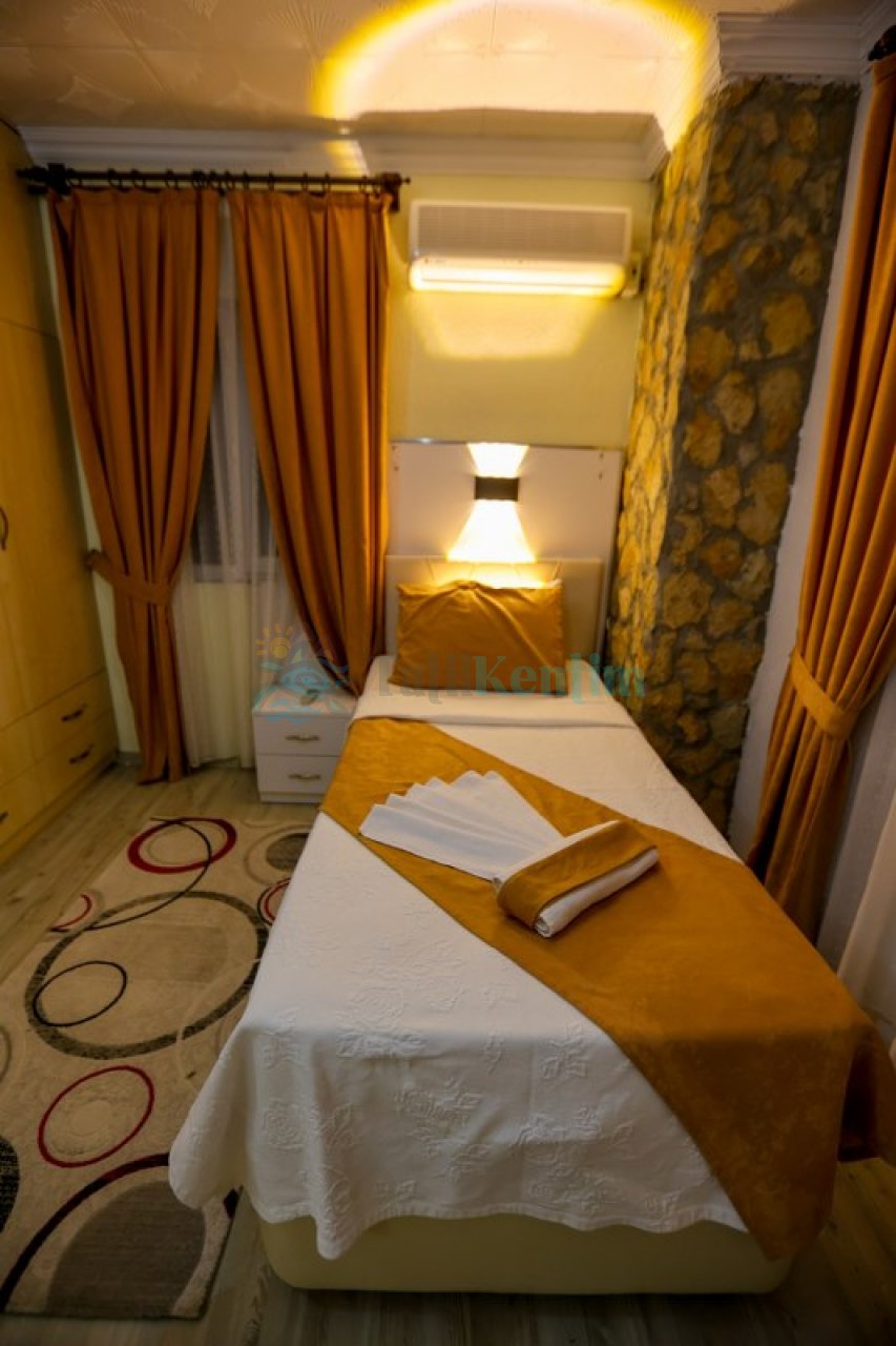 5.Yatak odası: Yatak odası içerisinde, 1 adet tek kişilik yatak, klima, elbise dolabı, komodin, makyaj masası, banyo ve tuvalet yer almaktadır.
