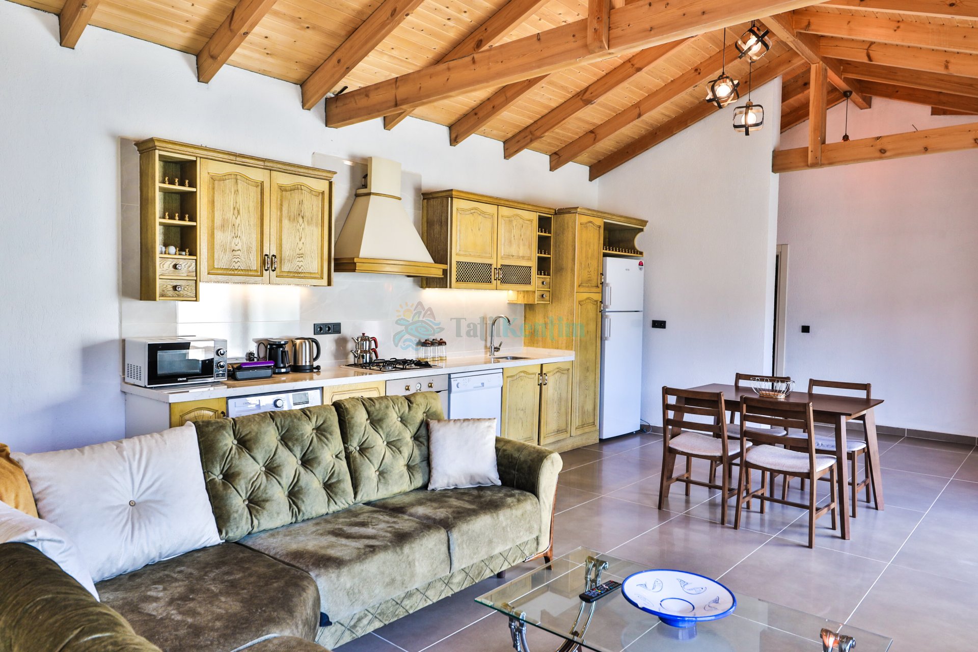 Amerikan mutfak içerisinde, buzdolabı, bulaşık makinası, çamaşır makinası, yemek masası, yemek takımı, ankastre fırın, mikrodalga fırın, tost makinası, ankastre ocak, çaydanlık, su ısıtıcısı, çocuk masası, tava, tencere takımı ve gerekli olan tüm mutfak gereçleri yer almaktadır.