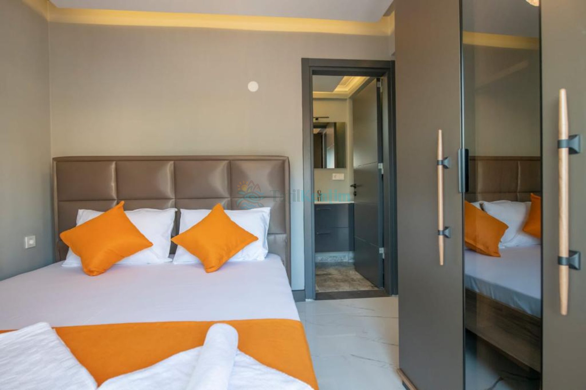 1. Yatak Odası : Çift kişilik bir adet yatak, elbise dolabı, komodin, klima, özel banyo ve tuvalet bulunmaktadır.