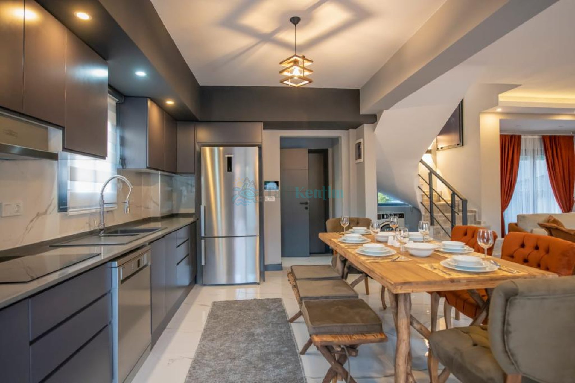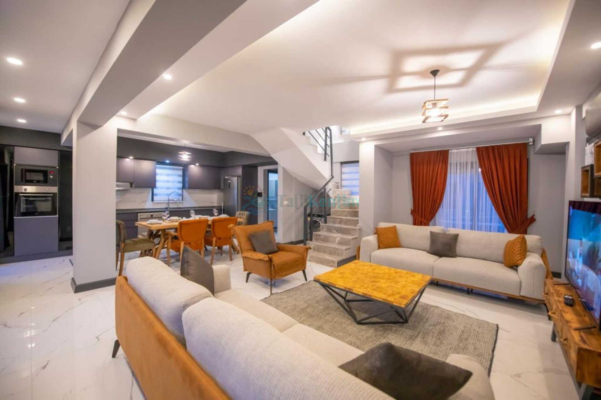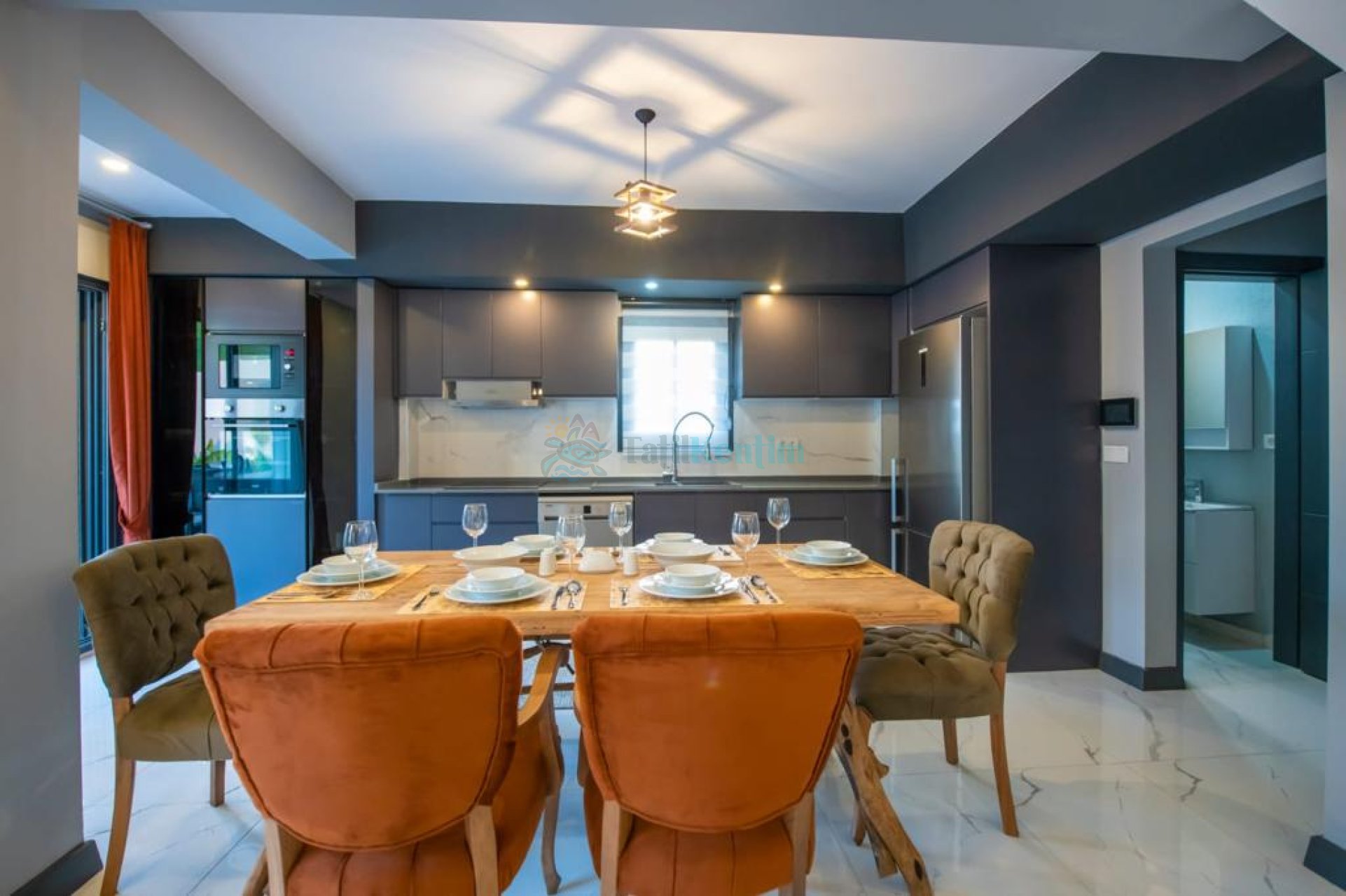 Mutfak : Tam donanımlı modern Amerikan mutfak içerisinde buzdolabı, bulaşık makinesi, fırın, ocak, mikrodalga fırın, tost makinası, elektrikli su ısıtıcı, yemek masası, yemek takımları, çatal ve bıçak takımları, tencere ve tava takımları ve bardaklar bulunmaktadır.