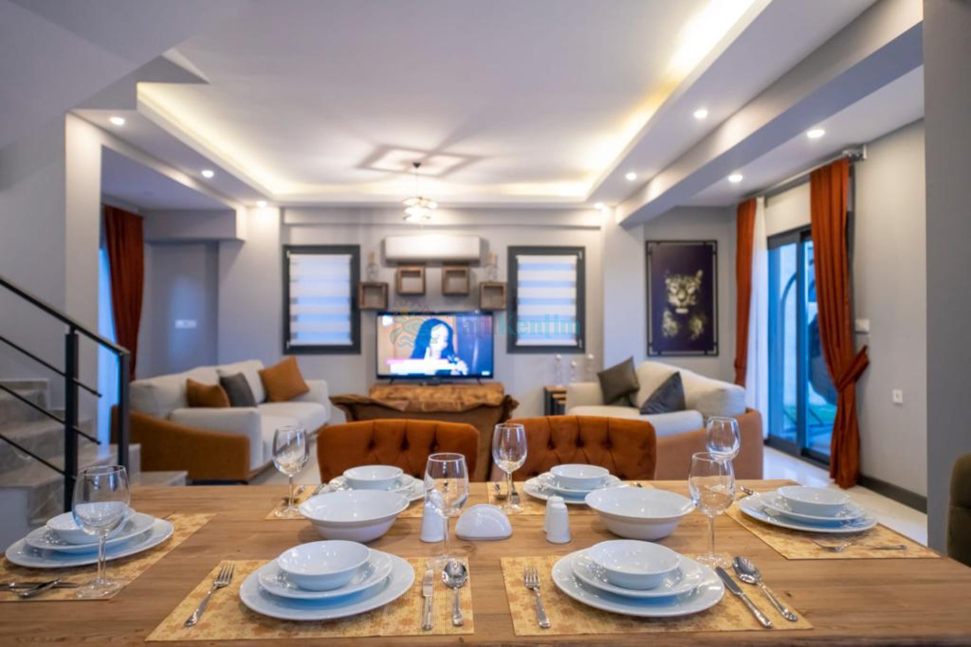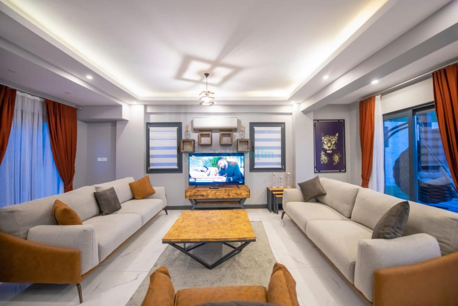 Salon : Konforunuz için tasarlanan manzaralı salonda oturma grubu, TV, klima, sehpa bulunmaktadır. Havuz terasına çıkış vardır.