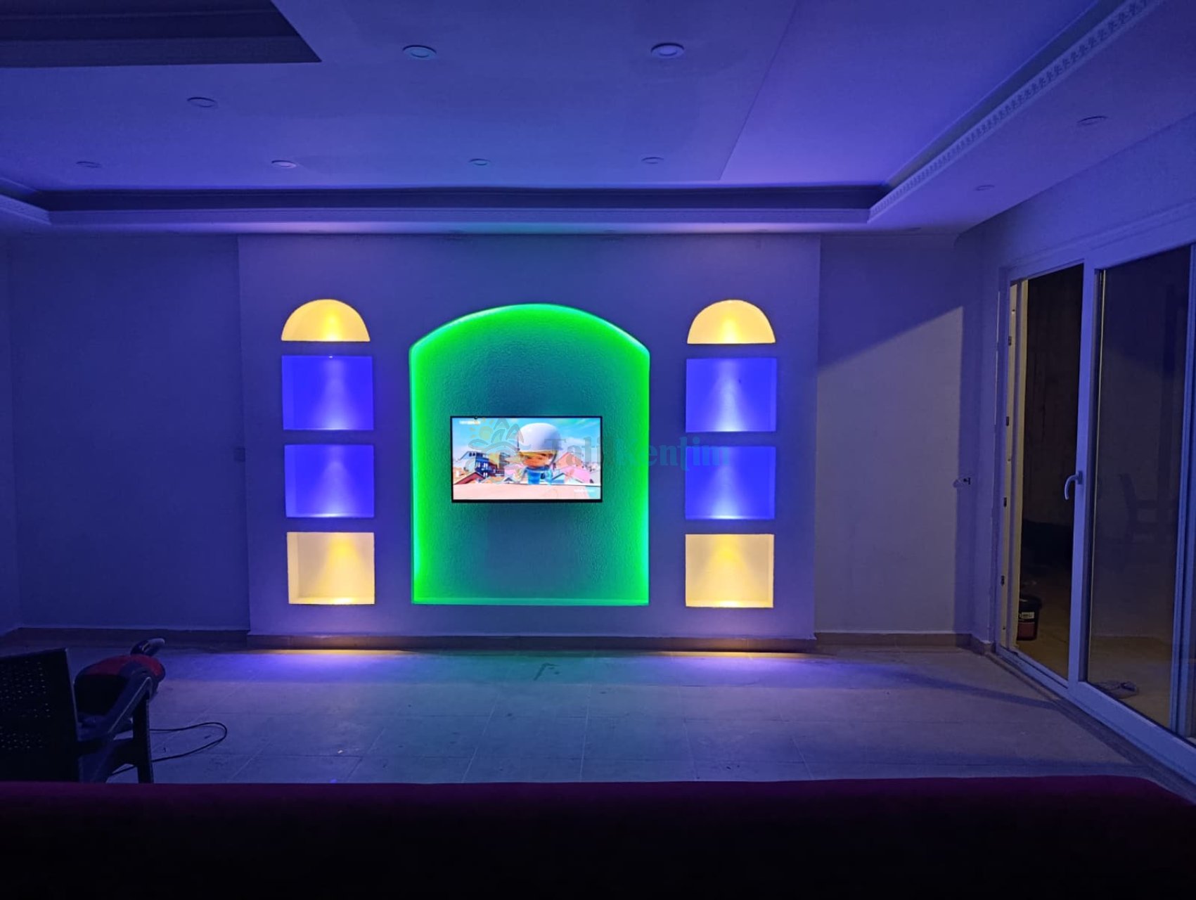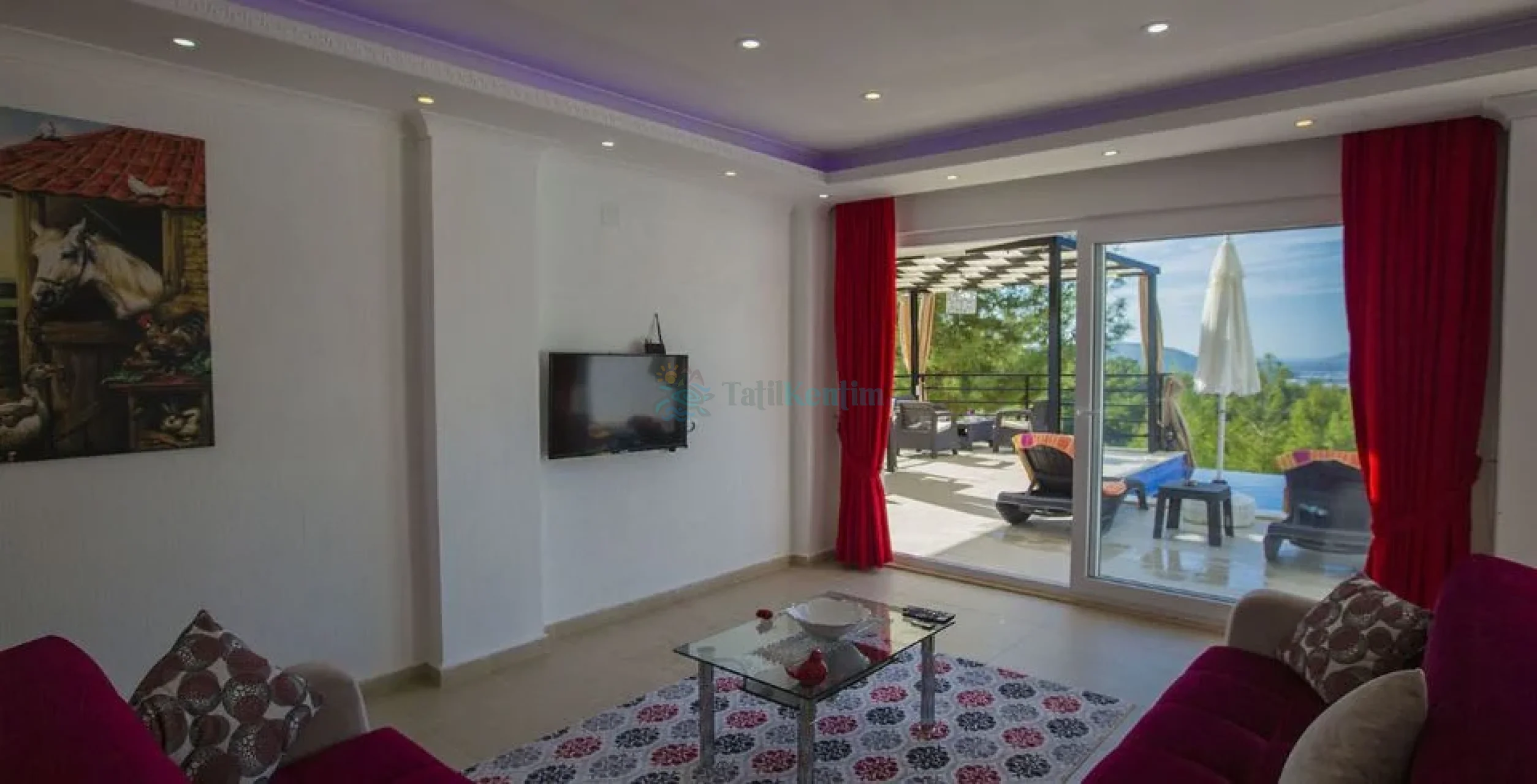 Doğa manzaralı salon içerisinde, koltuk takımı, orta sehpa, TV, TV ünitesi, klima, uydu alıcısı yer almaktadır.
