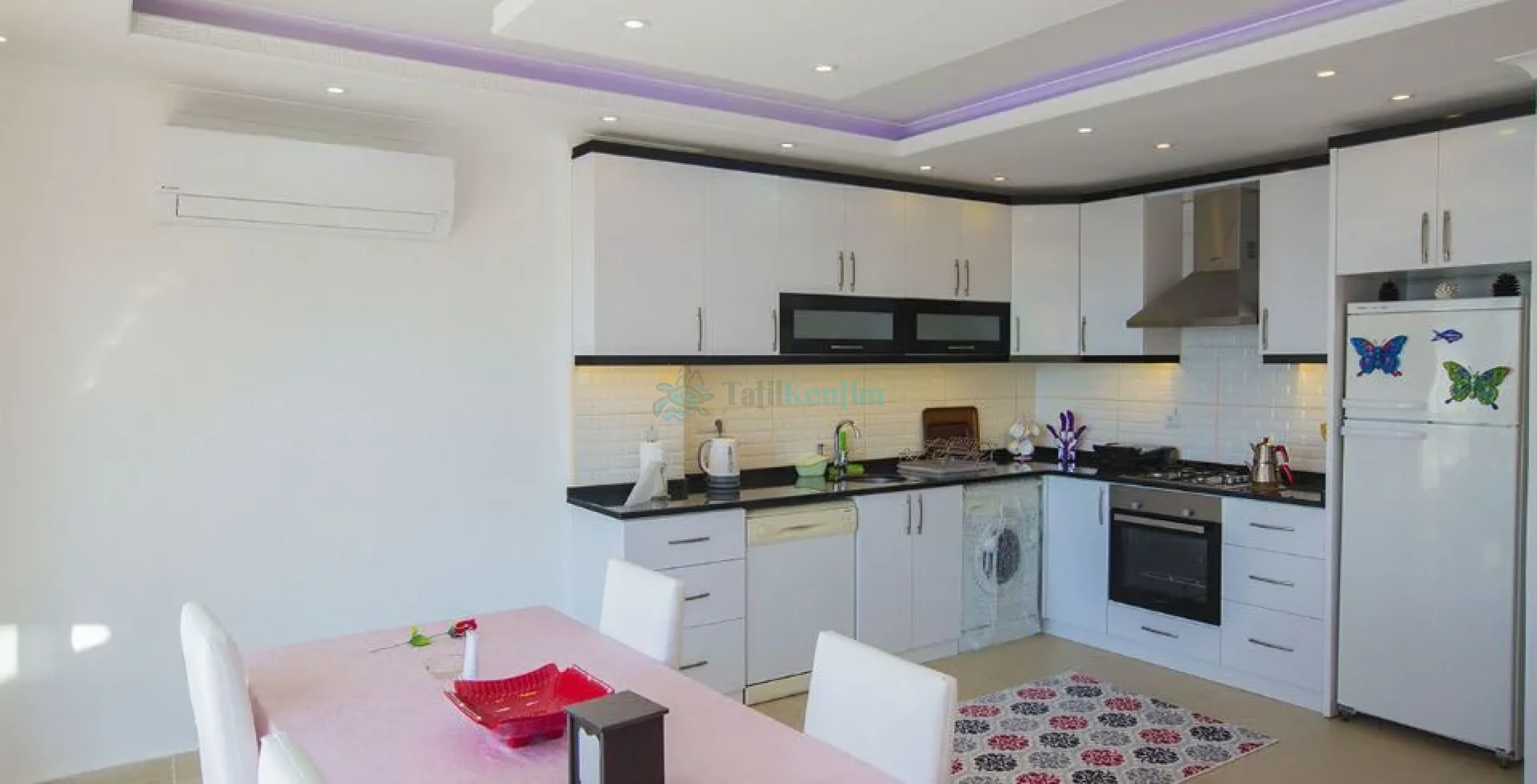 Amerikan mutfak içerisinde, buzdolabı, bulaşık makinası, çamaşır makinası, yemek masası, yemek takımı, ankastre fırın, mikrodalga fırın, tost makinası, ankastre ocak, çaydanlık, su ısıtıcısı, tava, tencere takımı ve gerekli olan tüm mutfak gereçleri yer almaktadır.