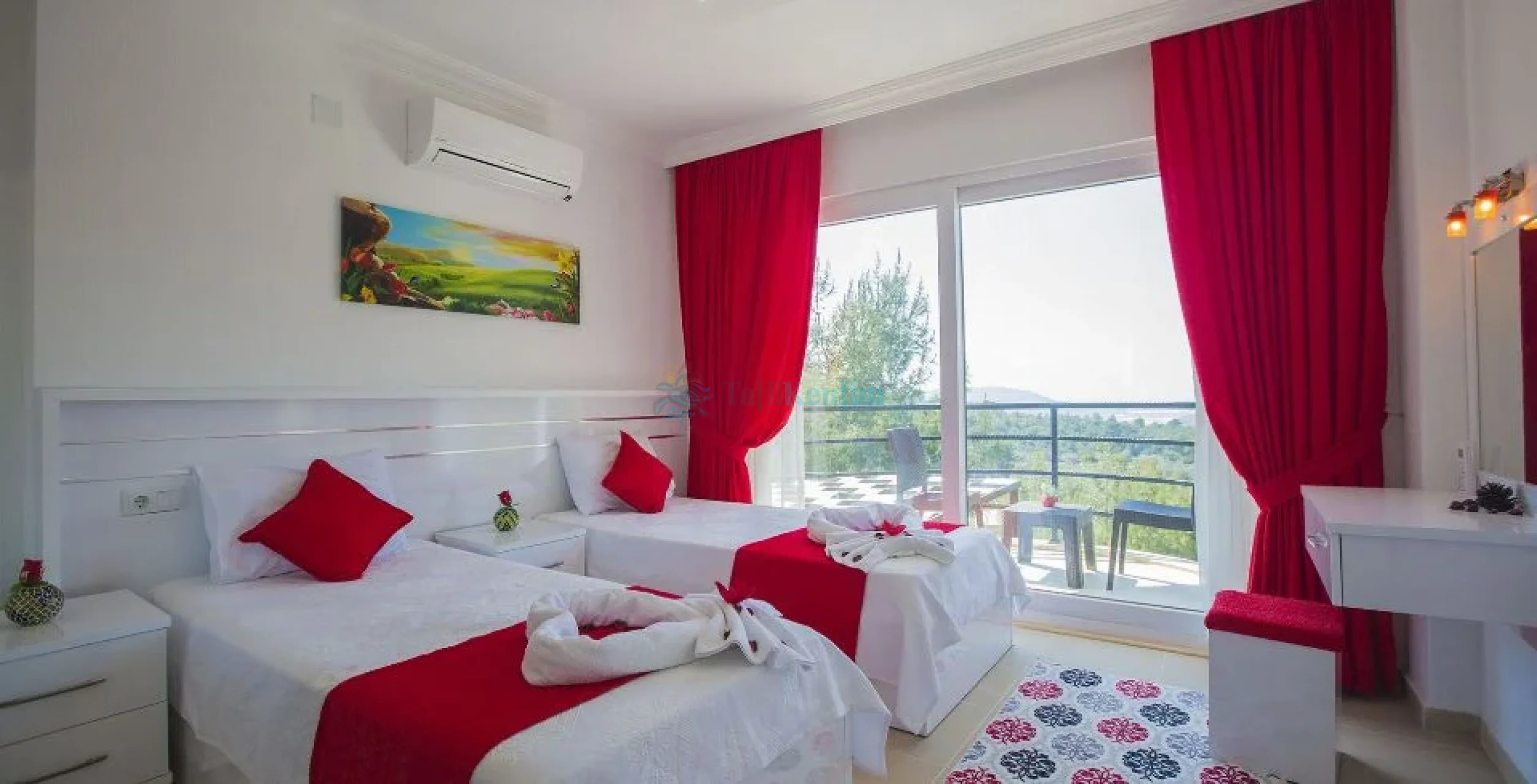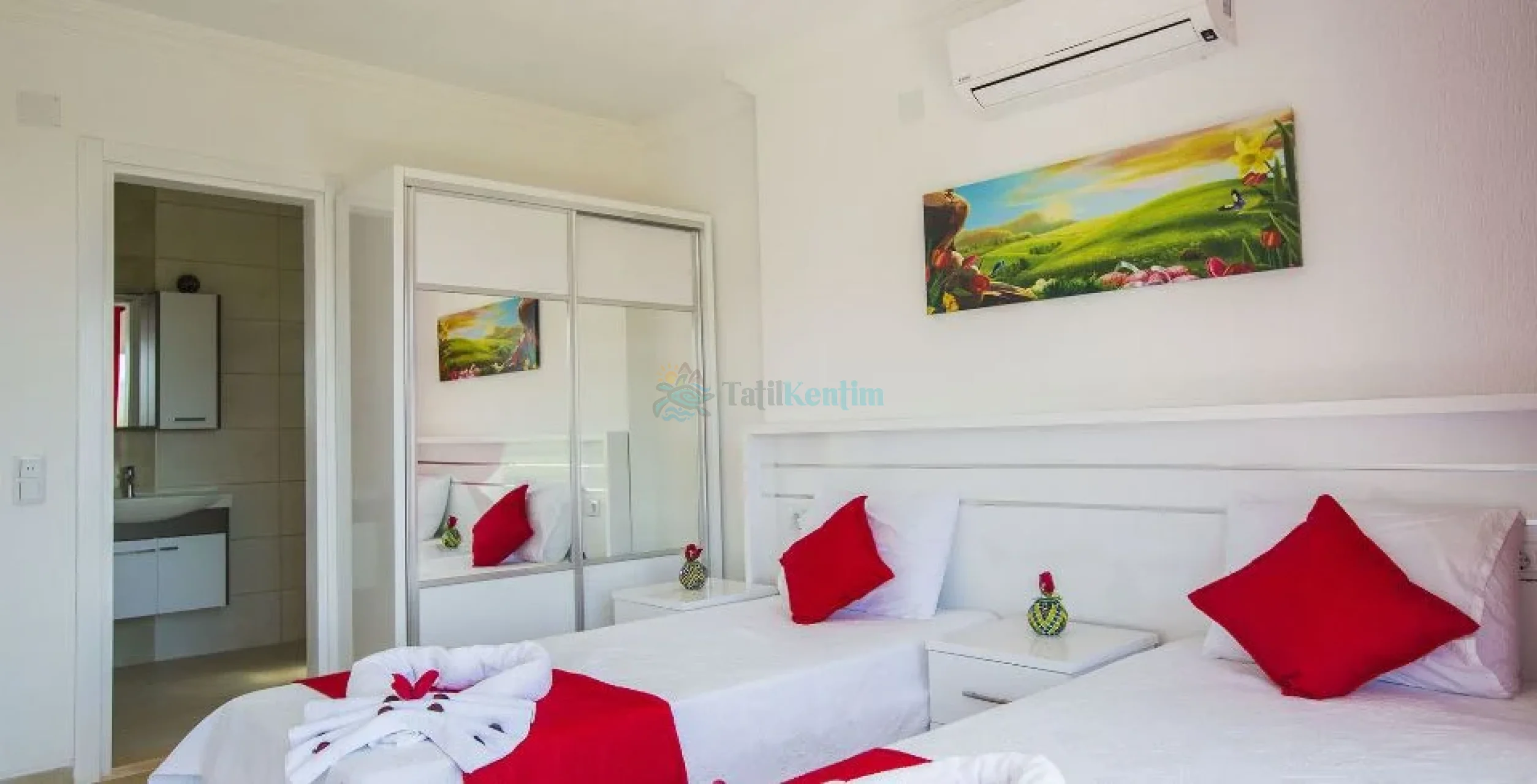 Yatak odası içerisinde, 2 adet tek kişilik yatak, klima, elbise dolabı, komodin, makyaj masası, banyo ve tuvalet yer almaktadır.
