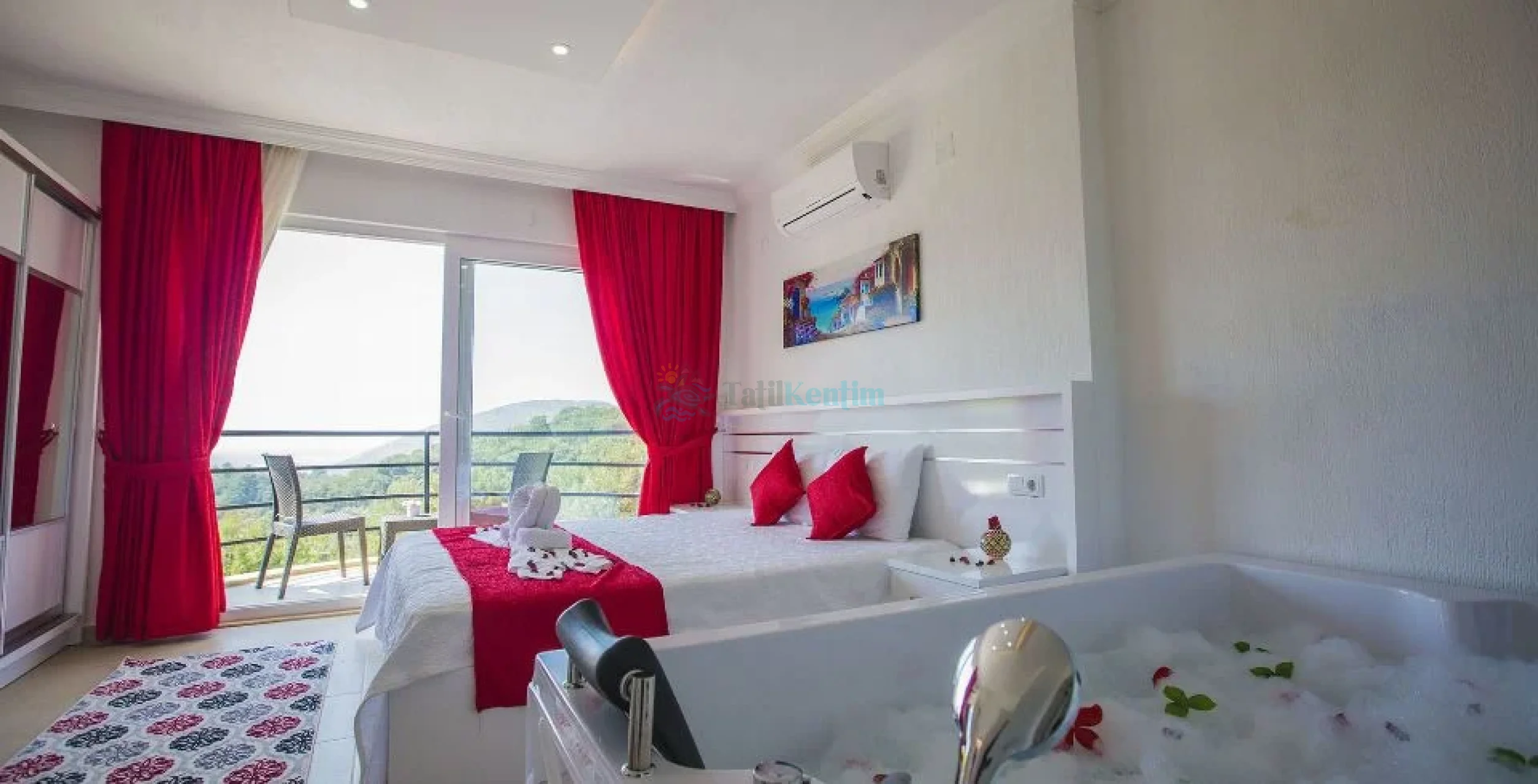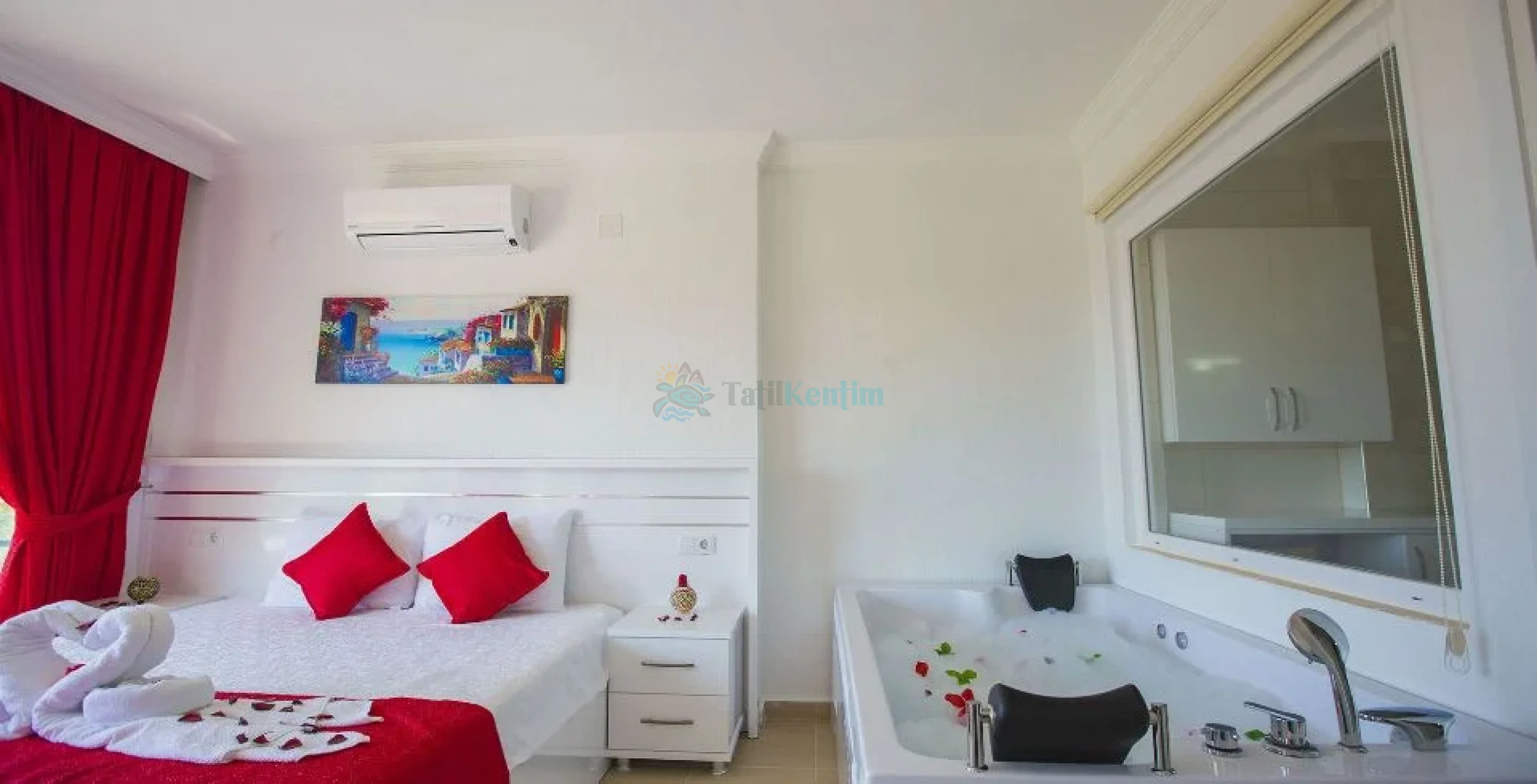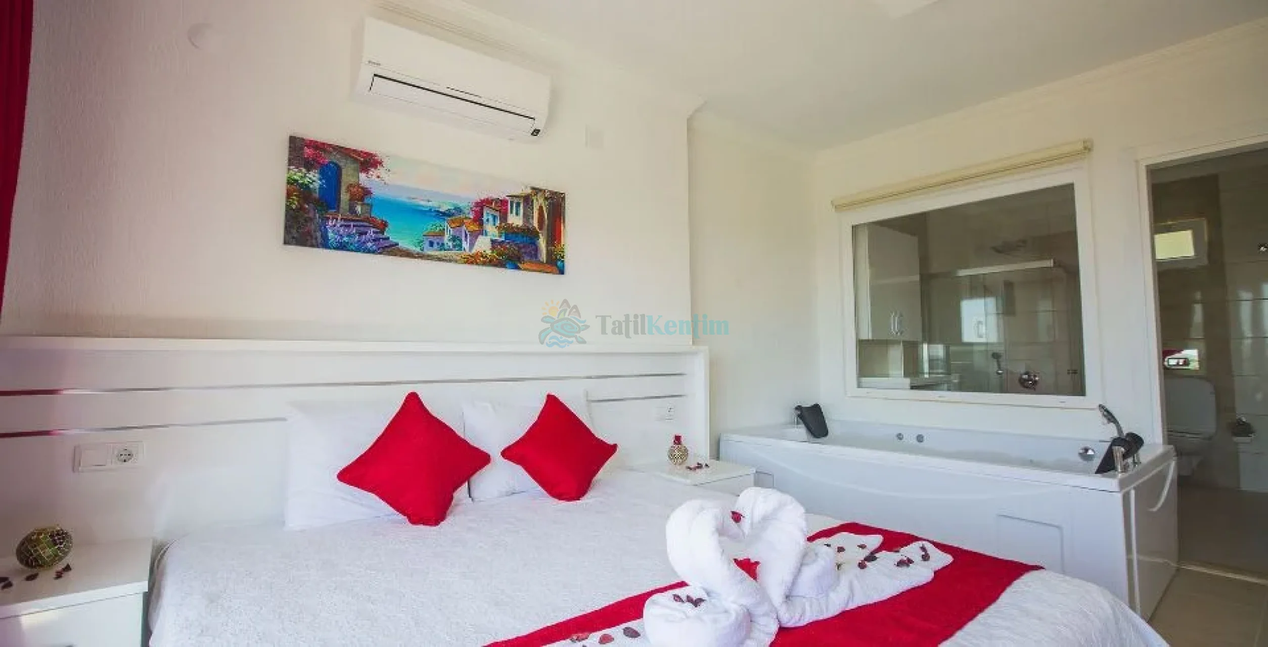 Yatak odası içerisinde, 1 adet çift kişilik yatak, klima, elbise dolabı, komodin, makyaj masası, jakuzi, banyo ve tuvalet yer almaktadır.