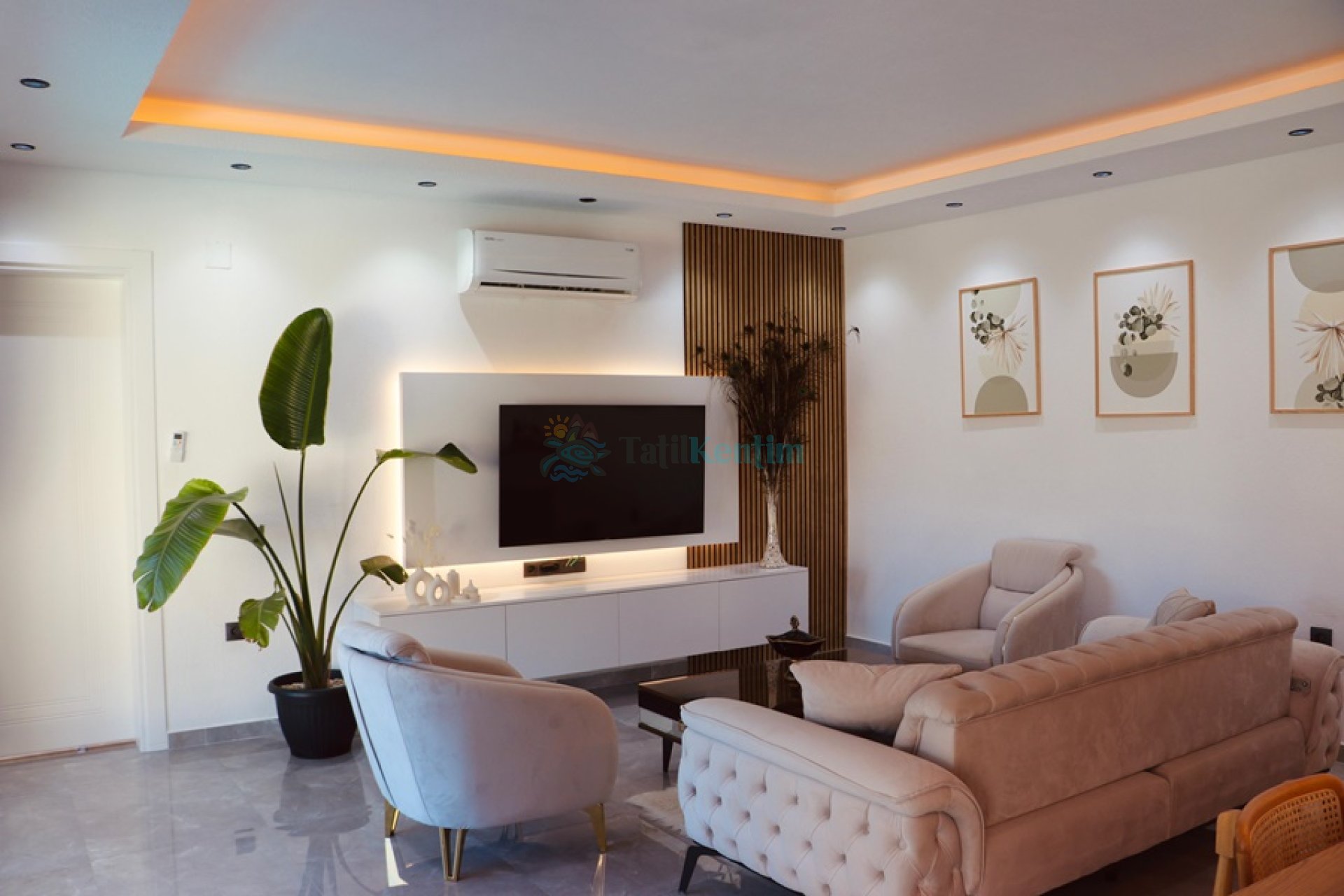 Villamızın salonu içerisinde, koltuk takımı, orta sehpa, TV, TV ünitesi, klima, uydu alıcısı yer almaktadır.