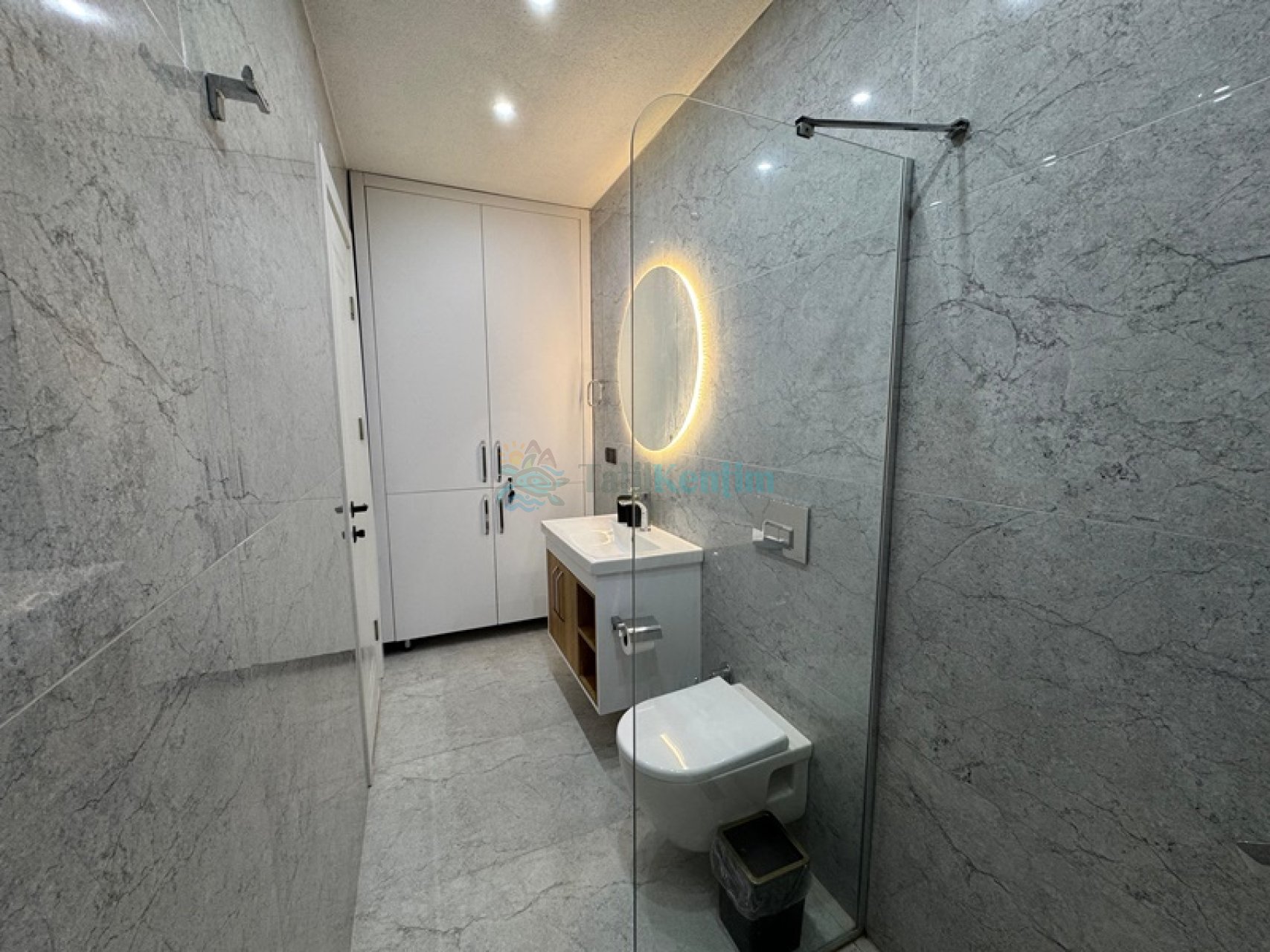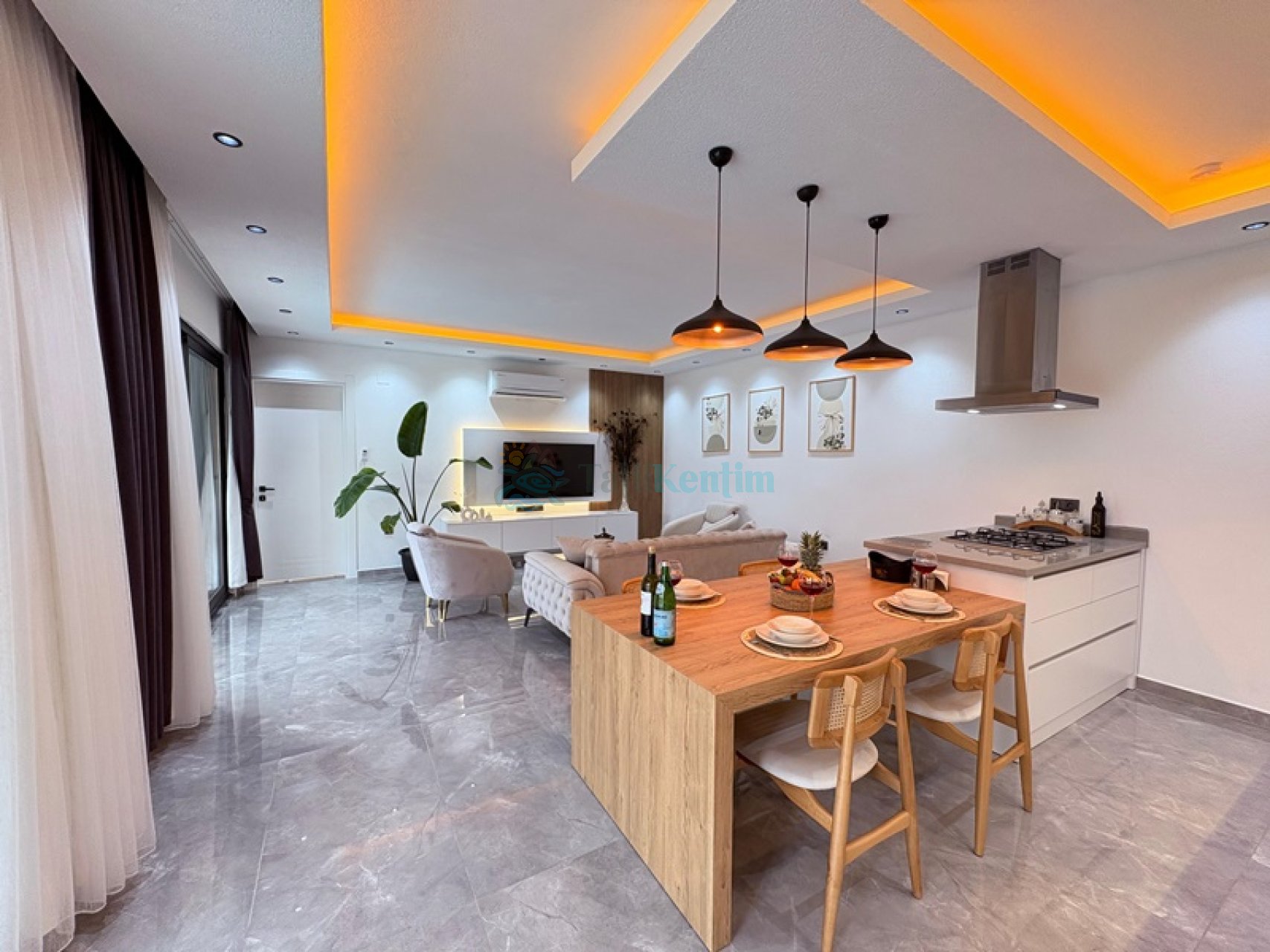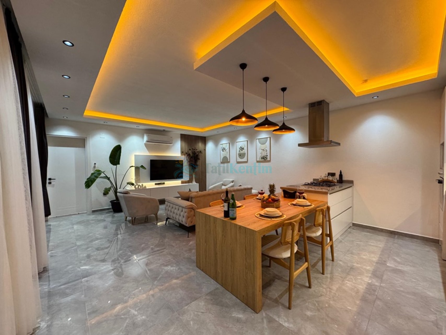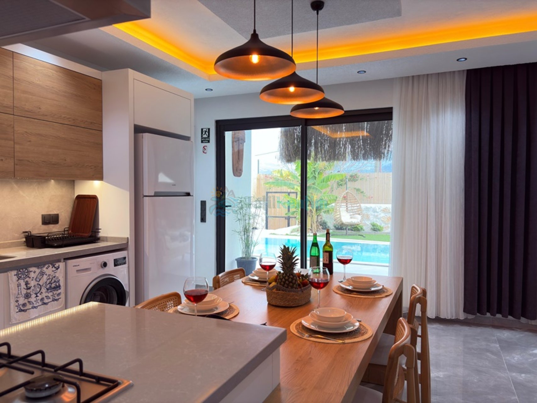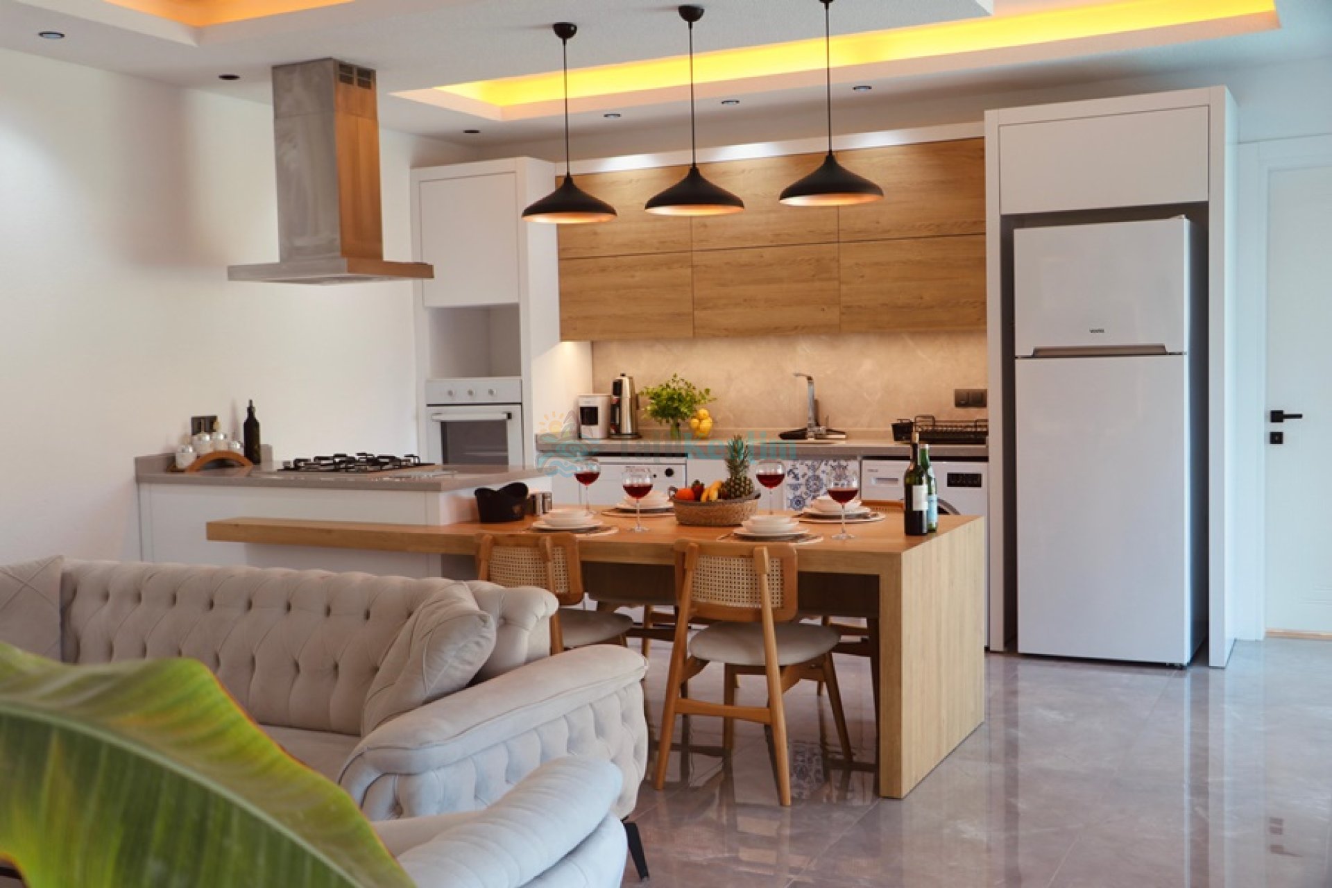 Amerikan mutfak içerisinde, buzdolabı, bulaşık makinası, çamaşır makinası, yemek masası, yemek takımı, ankastre fırın, tost makinası, ankastre ocak, çaydanlık, su ısıtıcısı, tava, tencere takımı ve gerekli olan tüm mutfak gereçleri yer almaktadır.