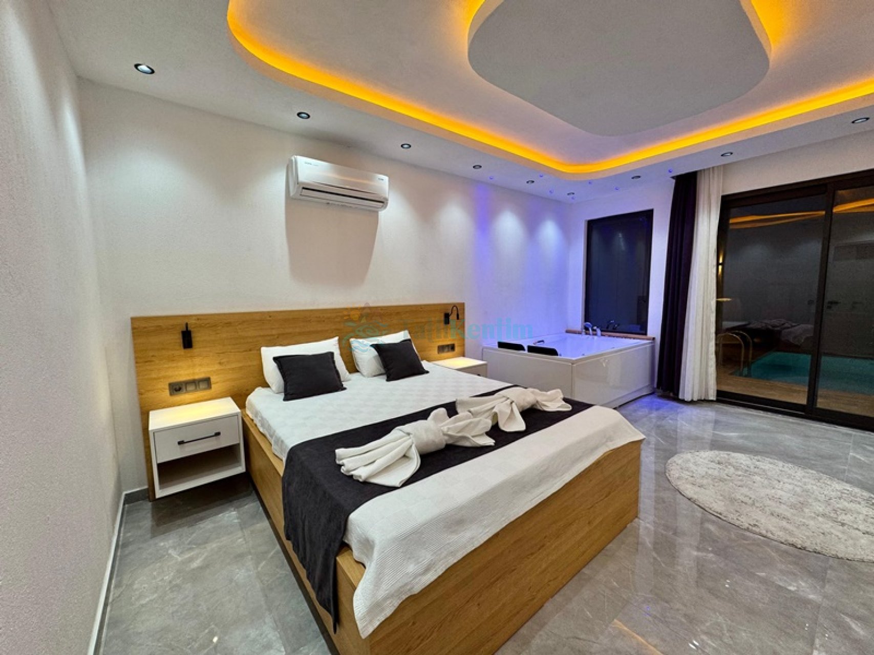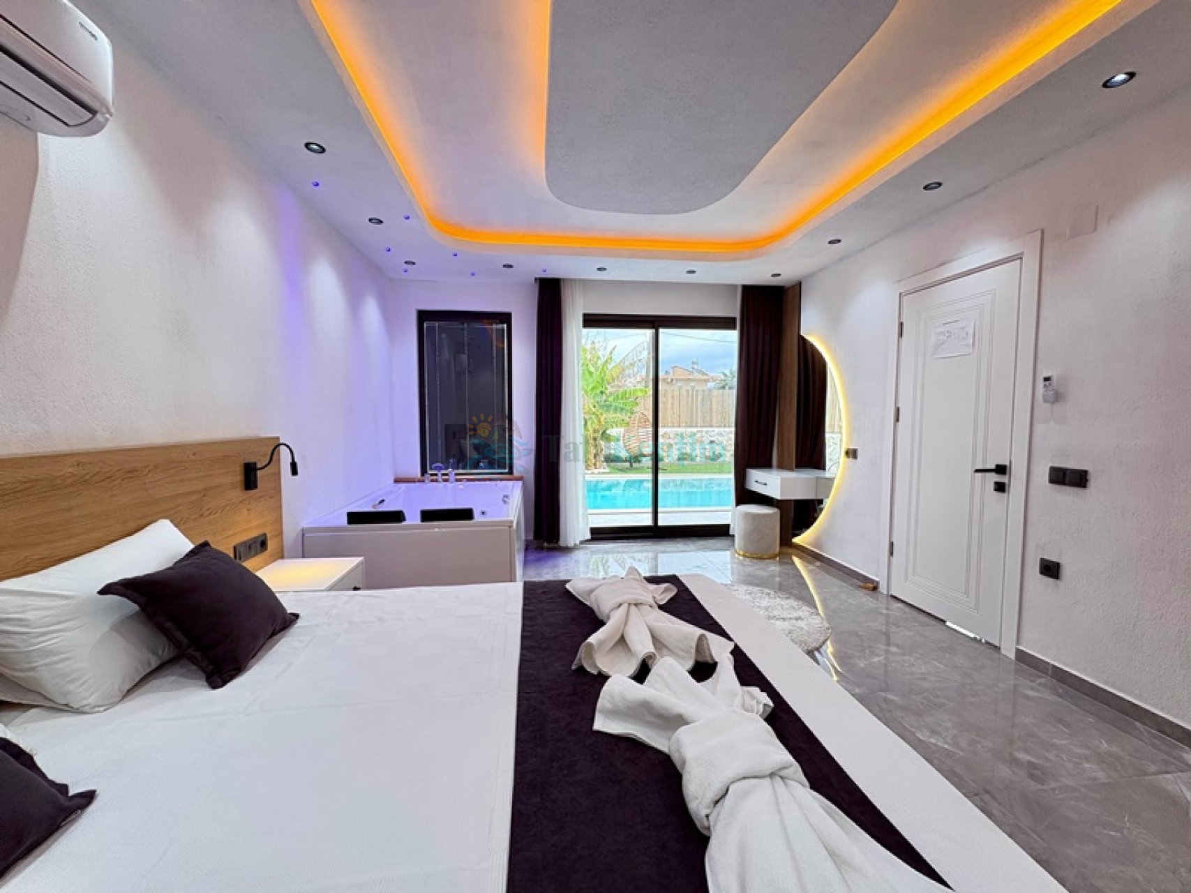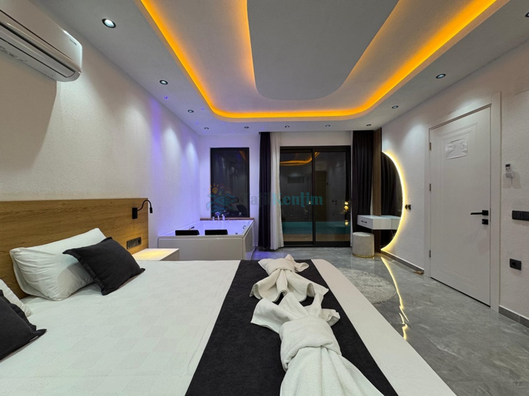 Yatak odası içerisinde, 1 adet çift kişilik yatak, klima, elbise dolabı, komodin, makyaj masası, jakuzi, banyo ve tuvalet yer almaktadır.