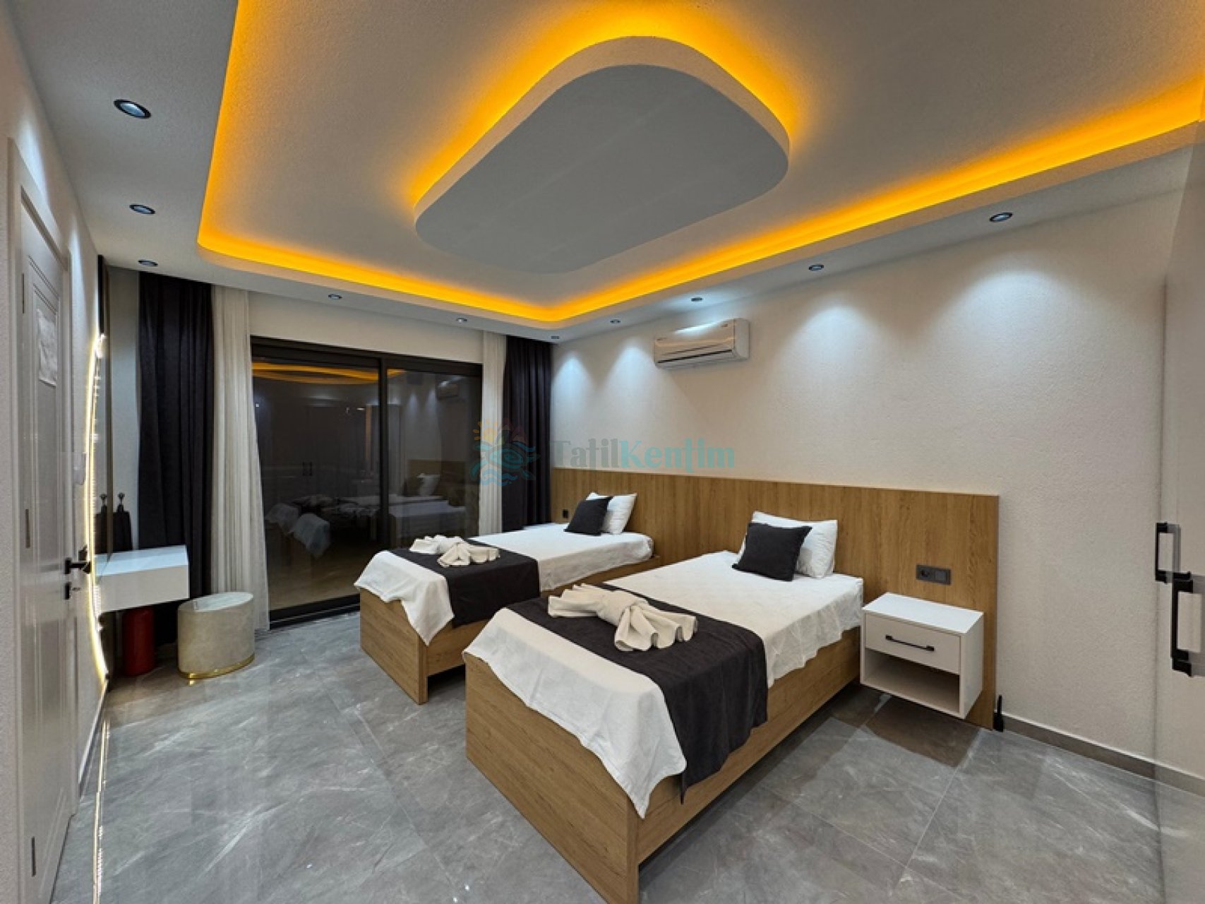 Yatak odası içerisinde, 2 adet tek kişilik yatak, klima, elbise dolabı, komodin, makyaj masası, banyo ve tuvalet yer almaktadır.